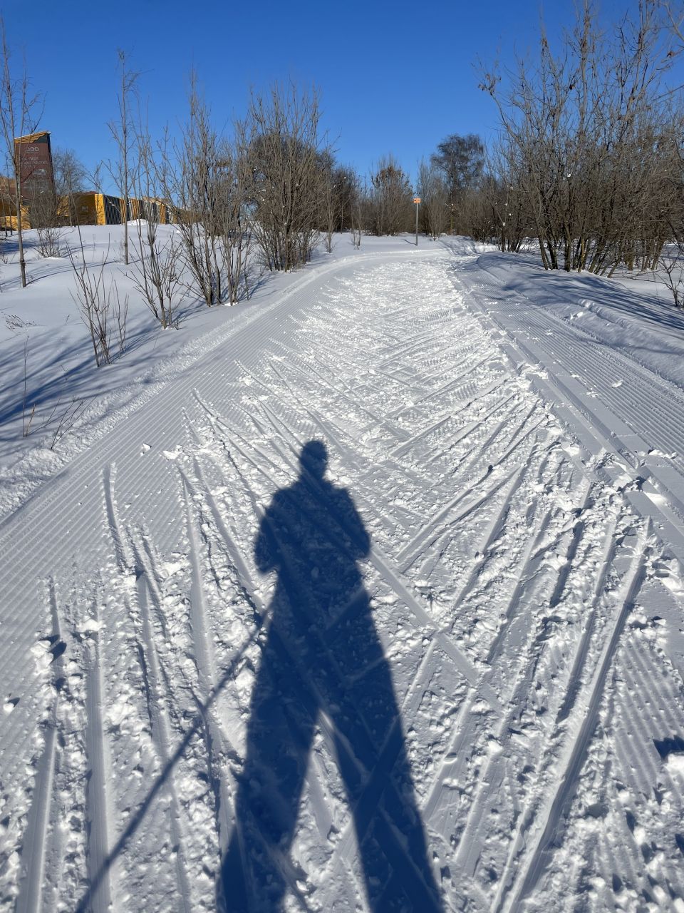 Каталась 30.01 днем. Незадолго до меня по всему кругу 7,5 км прошел ратрак. Трасса была мягкая, на поворотах после спусков уже разрытая, так что лыжи периодически закапывались.