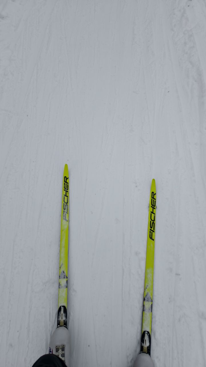 Катались примерно с 11:00 до 12:30. Снега много, ратрак укатывал трассу после вчерашнего снегопада. Лыжников много, на подъёме уже немного снежная каша была.
