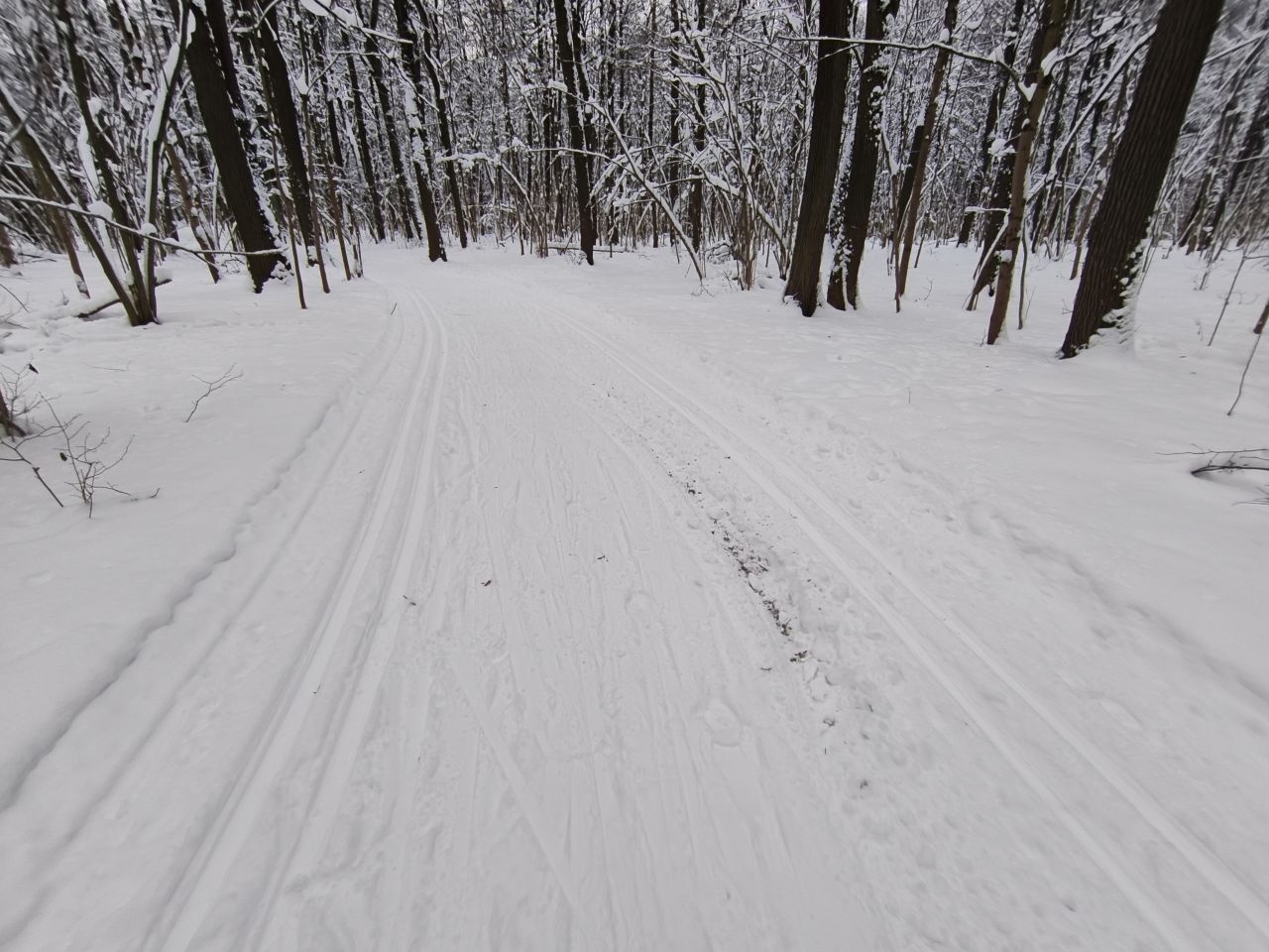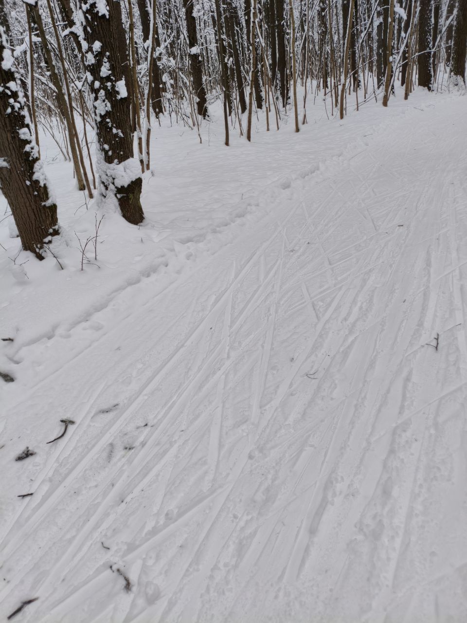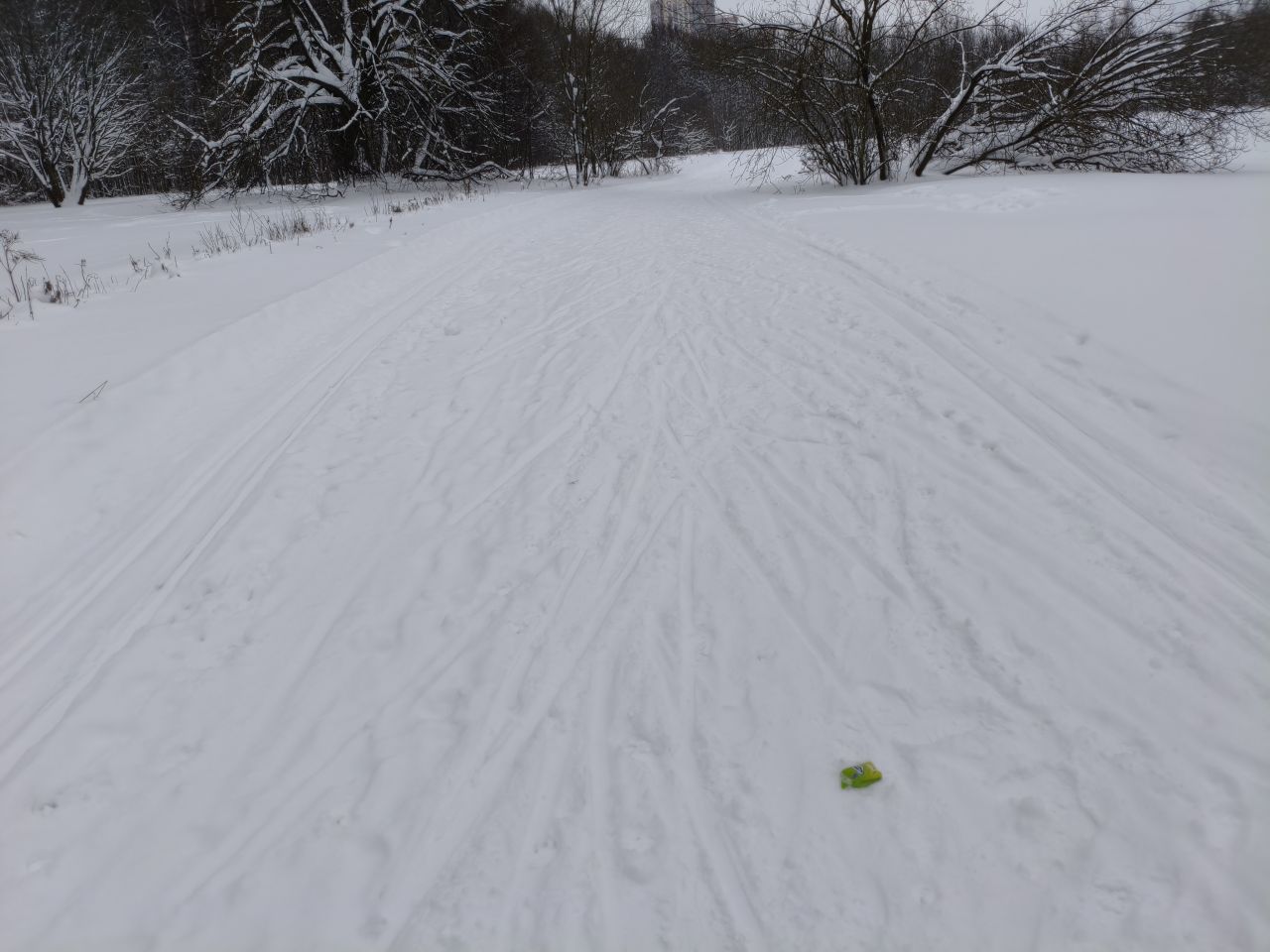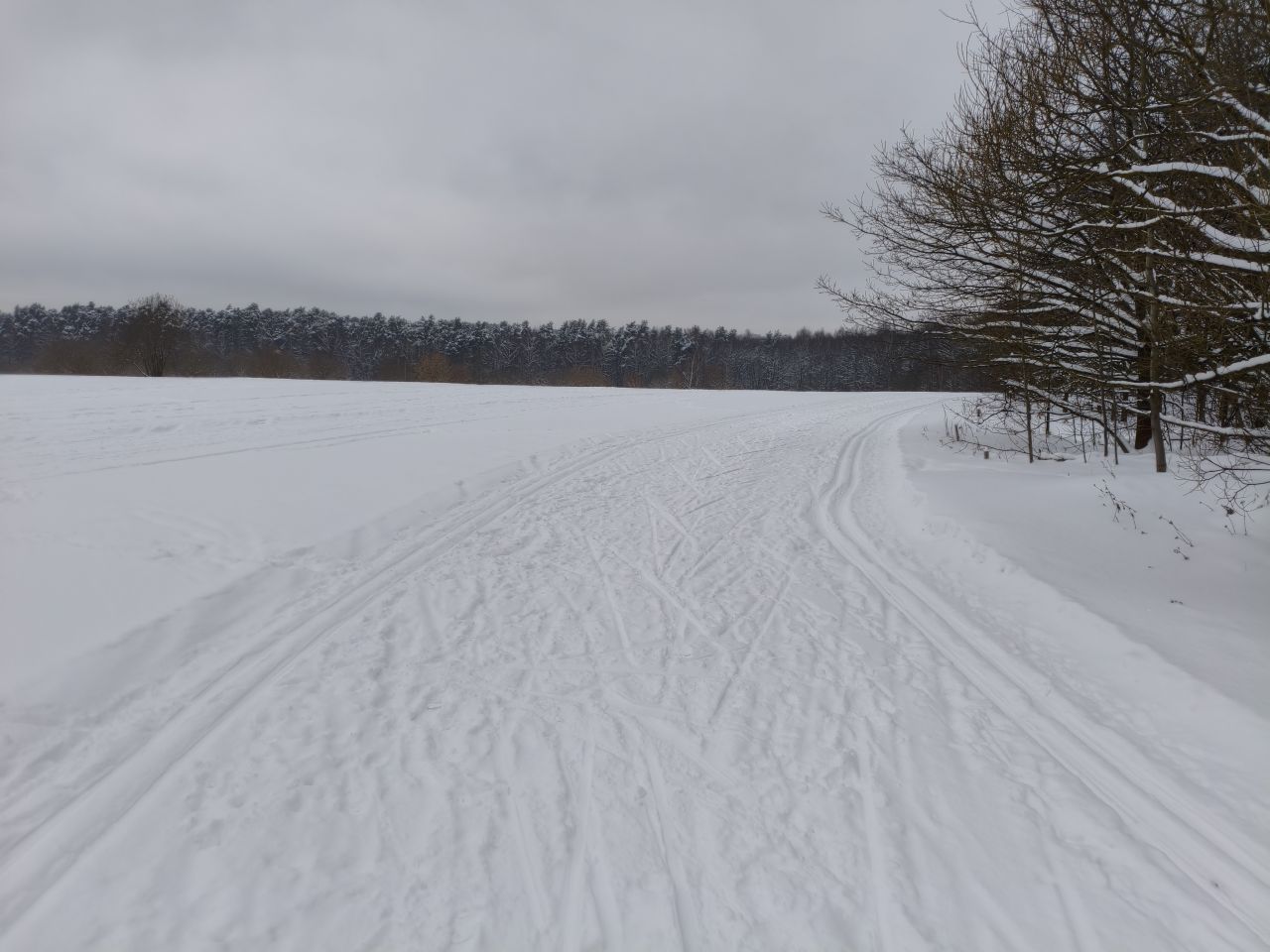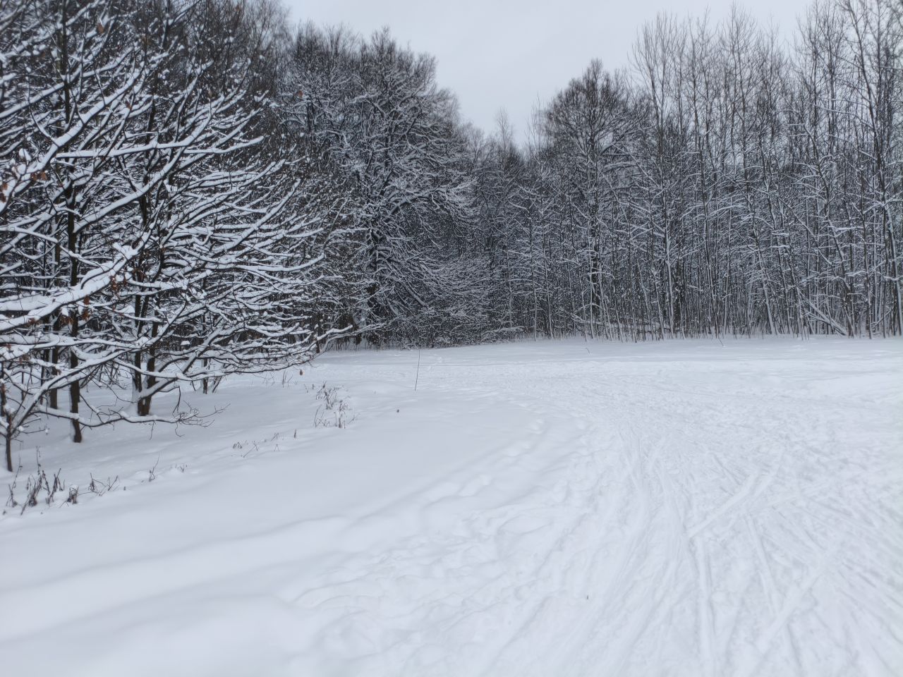 В лесу на 5 км вполне хорошо скользит, трассу припорошило немного, хорошо держится траектория, но слишком сильный зацеп — не лучшее скольжение, но и не худшее, идеально для тренировки детей подниматься в гору и быстро съезжать. На поле укатана только одна петля из 4-х, и ту сильно припорошило, скольжение по целине — хорошее.