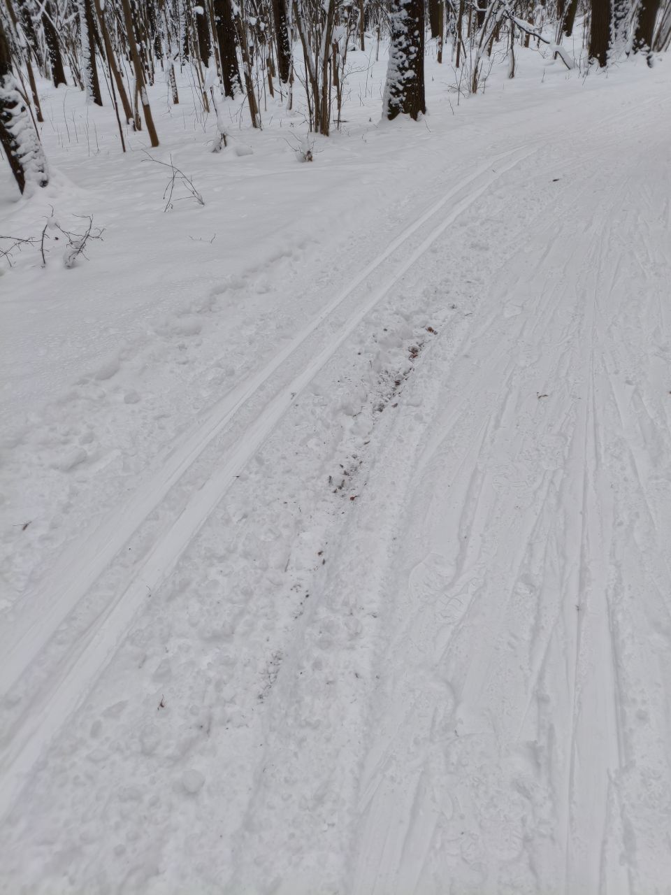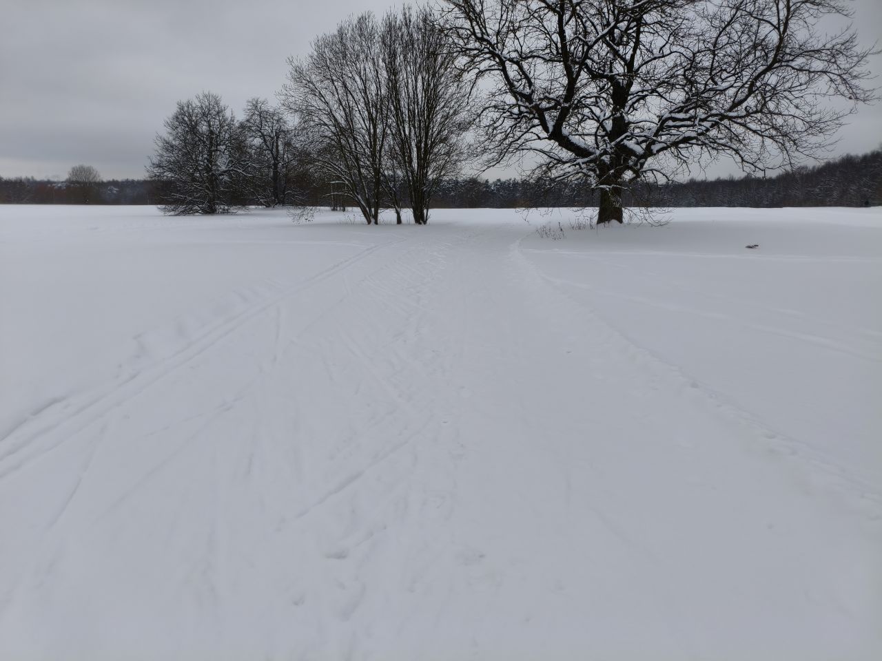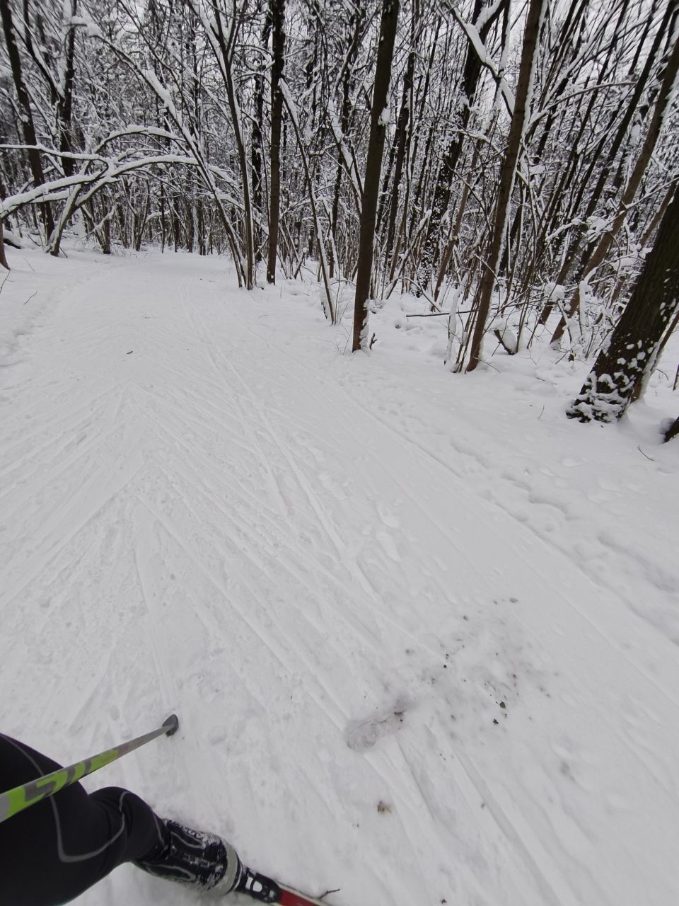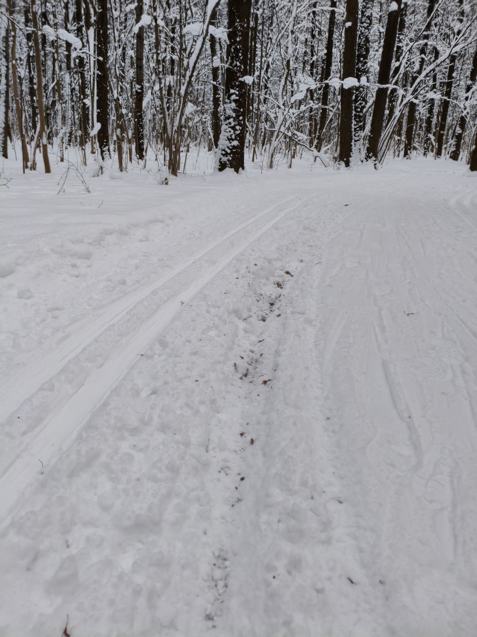 В лесу на 5 км вполне хорошо скользит, трассу припорошило немного, хорошо держится траектория, но слишком сильный зацеп — не лучшее скольжение, но и не худшее, идеально для тренировки детей подниматься в гору и быстро съезжать. На поле укатана только одна петля из 4-х, и ту сильно припорошило, скольжение по целине — хорошее.