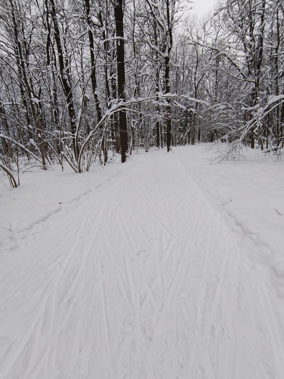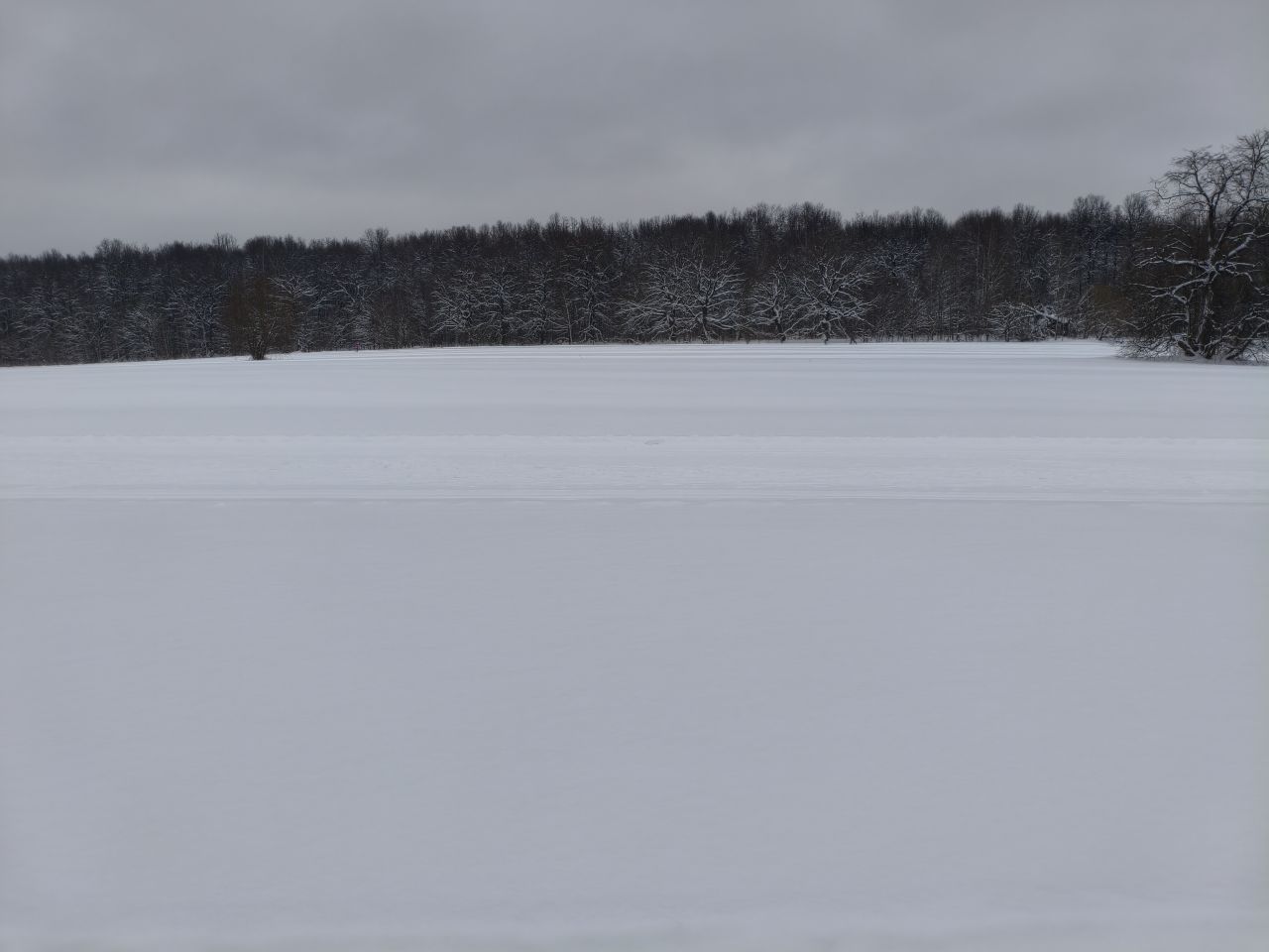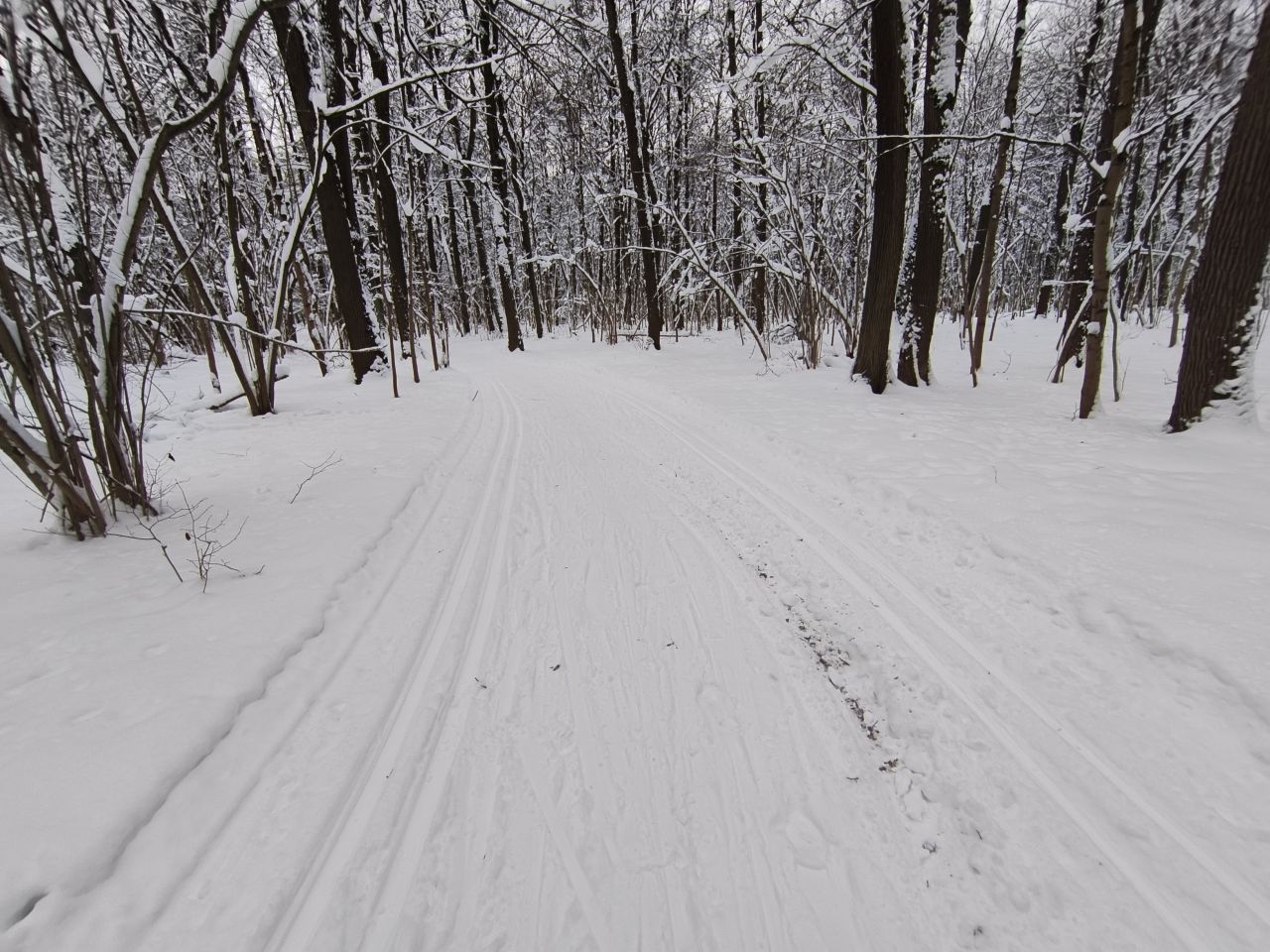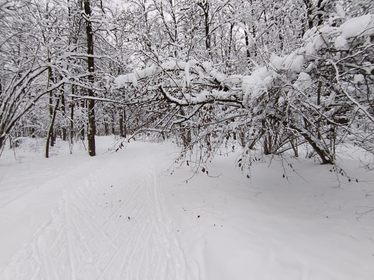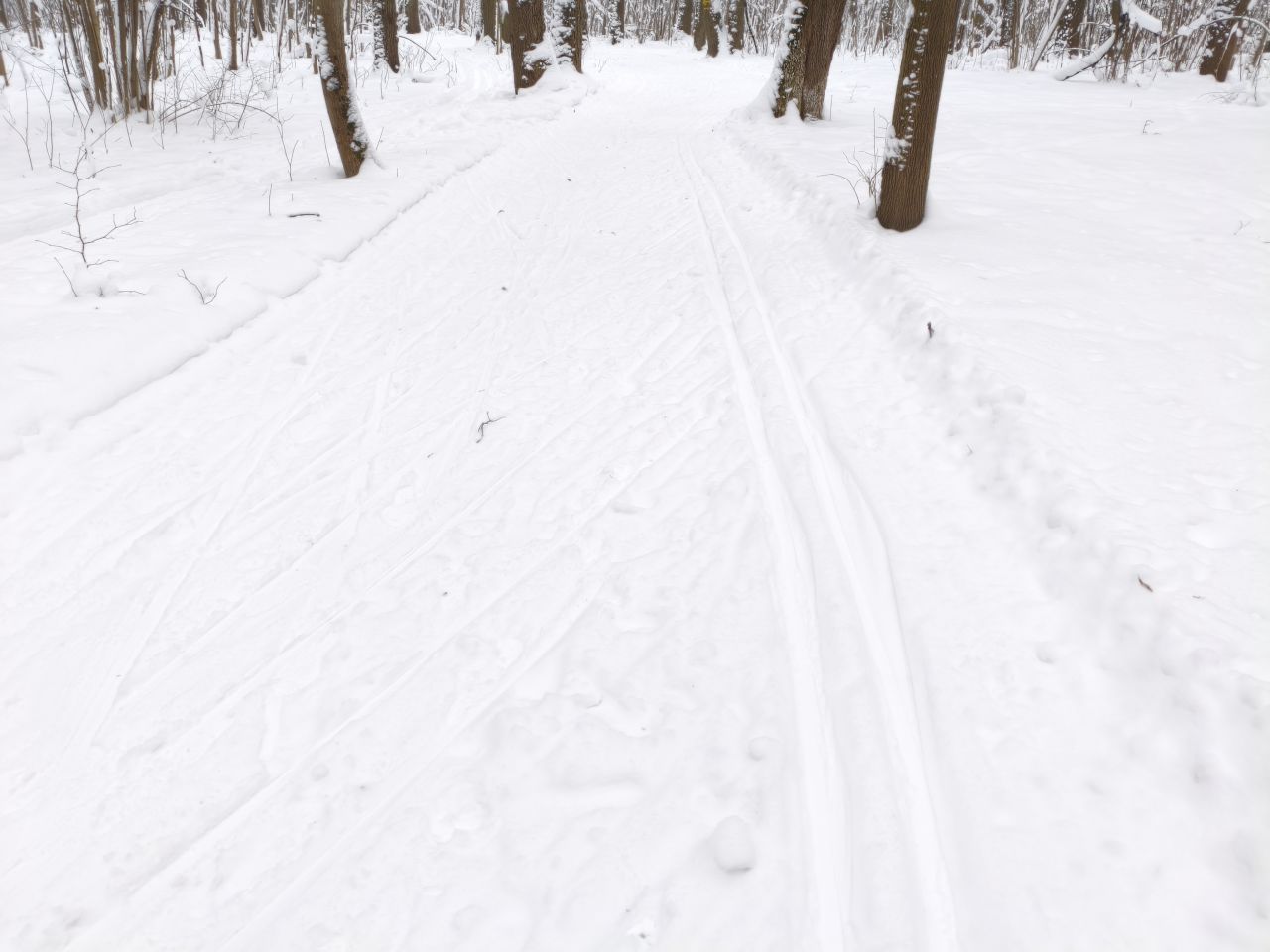 В лесу на 5 км вполне хорошо скользит, трассу припорошило немного, хорошо держится траектория, но слишком сильный зацеп — не лучшее скольжение, но и не худшее, идеально для тренировки детей подниматься в гору и быстро съезжать. На поле укатана только одна петля из 4-х, и ту сильно припорошило, скольжение по целине — хорошее.