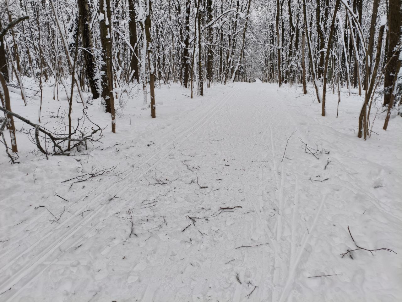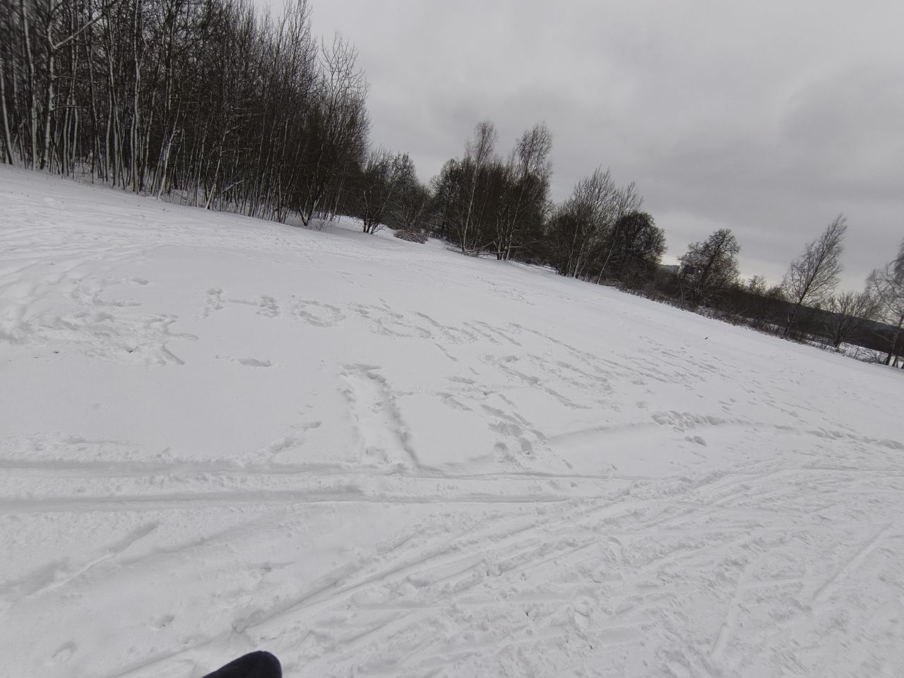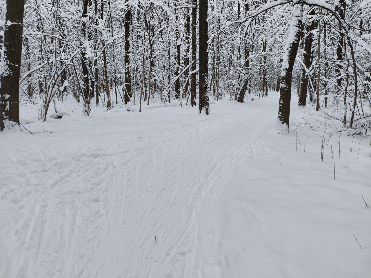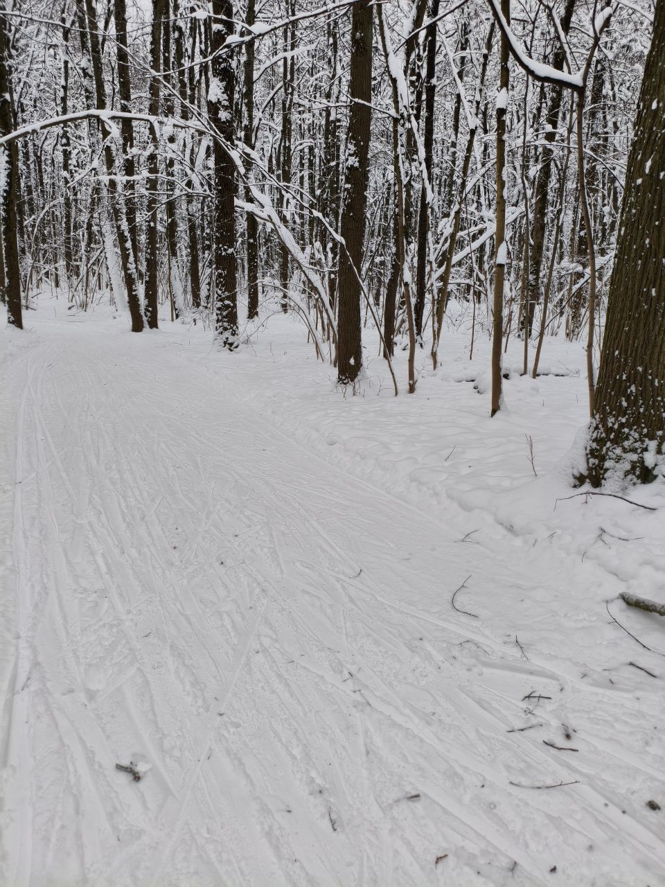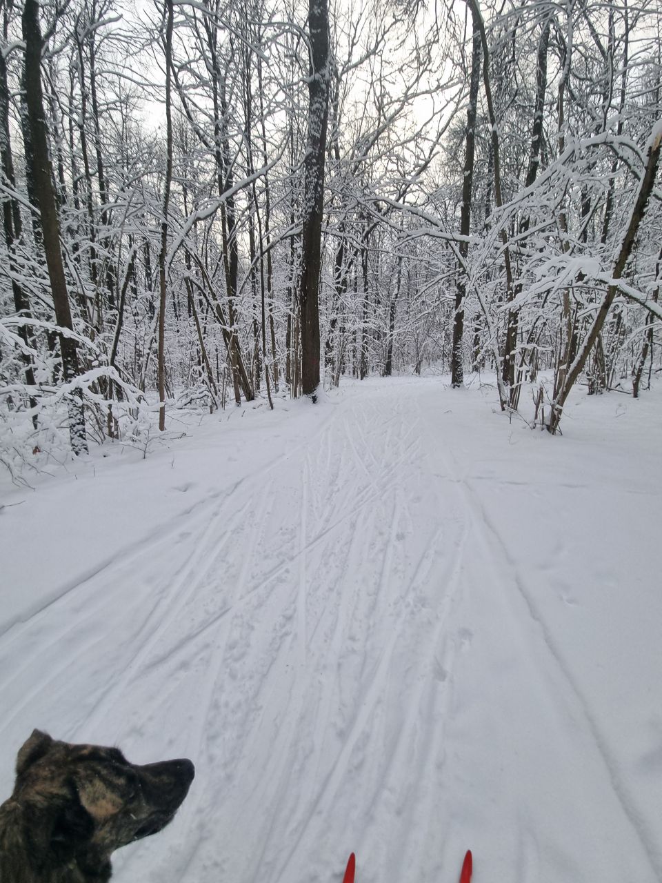 В лесу на 5 км вполне хорошо скользит, трассу припорошило немного, хорошо держится траектория, но слишком сильный зацеп — не лучшее скольжение, но и не худшее, идеально для тренировки детей подниматься в гору и быстро съезжать. На поле укатана только одна петля из 4-х, и ту сильно припорошило, скольжение по целине — хорошее.