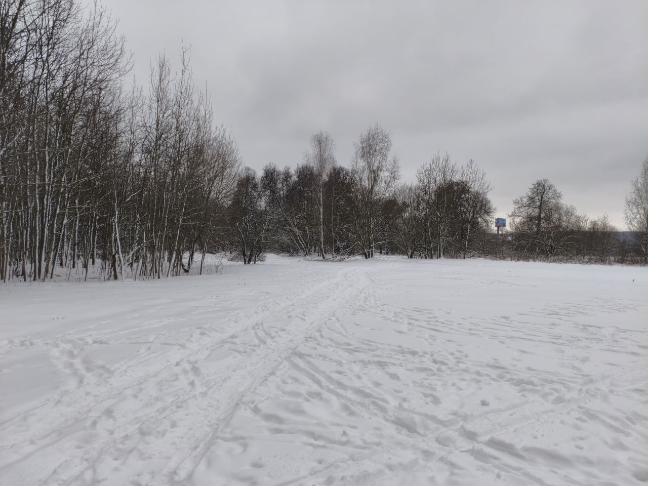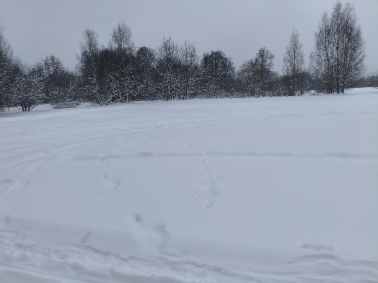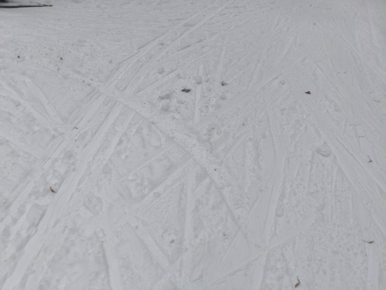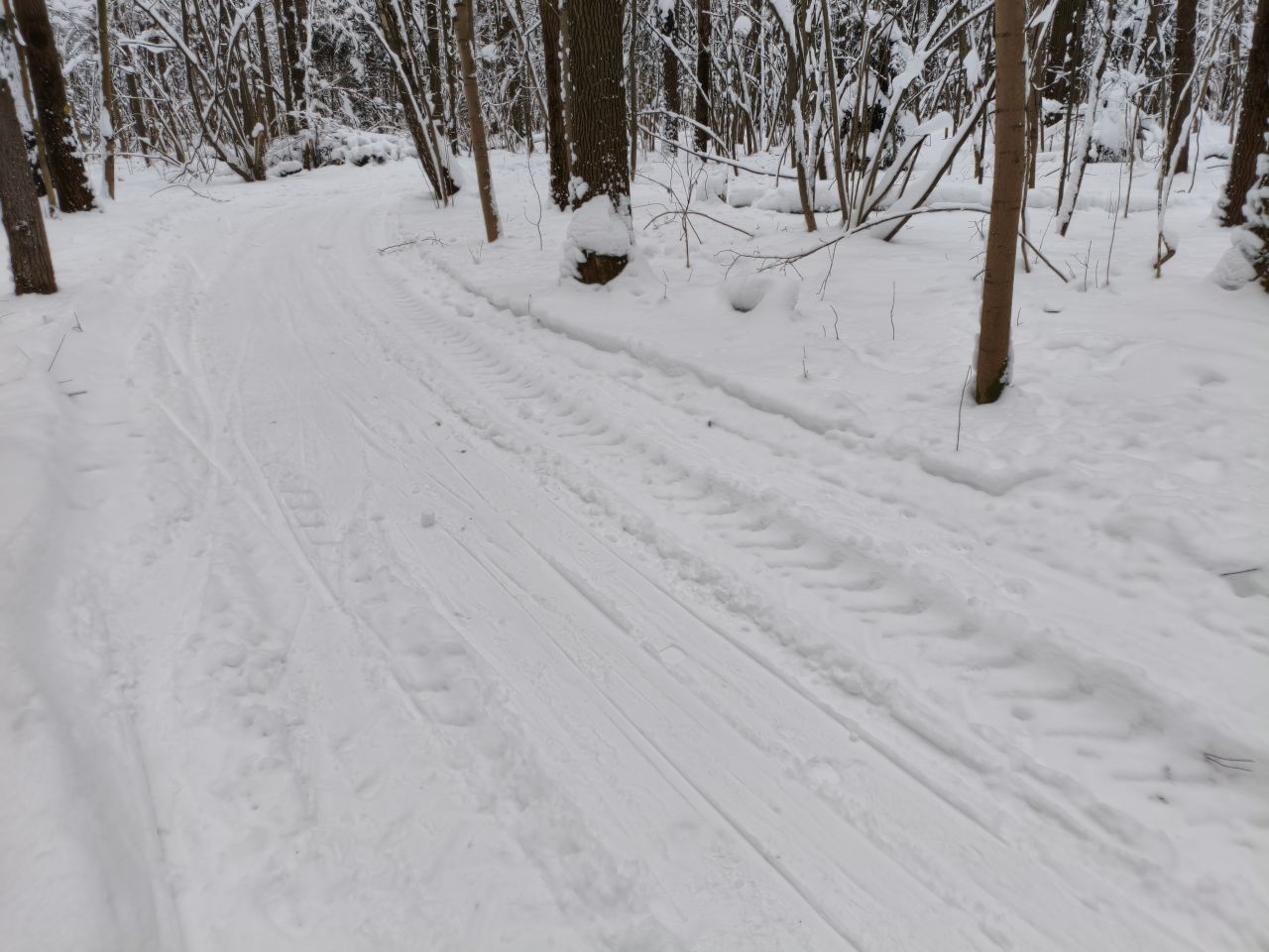 В лесу на 5 км вполне хорошо скользит, трассу припорошило немного, хорошо держится траектория, но слишком сильный зацеп — не лучшее скольжение, но и не худшее, идеально для тренировки детей подниматься в гору и быстро съезжать. На поле укатана только одна петля из 4-х, и ту сильно припорошило, скольжение по целине — хорошее.