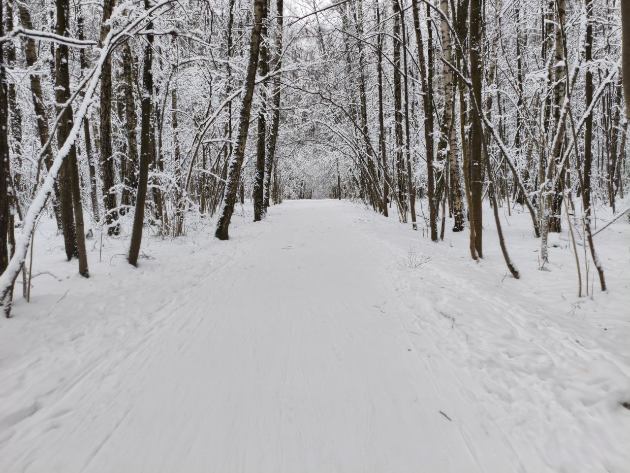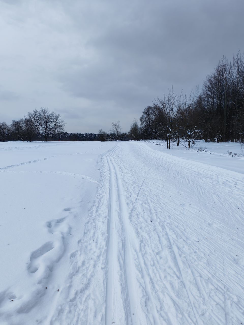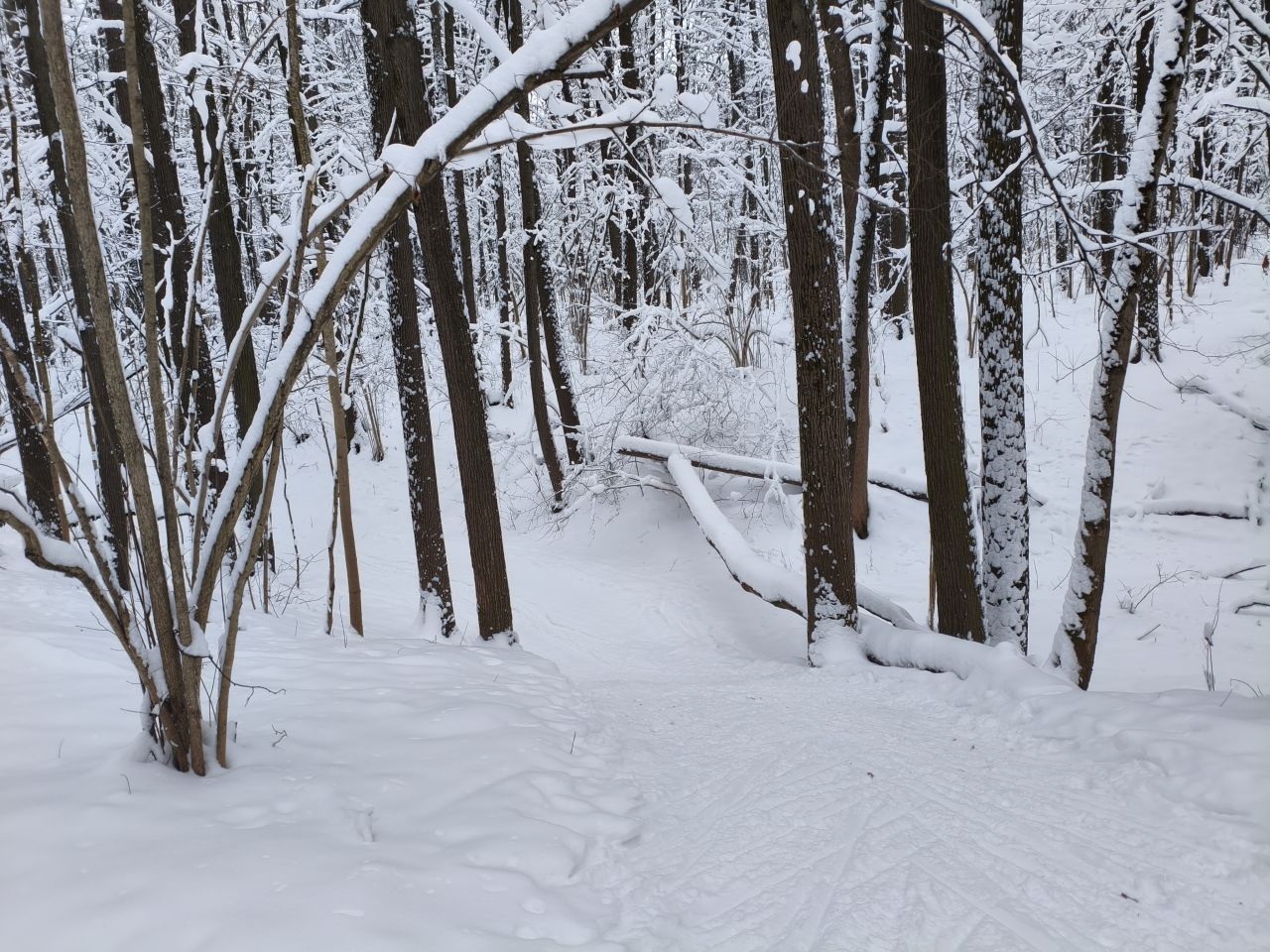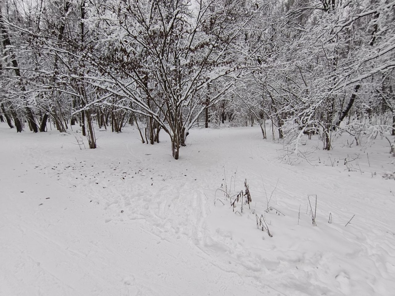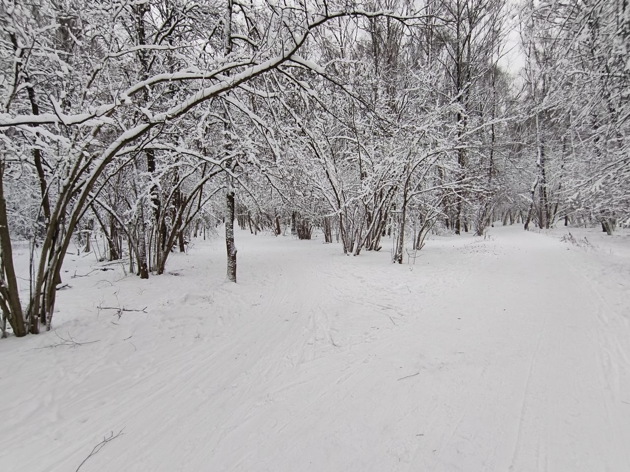 В лесу на 5 км вполне хорошо скользит, трассу припорошило немного, хорошо держится траектория, но слишком сильный зацеп — не лучшее скольжение, но и не худшее, идеально для тренировки детей подниматься в гору и быстро съезжать. На поле укатана только одна петля из 4-х, и ту сильно припорошило, скольжение по целине — хорошее.