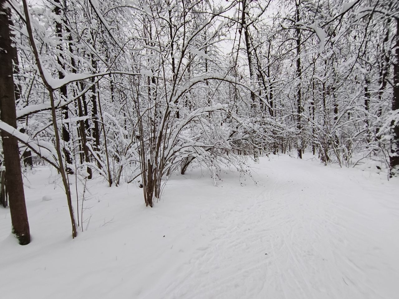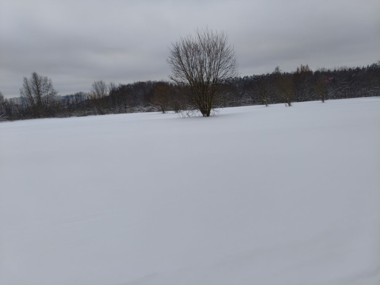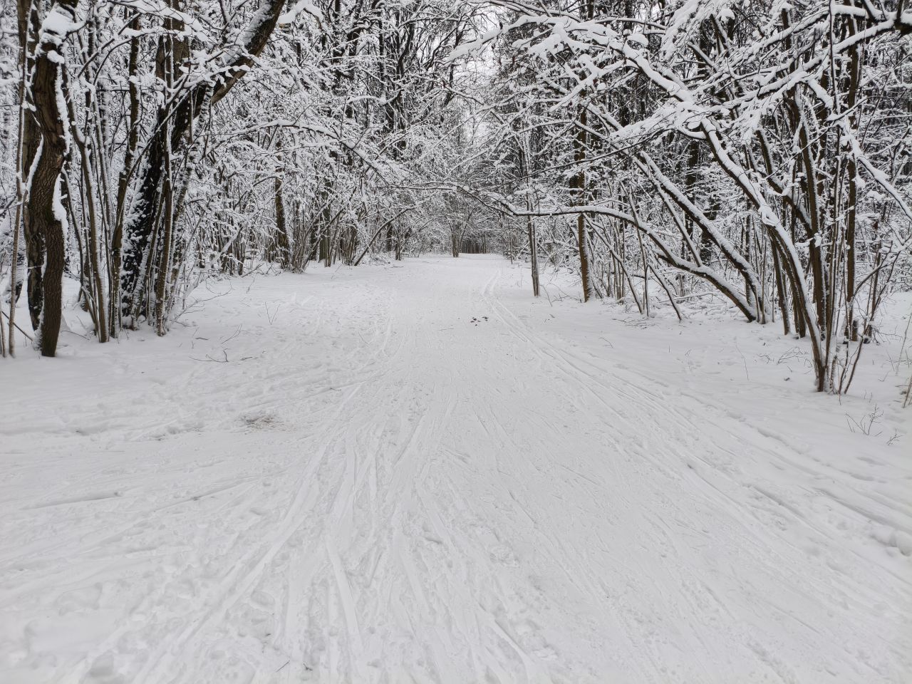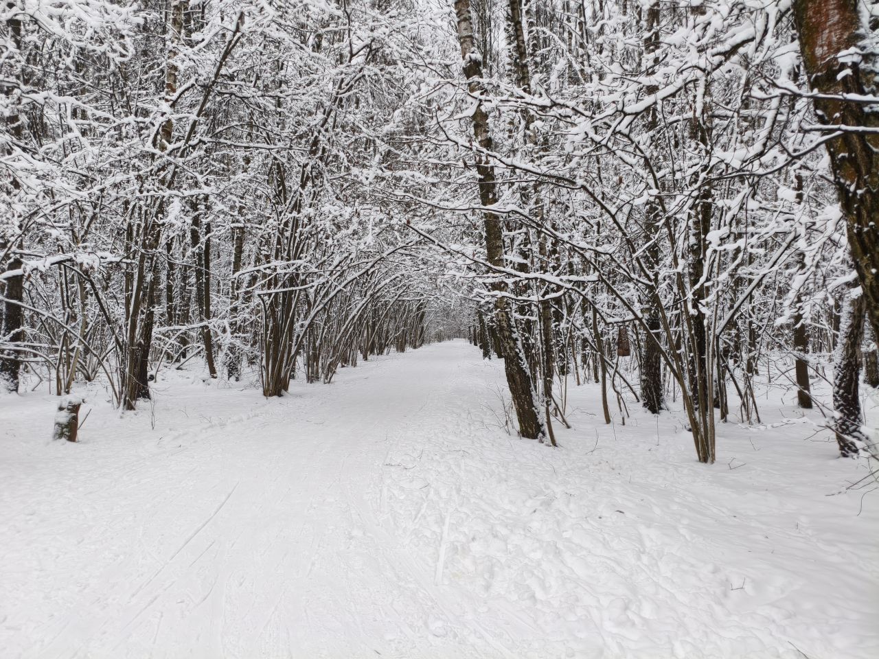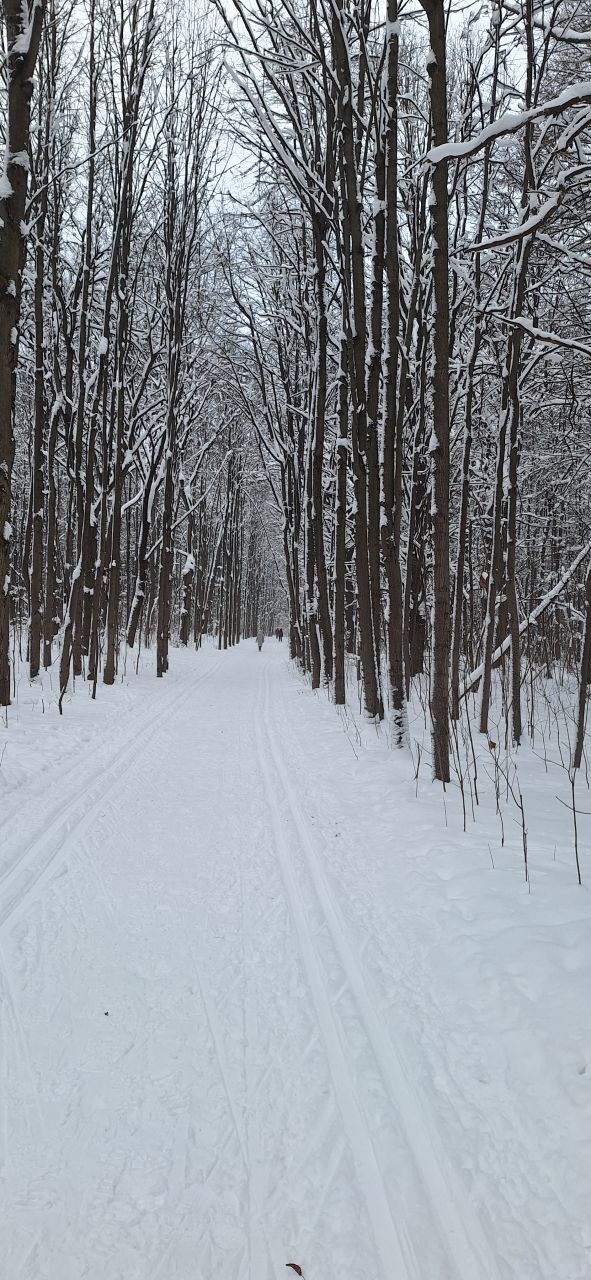 В лесу на 5 км вполне хорошо скользит, трассу припорошило немного, хорошо держится траектория, но слишком сильный зацеп — не лучшее скольжение, но и не худшее, идеально для тренировки детей подниматься в гору и быстро съезжать. На поле укатана только одна петля из 4-х, и ту сильно припорошило, скольжение по целине — хорошее.