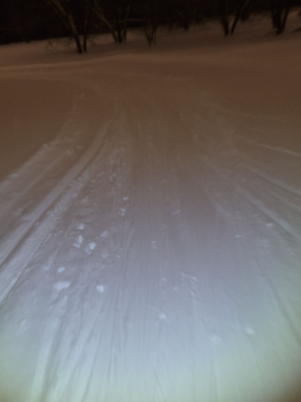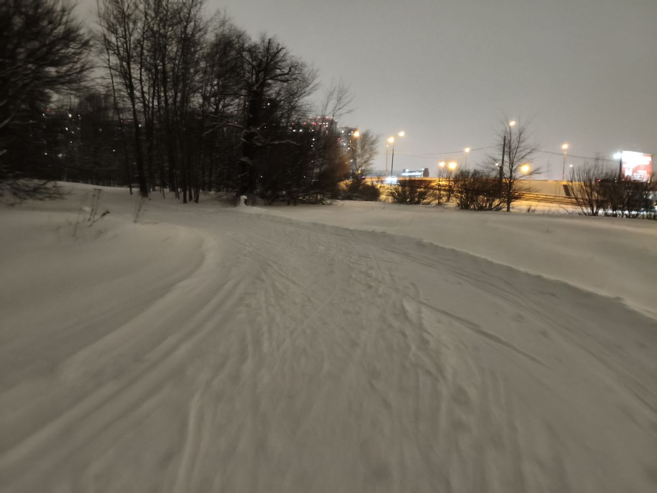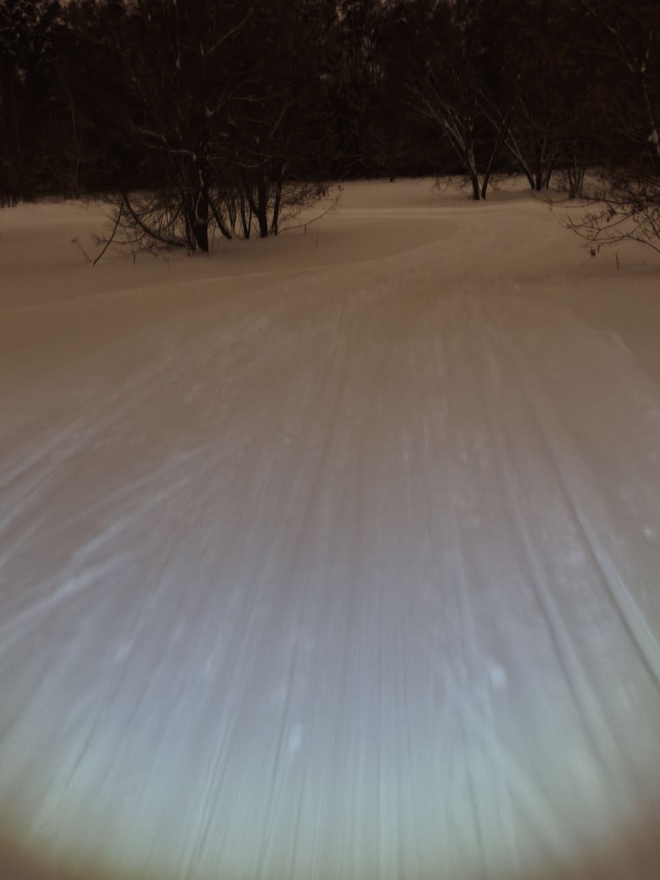 Лыжи скользят так себе, снег мягкий, на прогулочной дороге что в сторону Ямыблиз ЖК скользит как на профессиональной трассе — разительно лучше, в отличие от трассы Аннино. Все петли на поле "живые" люди катаются, фото с фонариком с 3-й петли.