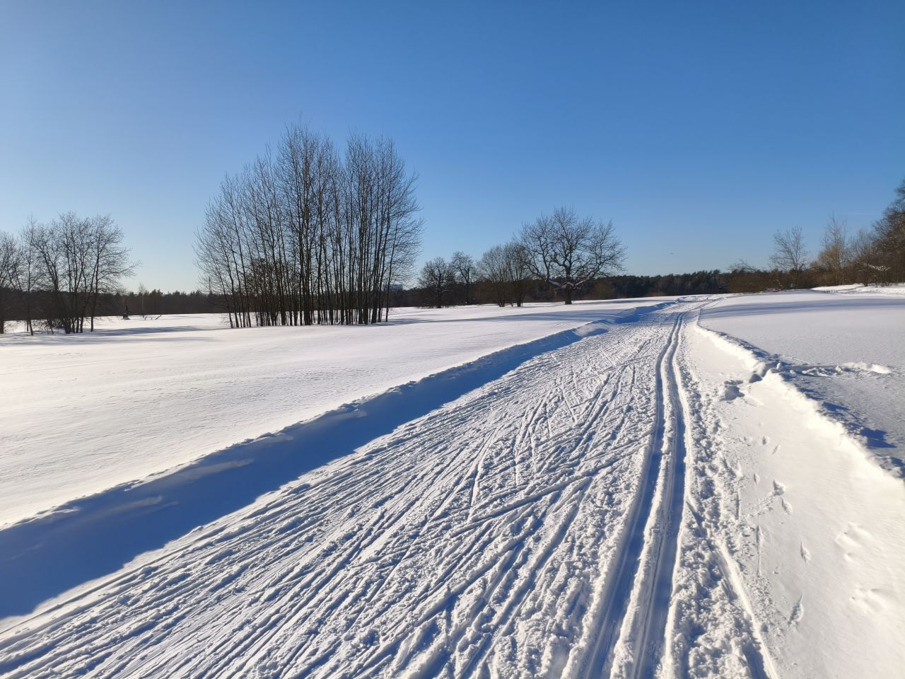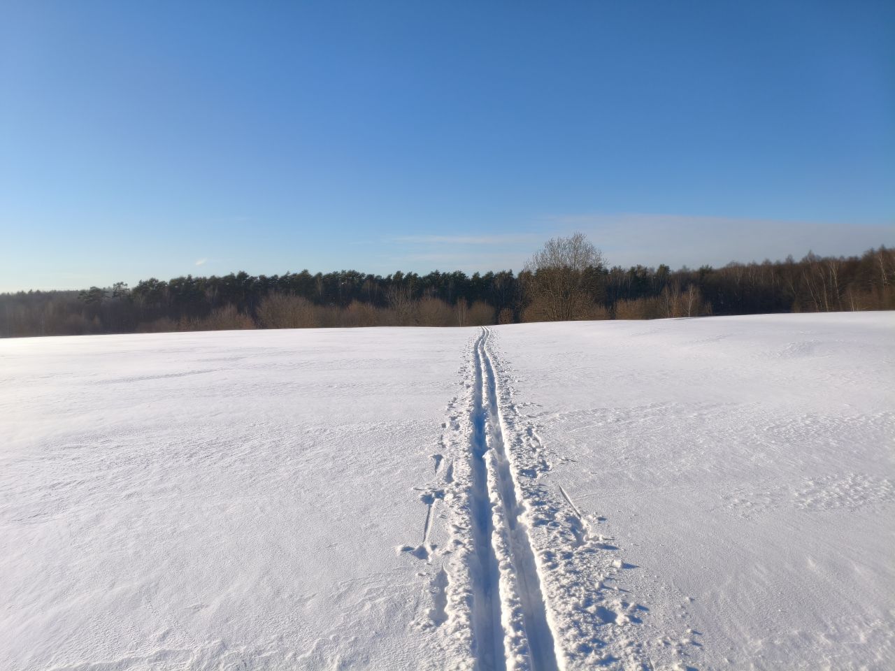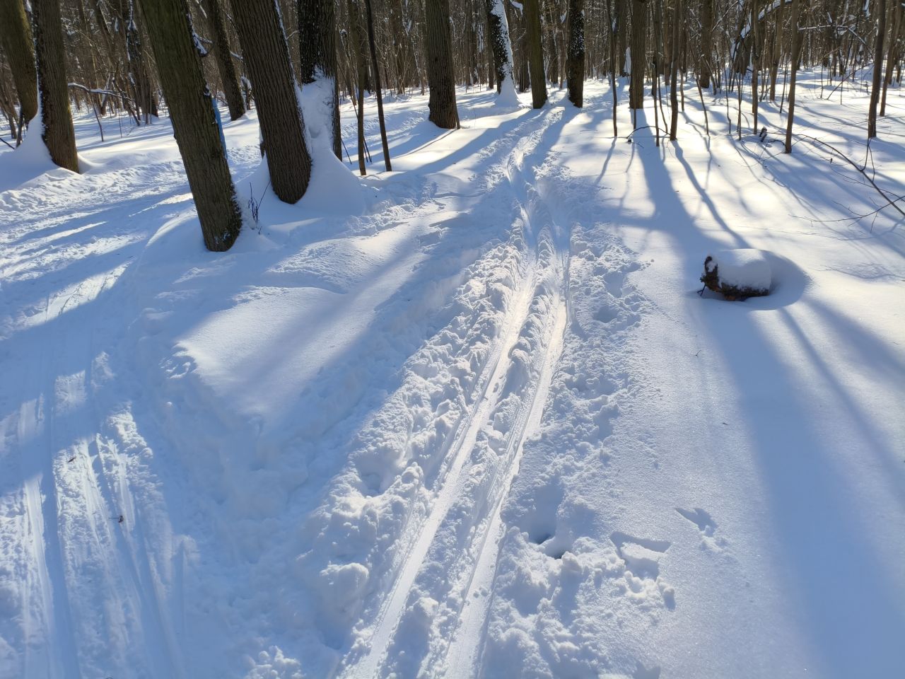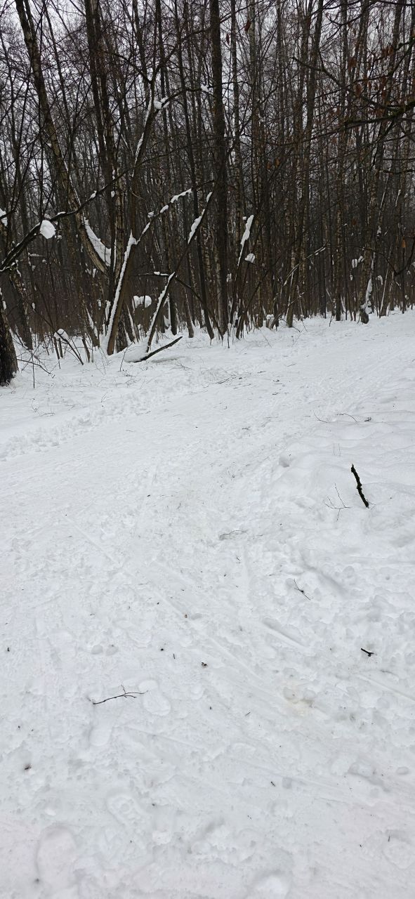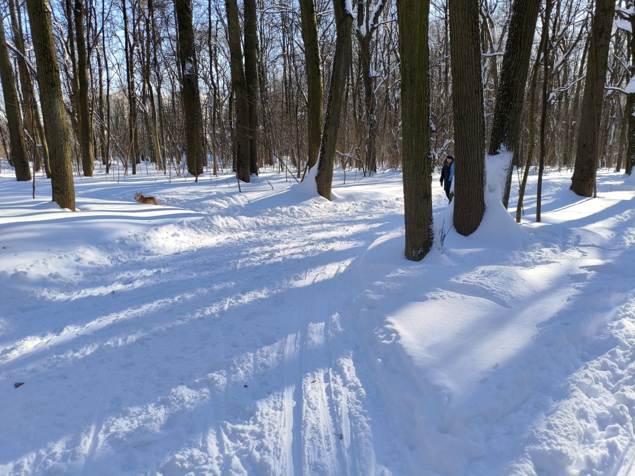 После недавно выпавшего снега трассу раскатали, но в поле только одна петля и по памяти классику на остальные 3 продавить не удалось. В лесу чисто — почти все ветки засыпало, можно брать дорогие классические лыжи. Скольжение приемлемое, снег мягкий. Глубина корки от предыдущего слоя на поле варьируется от 20 до 50см в зависимости от рельефа.