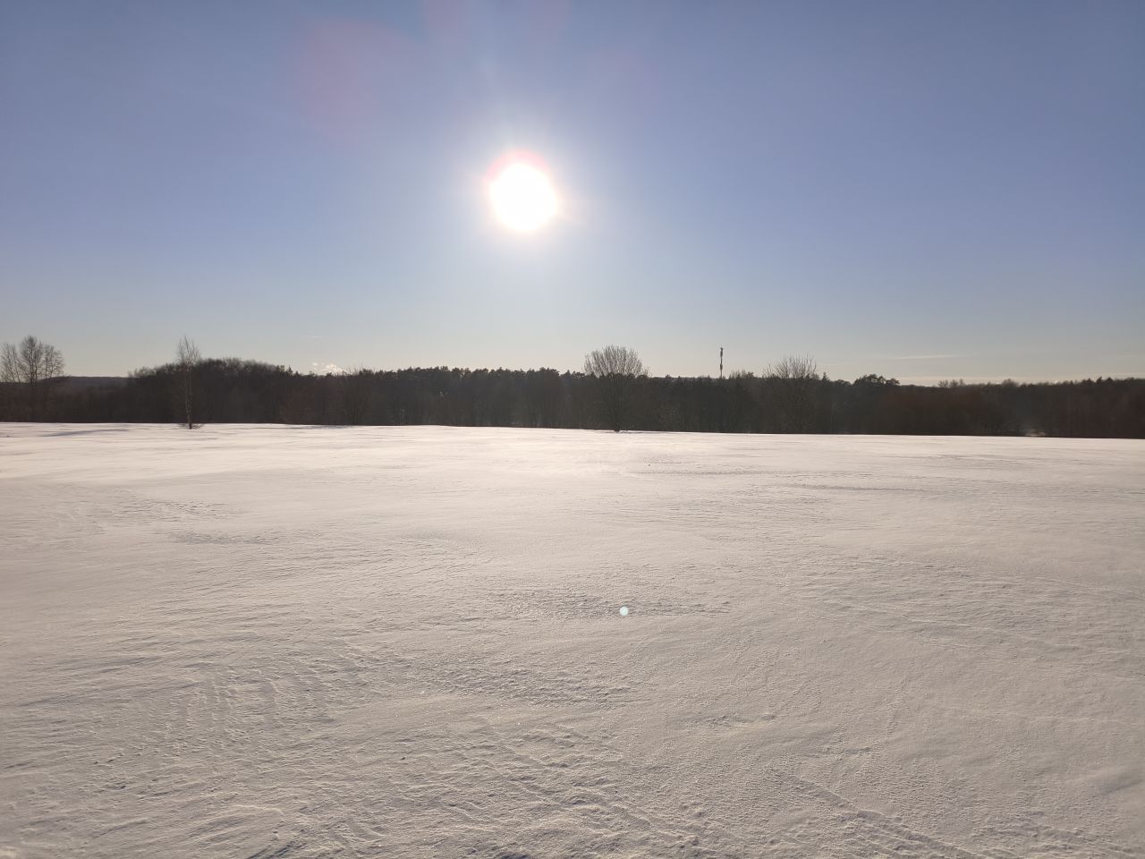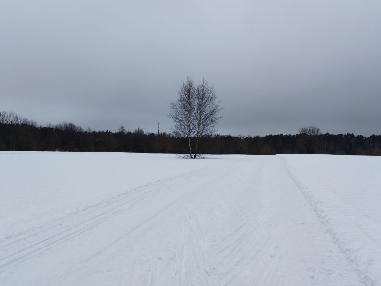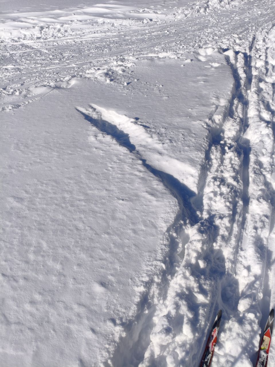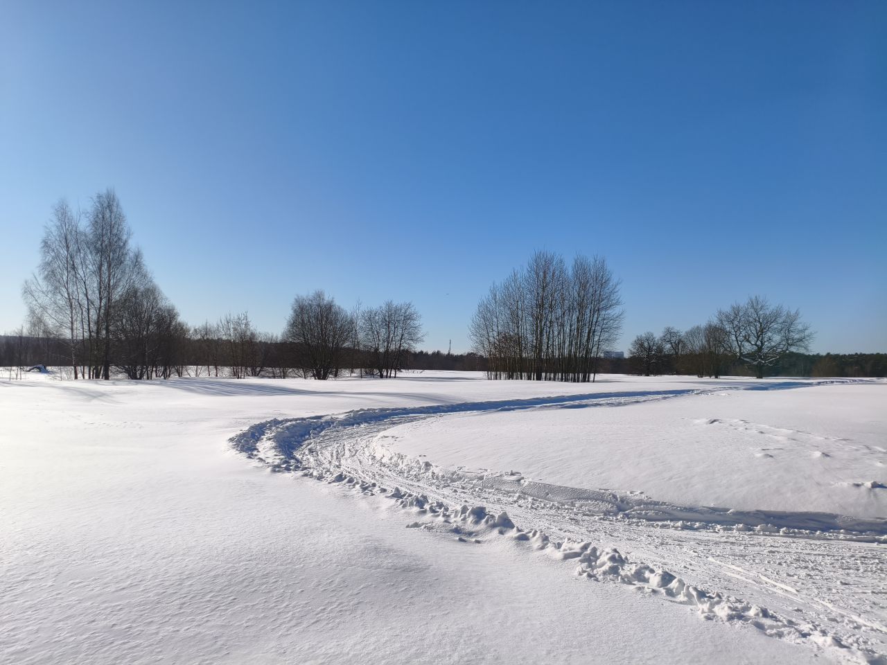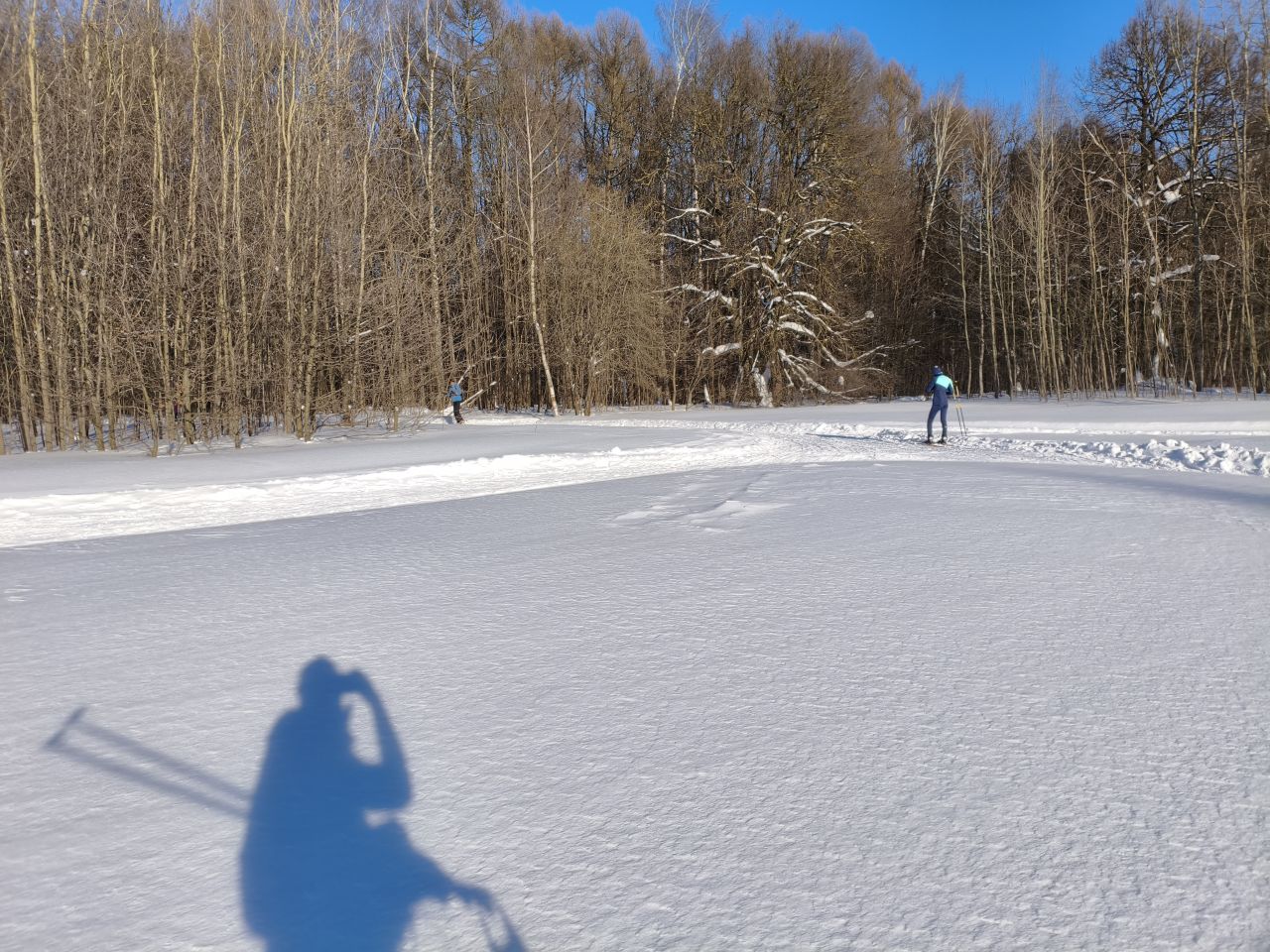 После недавно выпавшего снега трассу раскатали, но в поле только одна петля и по памяти классику на остальные 3 продавить не удалось. В лесу чисто — почти все ветки засыпало, можно брать дорогие классические лыжи. Скольжение приемлемое, снег мягкий. Глубина корки от предыдущего слоя на поле варьируется от 20 до 50см в зависимости от рельефа.