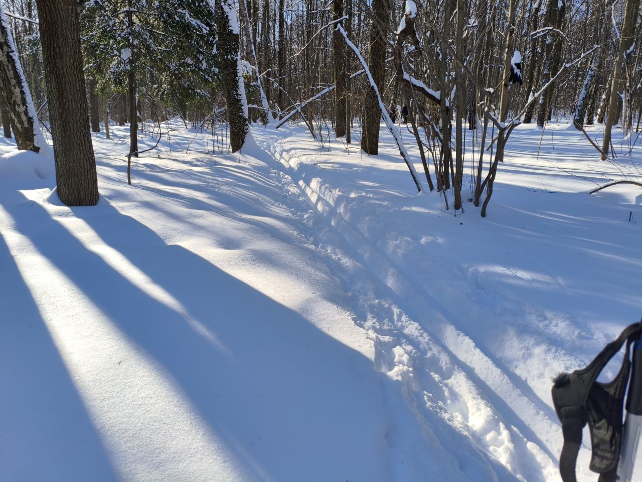 На 11:00 в лесу достаточно плотно, в поле помягче. Палки практически не проваливаются, лыжи катят соответственно температуре. В ближнем лесу в основном мелкие ветки, но ничего критичного.