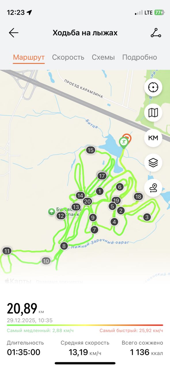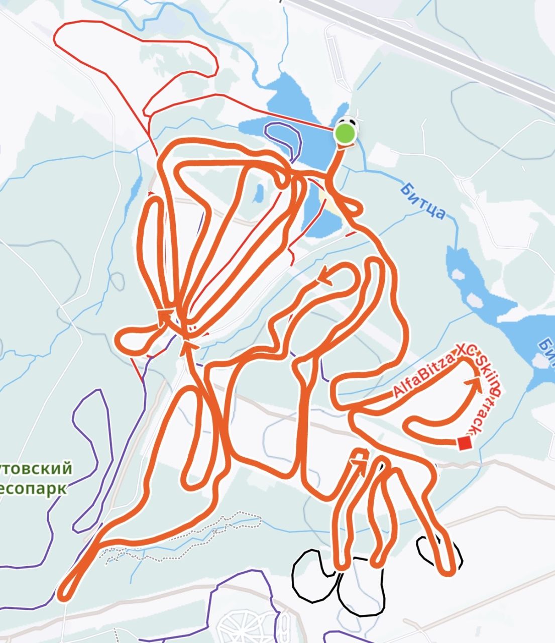 В остальном всё хорошо. Трасса рабочая, ночью подсыпало снежку, но скольжение по свежаку было нормальным. Народу мало. Полный круг получился примерно 15 км