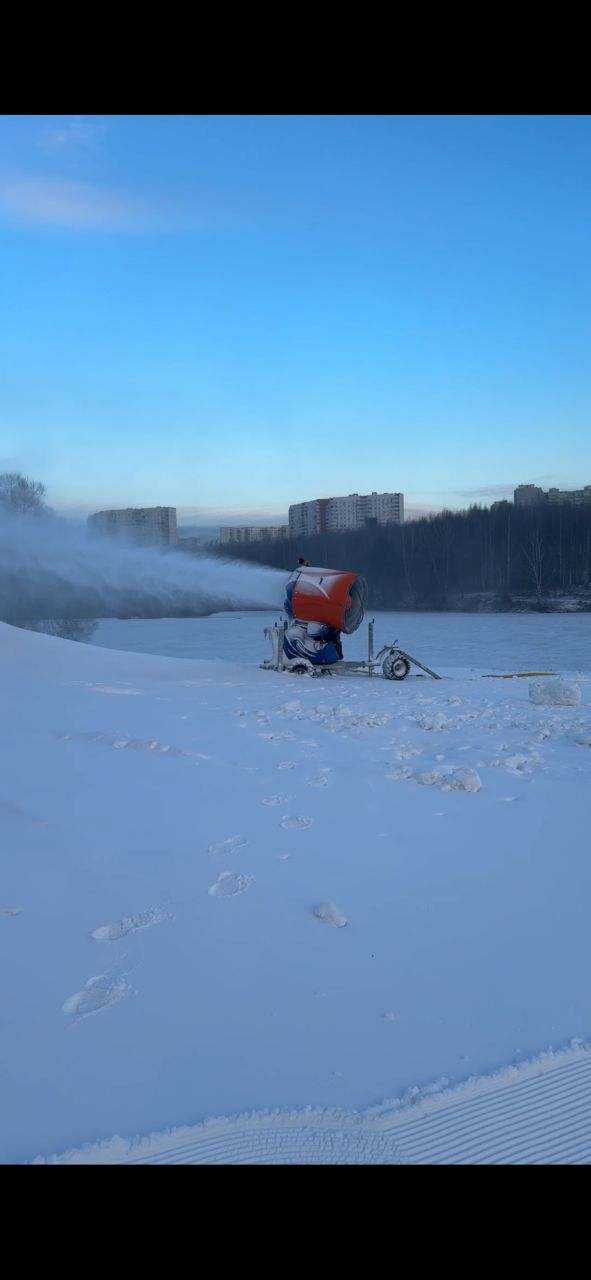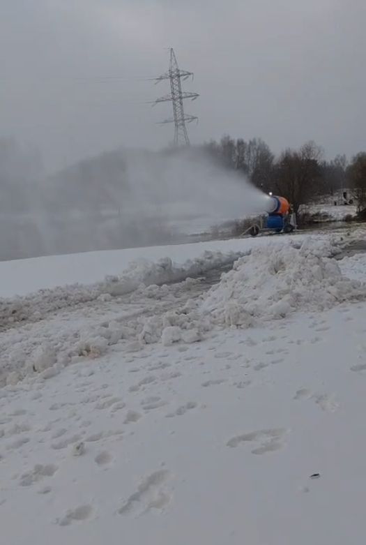 Геннадий Иванович начал подготовку трассы. Пока идёт напыление снега из него готовят небольшой круг