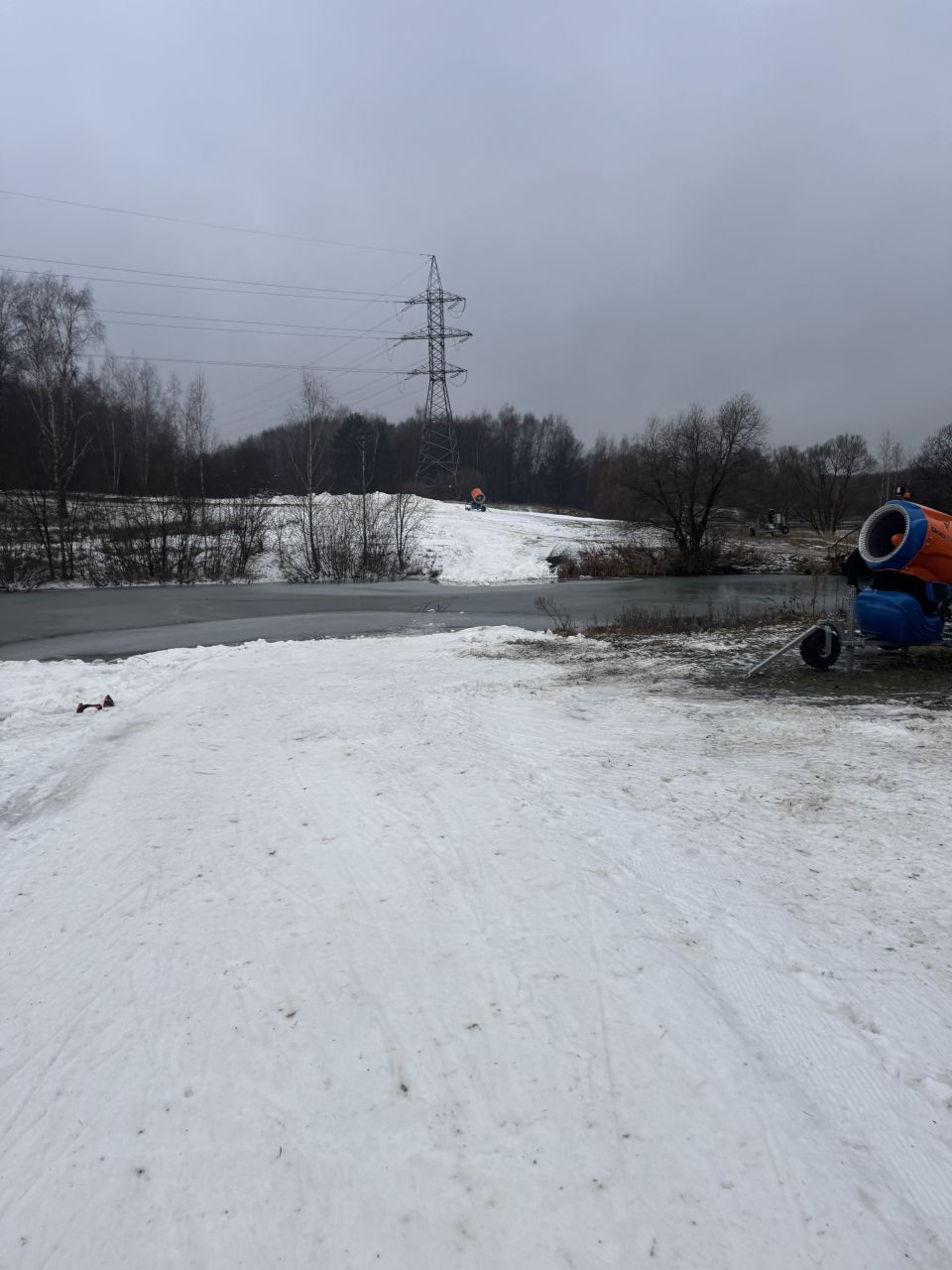 Работают пушки. На входе(у прудов) сделан маленький пятачок со снегом. Техникой расширяют размер круга. Лыжники уже есть. Лыжи асфальтовые.