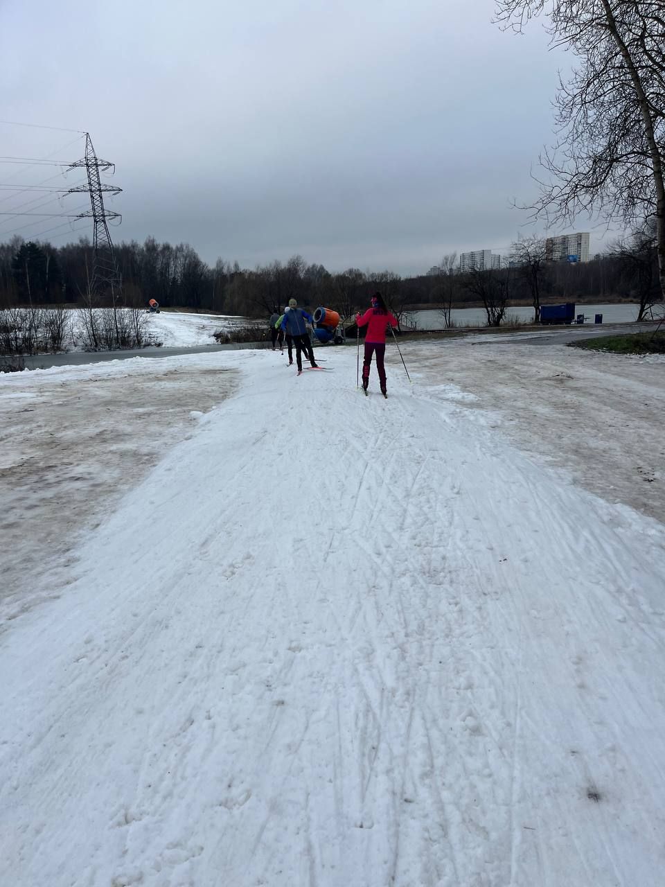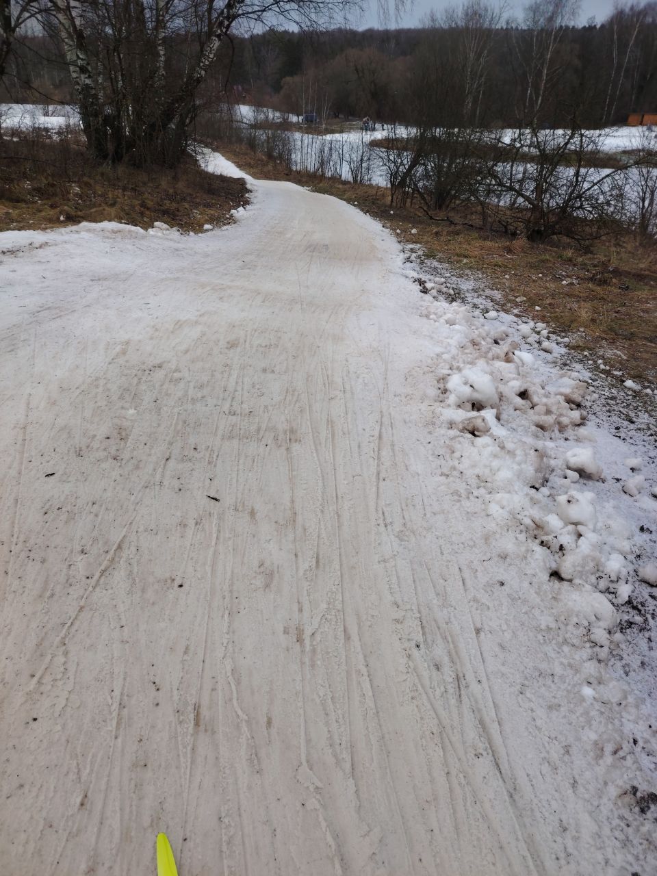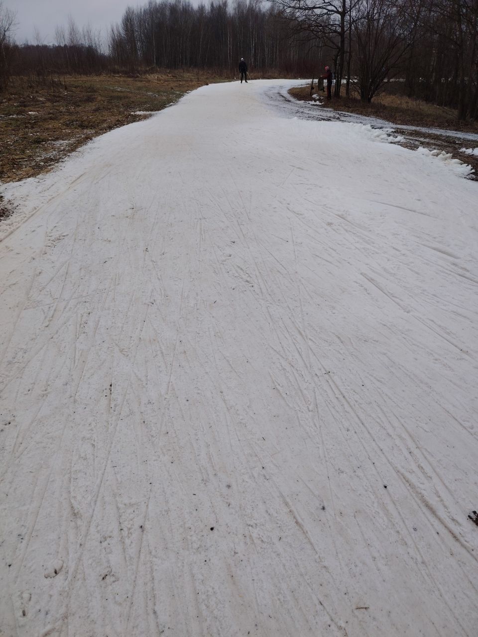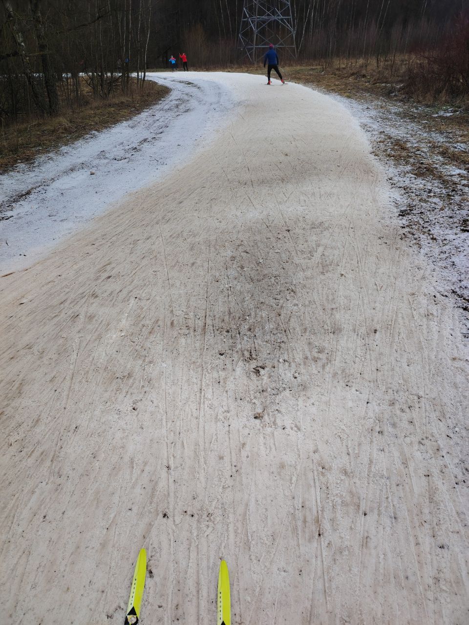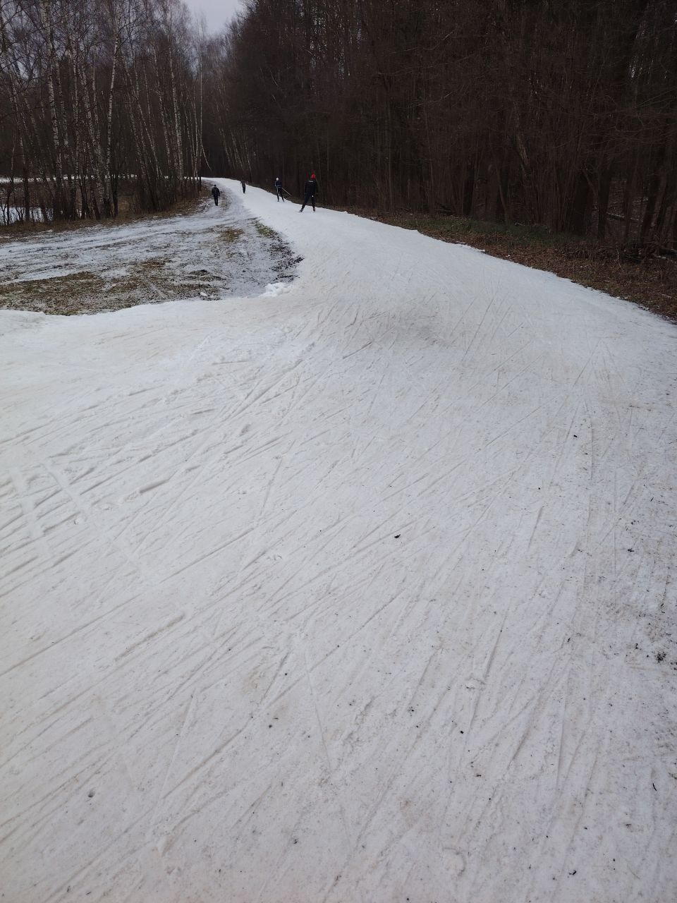 Подготовлен (насколько это возможно в нынешних бесснежных и относительно теплых погодных условиях) километровый круг (набор высоты около 15м), старт от асфальтовой части в тягунок возле пруда наверх и направо к небольшому повороту со спуском, разворотом на 180 градусов и крутым подъёмом. На фото стартовый кусок, один из двух самых хороших по качеству подложки - общей протяженностью метров 400. Остальное - снеголёд вперемешку с грязью, свежего снега пока нет, но ратрак периодически всё утрамбовывает. Лыжи однозначно асфальтовые брать. Второе фото слабо передаёт общее количество людей на трассе... единовременно, наверное, человек 60-70 катается туда-сюда, плюс ещё детки из спорт секции занимаются, родители тут же с ними, подложка для катания узкая - в общем, фарш полнейший, соблюдайте бдительность и осторожность, ну или приезжайте пораньше!