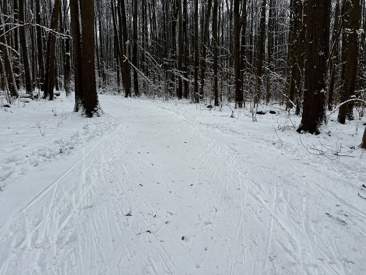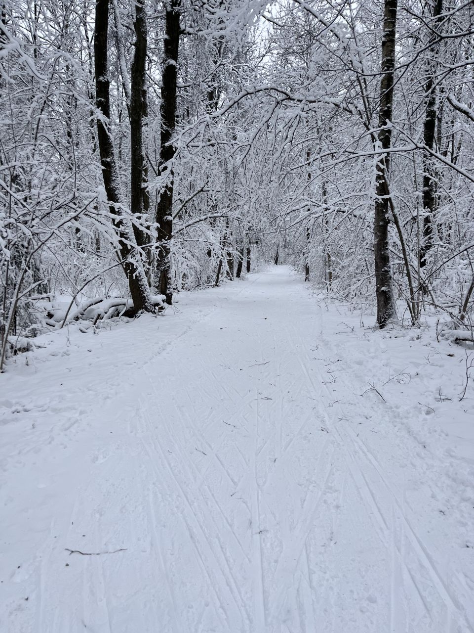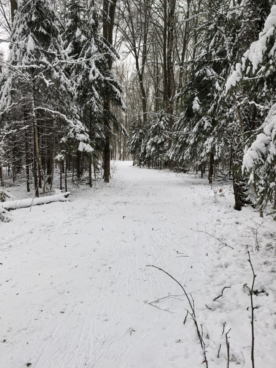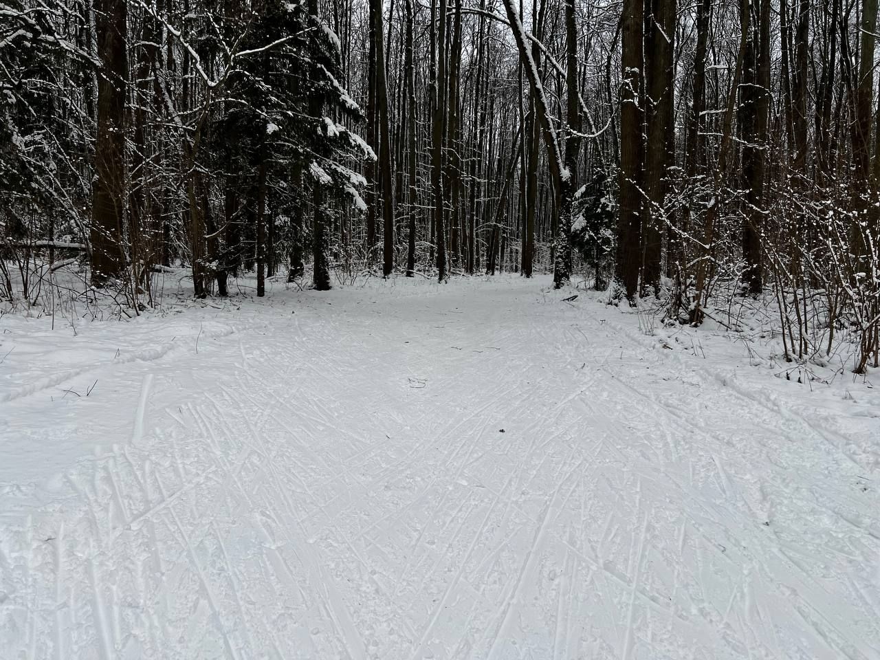 Чуть подсыпало снега - стало ровнее. Ближние петли хороши - широкие и ровные, достаточно плотные. Есть несколько мест, где видна земля так что советую пока тренировочные. Дальний лес тоже прошли снегоходом - широко, но пока очень мягко.