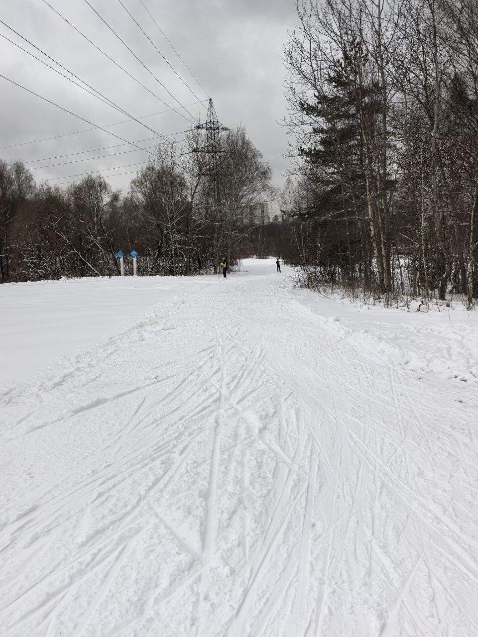 Сегодня конвейер из лыжников, к 12 часам стало чуть посвободнее. Трасса достаточно ровная и чистая, кроме участков на верху и один перед подъёмом, снег постоянно подкидывают лопатой, но он заканчивается.
