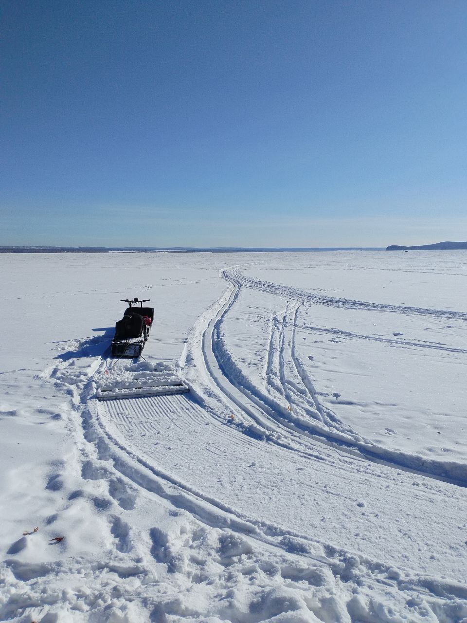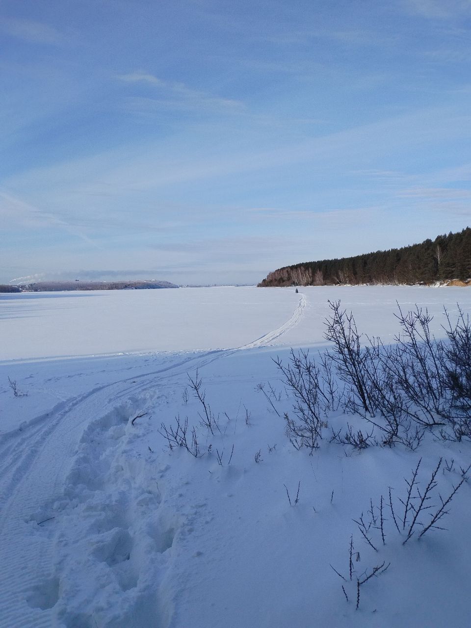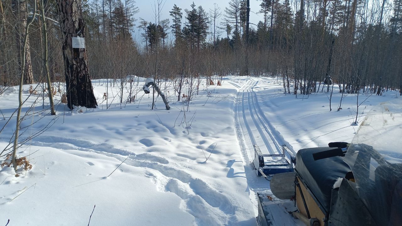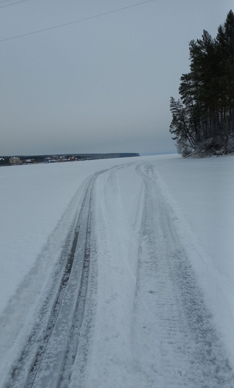4. От Крокодила лыжня огибает мыс и через Анталью заходит в лес. Выходит с другой стороны мыса, рядом с поселком Мельничная падь. Далее идёт под противоположный берег. Пожалуйста, видимые мокрые места обходите(их было 2-4). Ибо может быть неприятно. Техника прошла, конечно, но адреналина хватило + гусянки, резак все покрылось толстым слоем льда. В лесу потом все очищали.