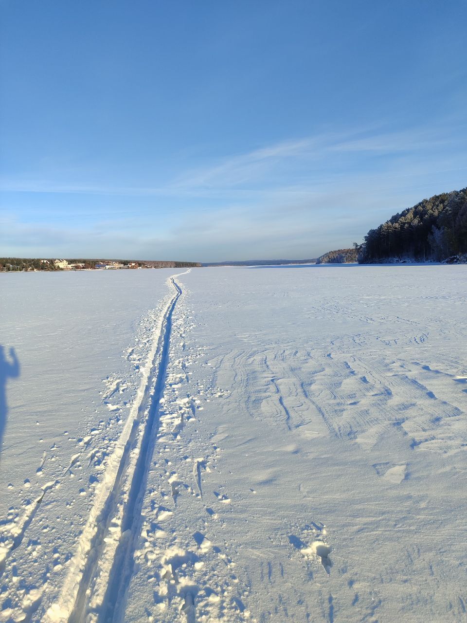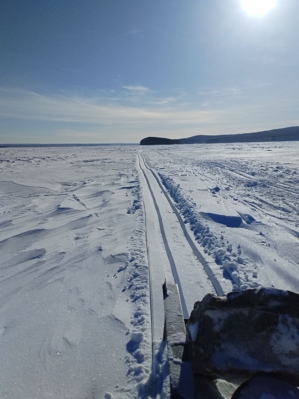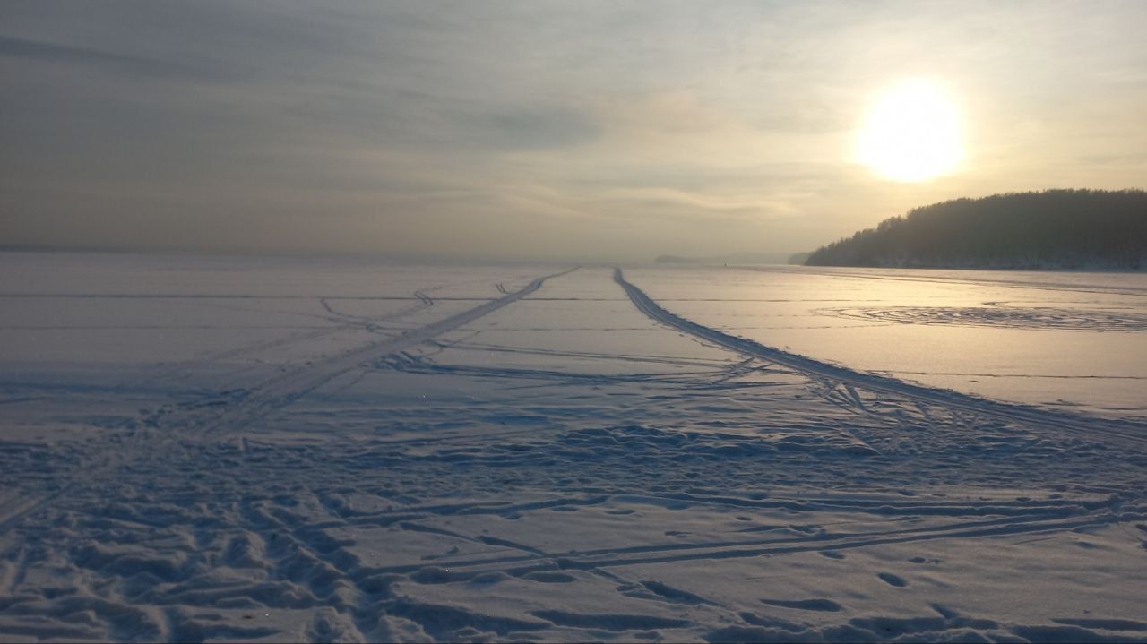 В заливе падь Мельничная, лыжня, где пропиталась водой, теперь до весны простоит. Много воды было у мыса, где ЛЭП проходит. Там тоже два следа получилось от техники. Но лыжня только в одном. Идем сбоку, там льда поменьше😁