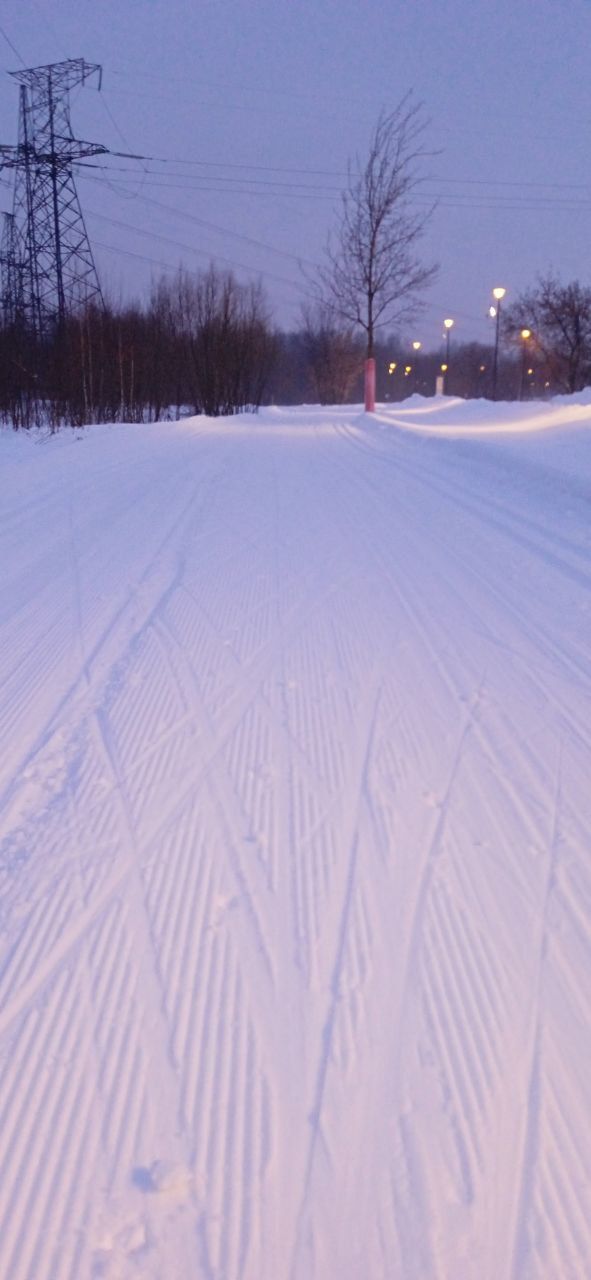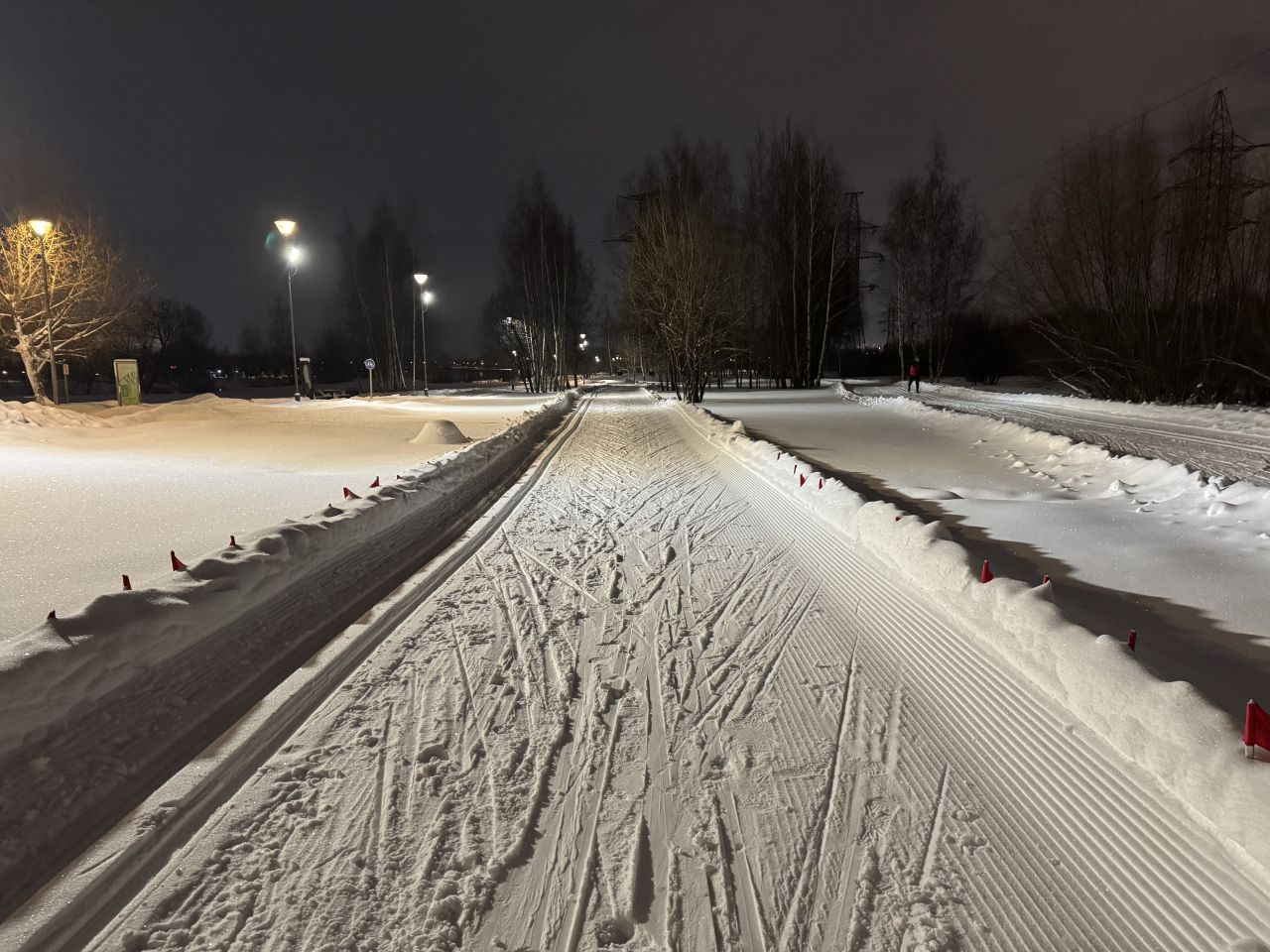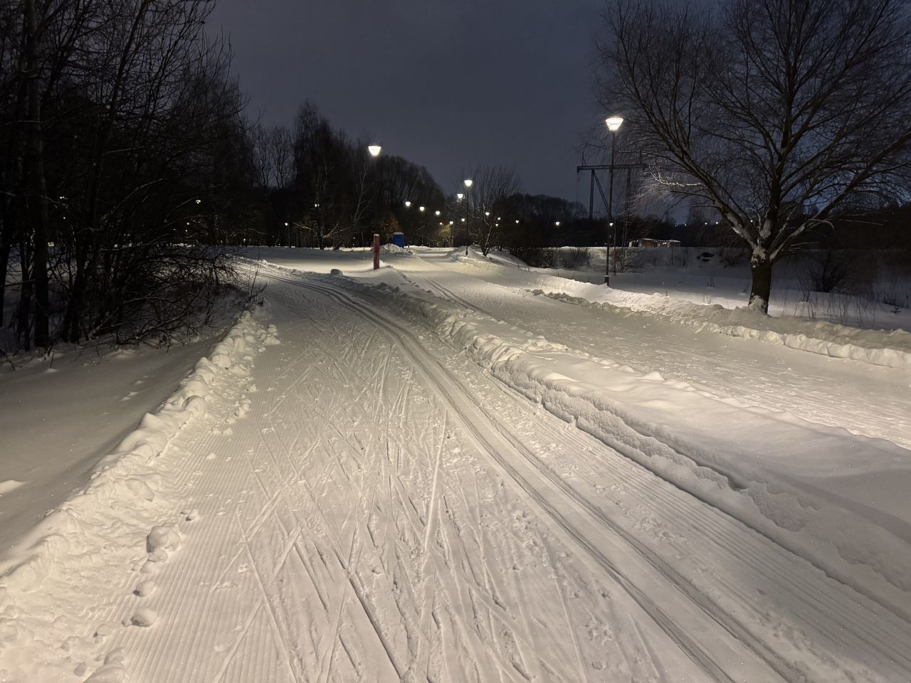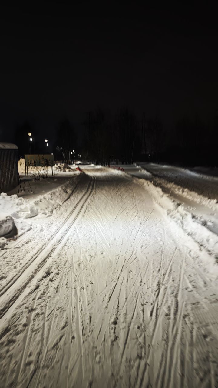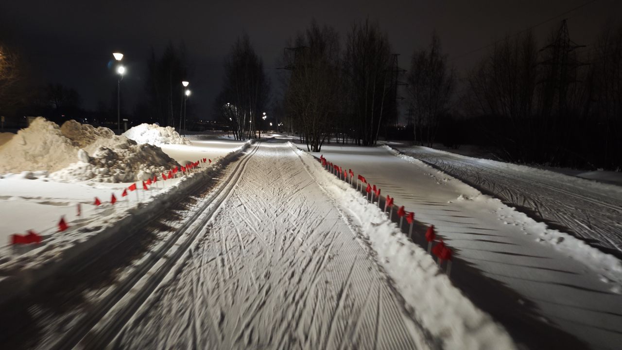 Трасса в отличном состоянии на всех участках, круг 2,4 км +-, встретил в это время человек 5. Видно, что на днях (сегодня или вчера) привели в порядок после снегопадов, но как будто трасса местами стала уже, чем изначально перед Новым годом.