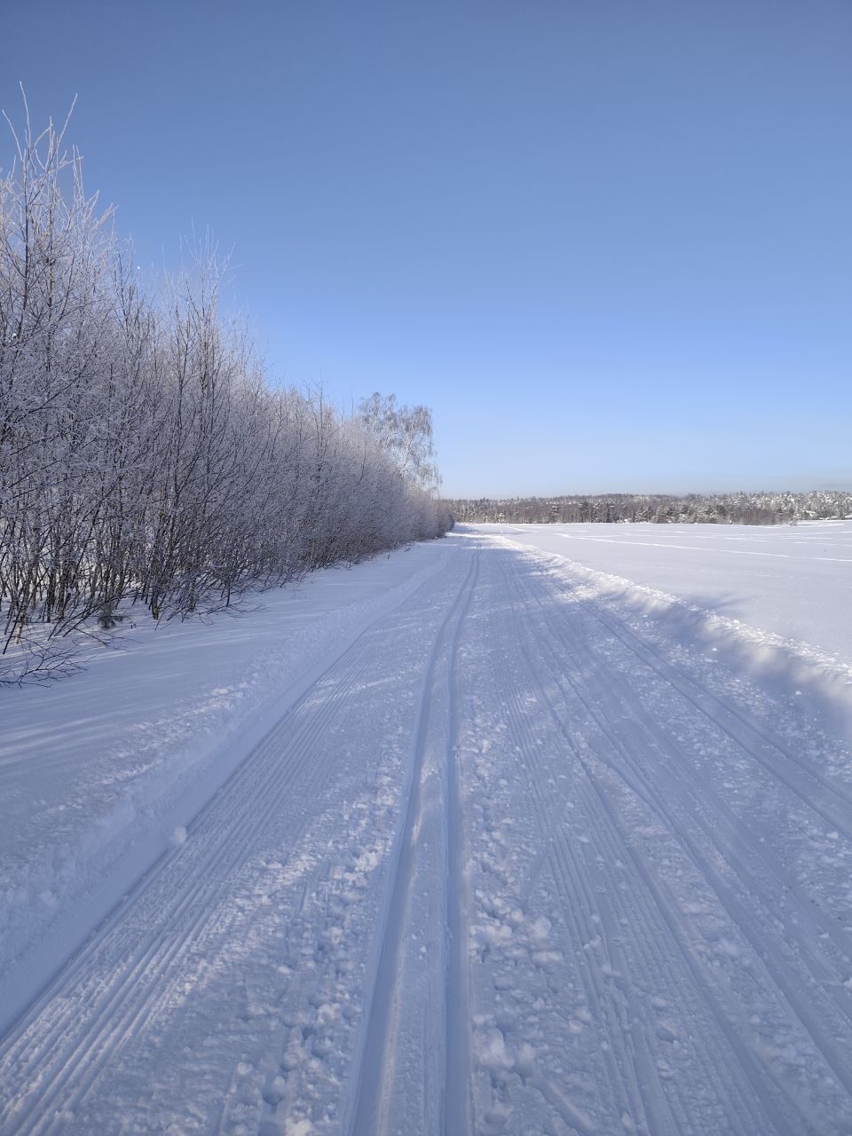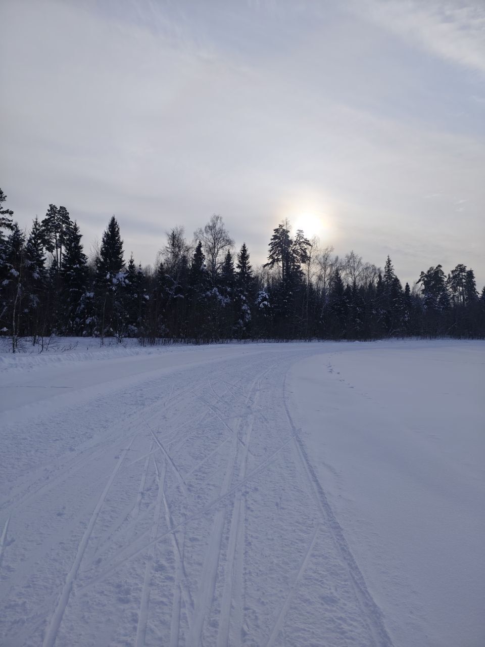 Вчера приехала посмотреть. Вдалеке по полю катался лыжник. По-факту потопталась на старте, увидев лед и землю настрой пропал убивать лыжи) С декабря не готовилась, все таяло-замерзало в итоге трасса на поле выглядит сильно побитой, мб дальше и лучше, проверять не стала.