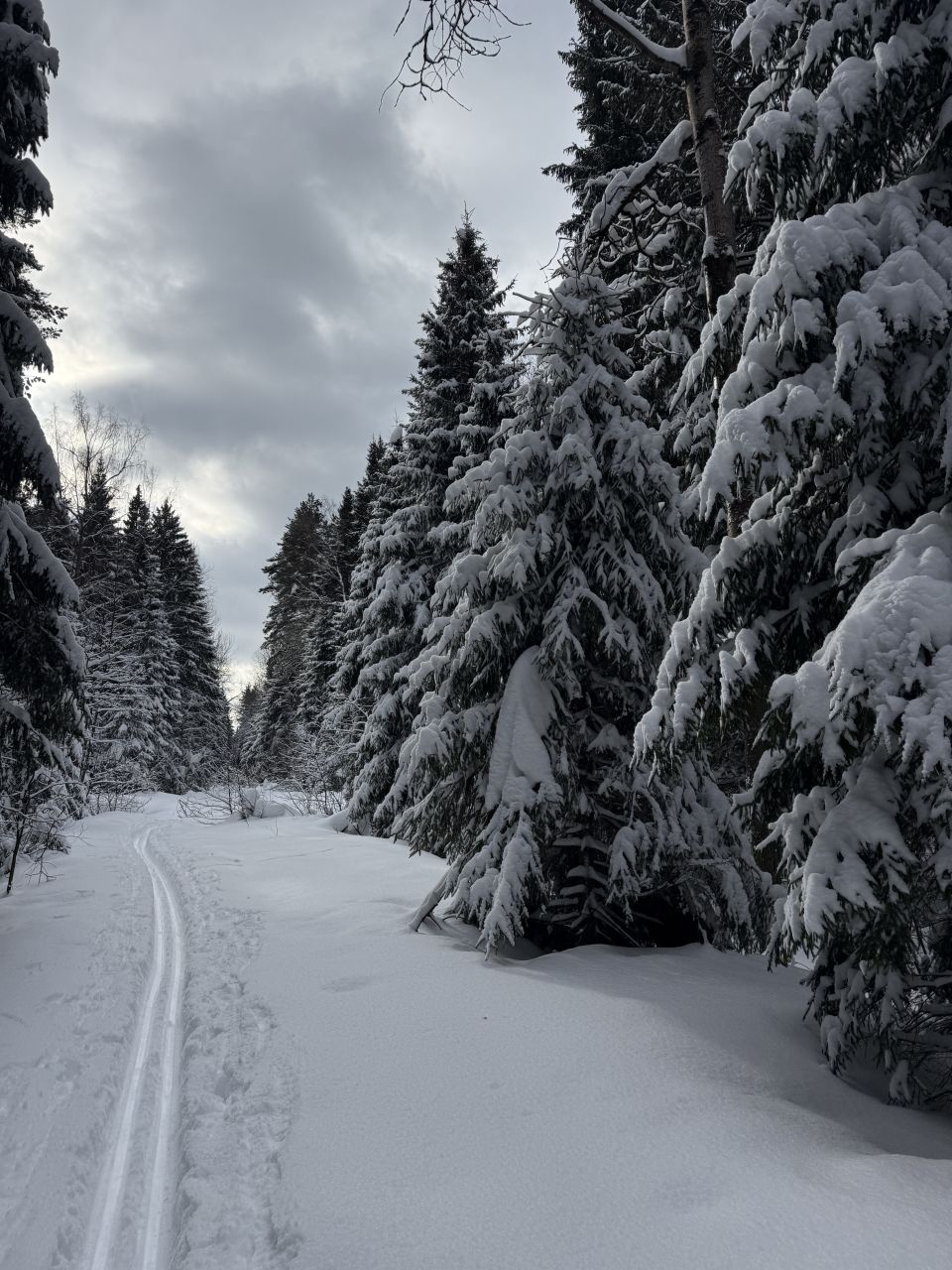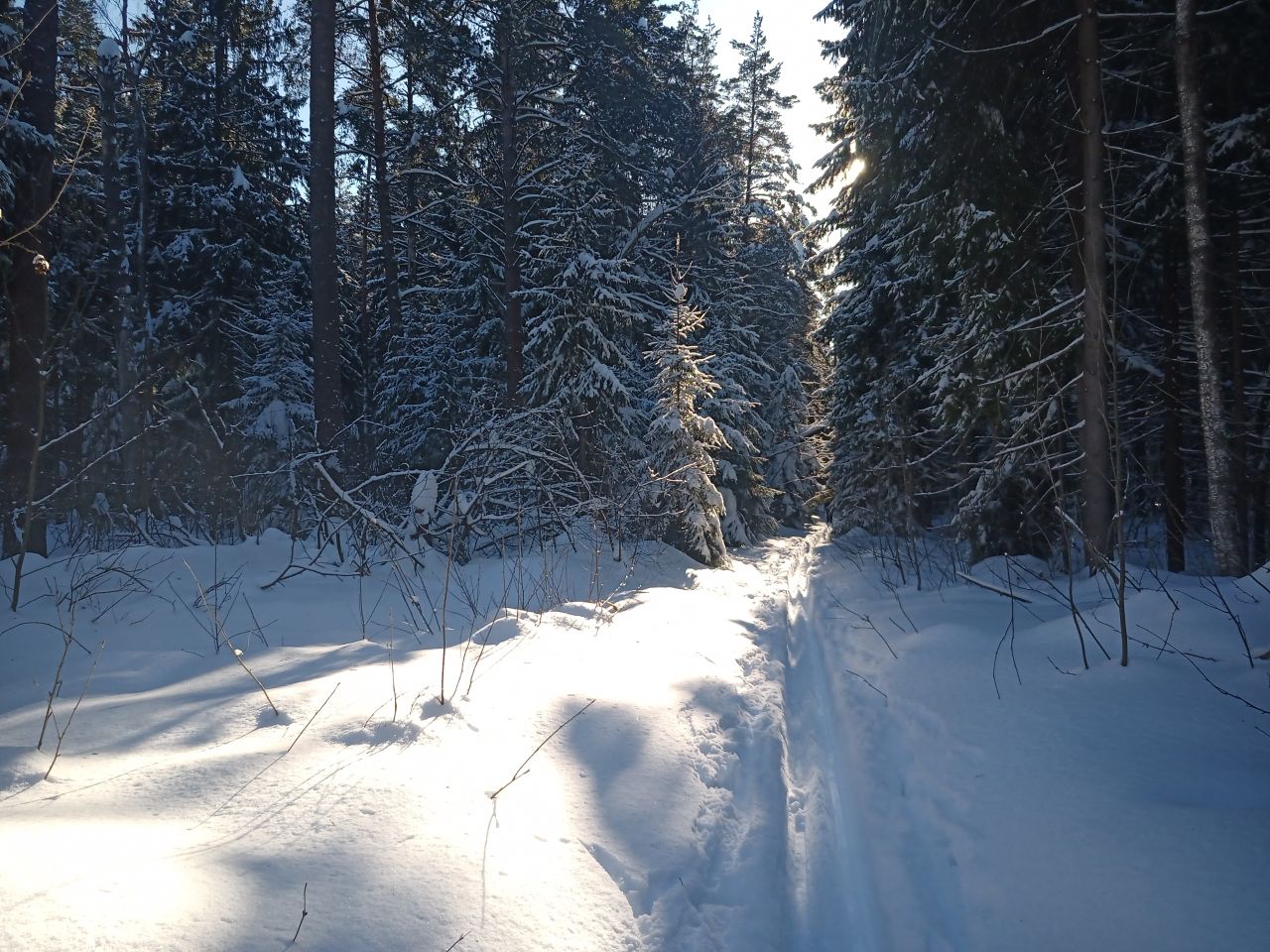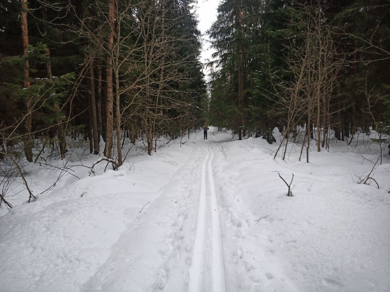 Вышел с утра от Донино на север. Лыжня пока нормальная, чуть присылала ночным снежком. Скольжение хорошее.