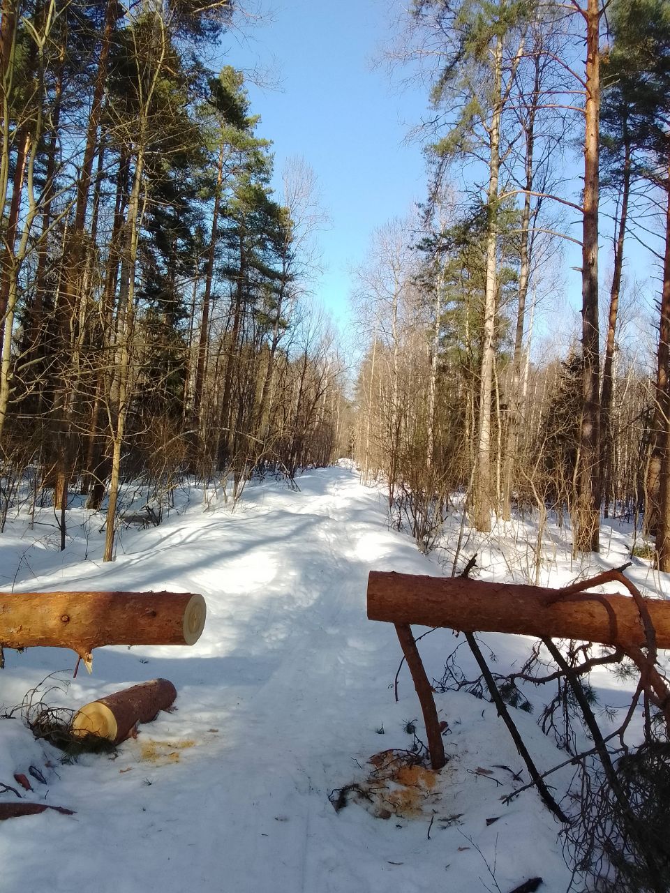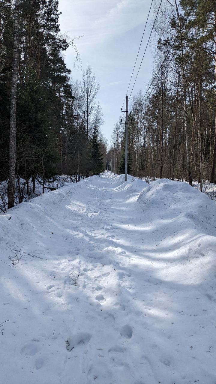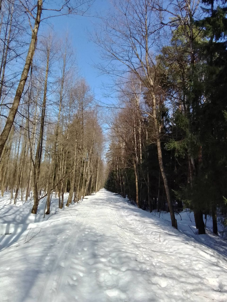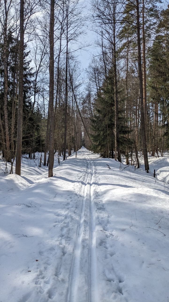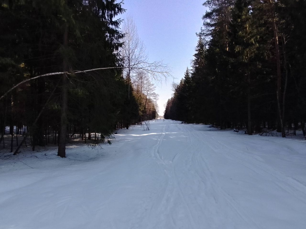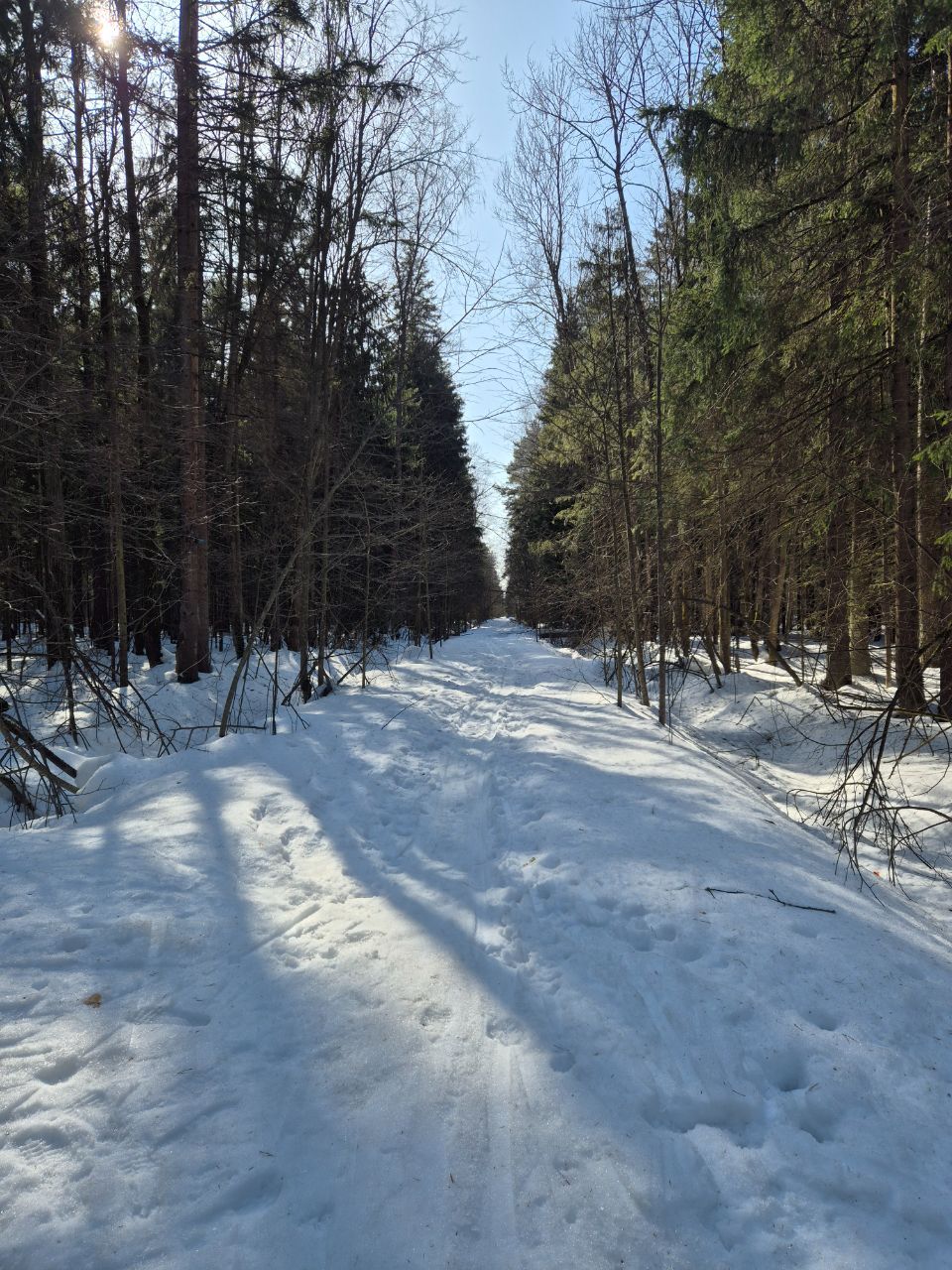 Прошел 13.03.2026 Донинскую просеку полностью, от Поселка имени Воровского (пл.43км) до Есенинской (пл.42км). Впечатления своеобразные. Если кратко, то кажется с севера на юг ее ходят в основном только первые десять километров, прекращая движение у грунтовки обслуживающий многочисленные СНТ, уходя в Донино, или обратно. С юга на север посещают значительно реже, примерно на пятом километре сворачивая влево, на местную "лыжню здоровья". Кусок между этими участками не имеет нормальной плотной основы, а в это время я и лыжных следов там особо не наблюдал. Самый тяжелый участок от железки до шоссе. Там всего несколько сотен метров, но лыжи внезапно проваливаются очень глубоко в наст. Спешиваться там тоже не стоит, так как под снегом натопило воды, да и просто тяжело передвигаться без лыж. И шоссе, и железку стоит проходить снимая лыжи - движение интенсивное. Первые километры и больше на открытых участках по лыжне ботинок чиркал оплывшые от солнца борта лыжни и проще было двигаться рядом, параллельно, где это возможно. Не исключаю, что это моя личная проблема, так как я обладатель утеплённых ботинок 48 размера. Если бы не это, то первые 10 км скольжение было бы хорошим, так как опад хоть и есть, но пока его не много. После ЖД путей и шоссе некоторое время основа жиденькая, но потом становится лучше. А вот лыжня там менее выражена, встречаются следы лосей и людей. Спилил по ходу движения два еловых шлагбаума, слишком низко нависающих над лыжней. После окончания трека прошел на лыжах по поселку до Раменского шоссе. Но скоро этот трюк не удастся, асфальтовые проталины уже в наличии. На 18 км с перерывами на пропил у меня ушло 5 часов. Чисто в движении судя по страве был часа 4.