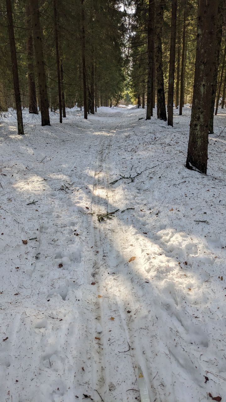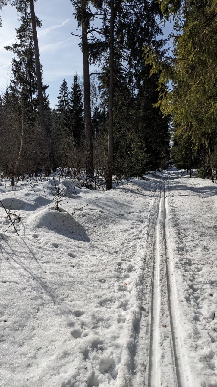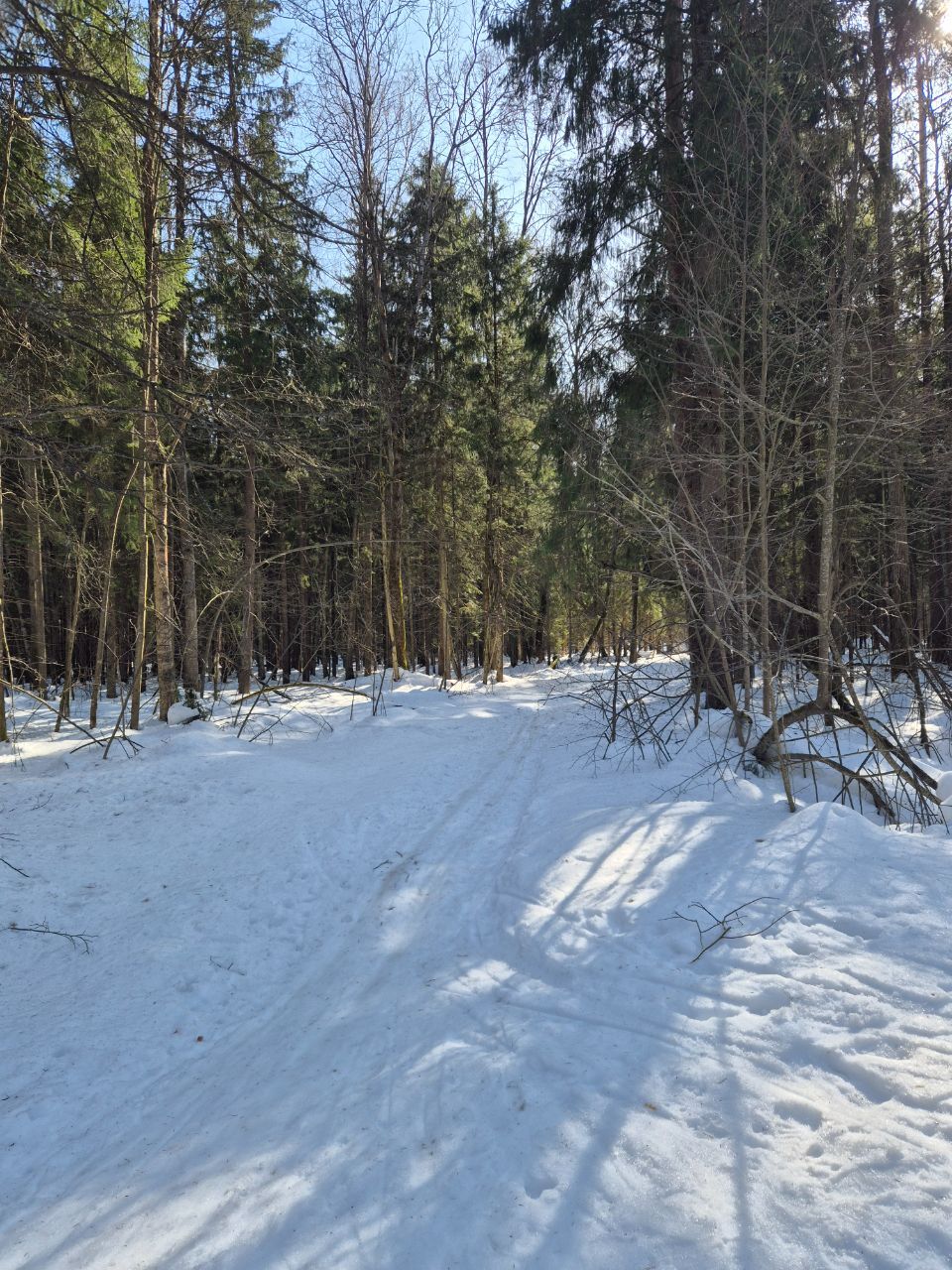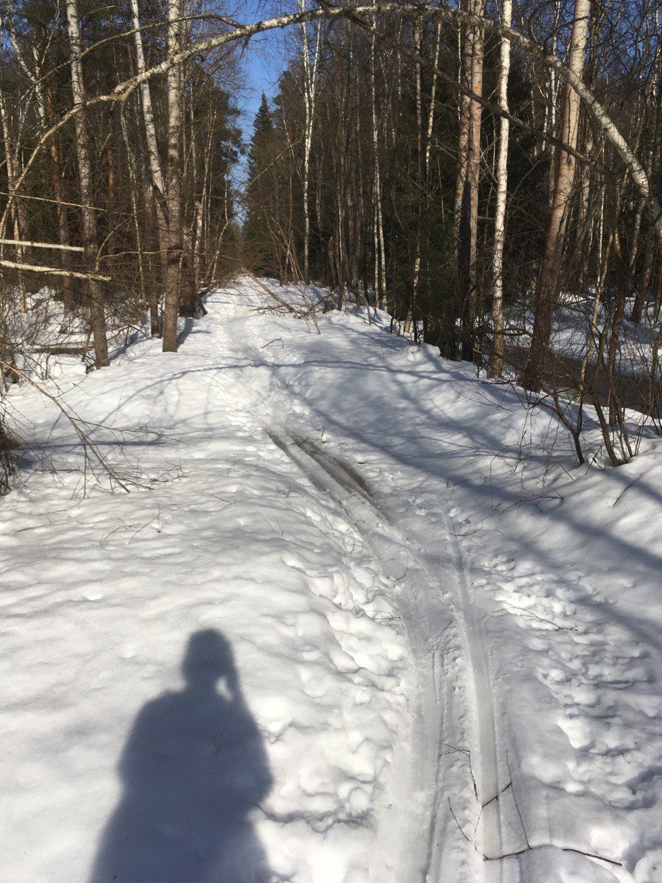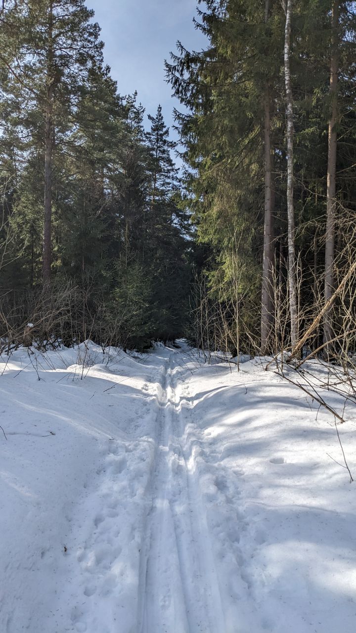 Прошел 13.03.2026 Донинскую просеку полностью, от Поселка имени Воровского (пл.43км) до Есенинской (пл.42км). Впечатления своеобразные. Если кратко, то кажется с севера на юг ее ходят в основном только первые десять километров, прекращая движение у грунтовки обслуживающий многочисленные СНТ, уходя в Донино, или обратно. С юга на север посещают значительно реже, примерно на пятом километре сворачивая влево, на местную "лыжню здоровья". Кусок между этими участками не имеет нормальной плотной основы, а в это время я и лыжных следов там особо не наблюдал. Самый тяжелый участок от железки до шоссе. Там всего несколько сотен метров, но лыжи внезапно проваливаются очень глубоко в наст. Спешиваться там тоже не стоит, так как под снегом натопило воды, да и просто тяжело передвигаться без лыж. И шоссе, и железку стоит проходить снимая лыжи - движение интенсивное. Первые километры и больше на открытых участках по лыжне ботинок чиркал оплывшые от солнца борта лыжни и проще было двигаться рядом, параллельно, где это возможно. Не исключаю, что это моя личная проблема, так как я обладатель утеплённых ботинок 48 размера. Если бы не это, то первые 10 км скольжение было бы хорошим, так как опад хоть и есть, но пока его не много. После ЖД путей и шоссе некоторое время основа жиденькая, но потом становится лучше. А вот лыжня там менее выражена, встречаются следы лосей и людей. Спилил по ходу движения два еловых шлагбаума, слишком низко нависающих над лыжней. После окончания трека прошел на лыжах по поселку до Раменского шоссе. Но скоро этот трюк не удастся, асфальтовые проталины уже в наличии. На 18 км с перерывами на пропил у меня ушло 5 часов. Чисто в движении судя по страве был часа 4.