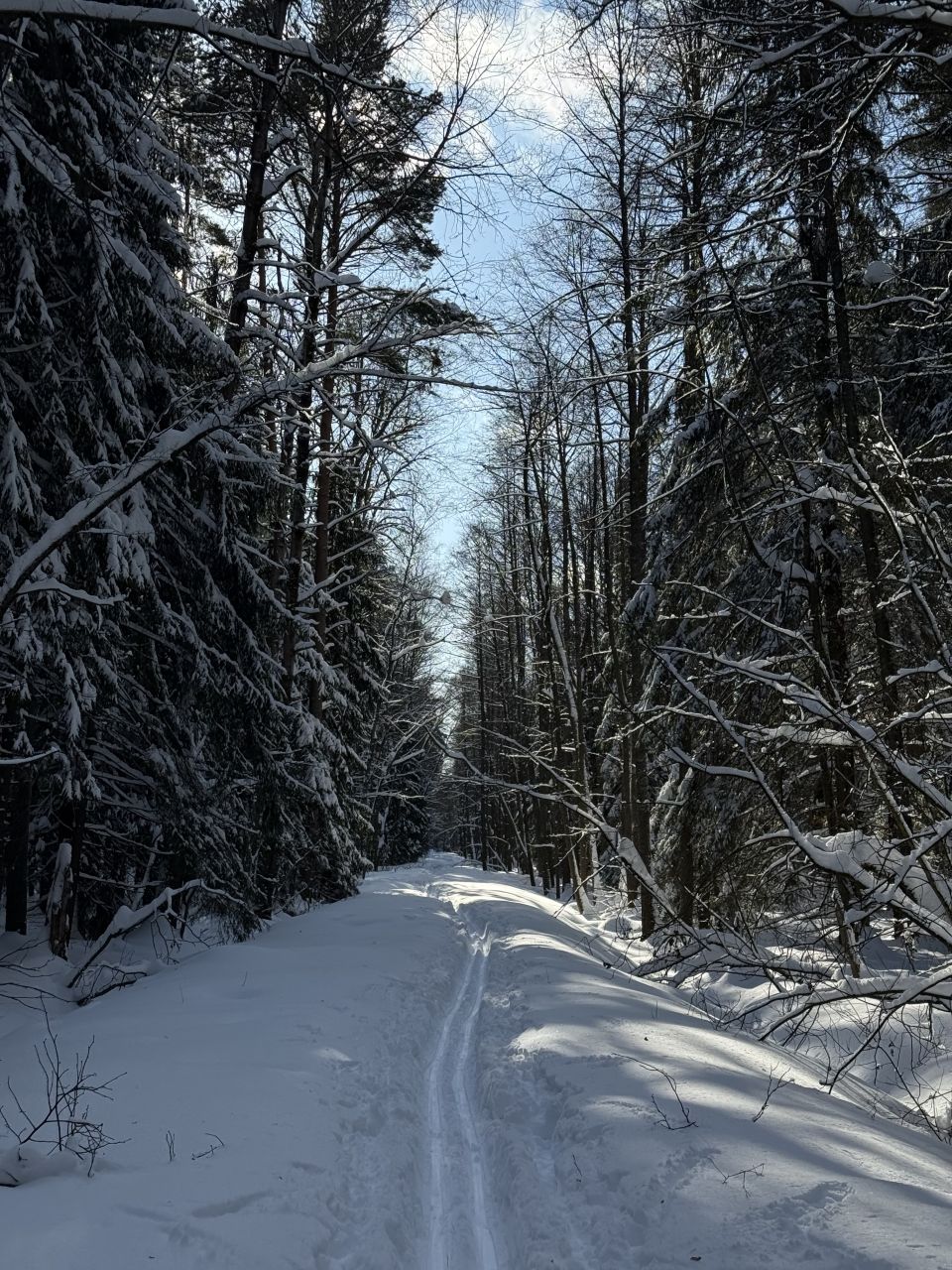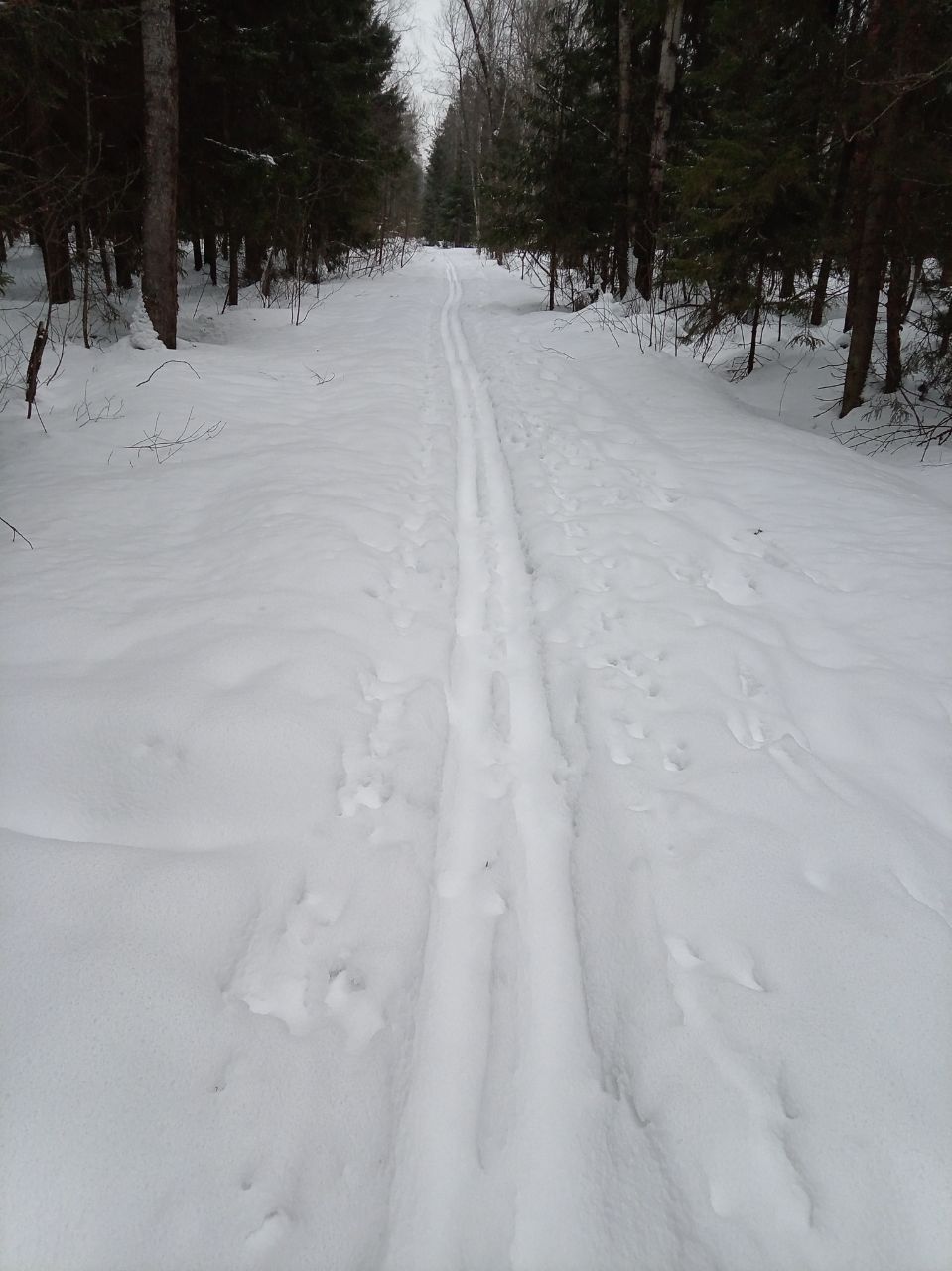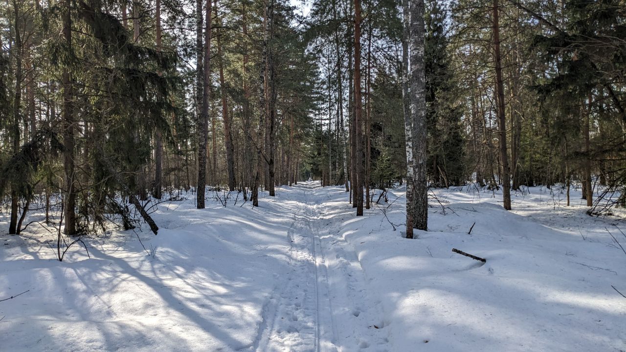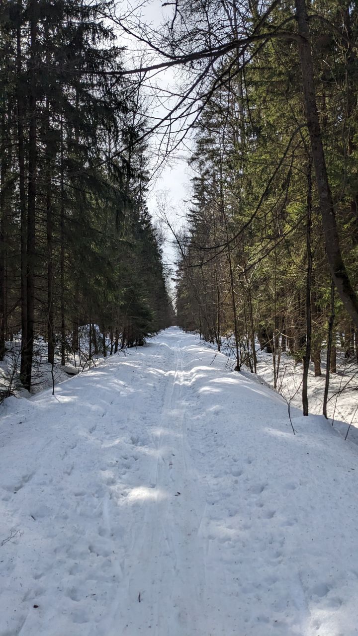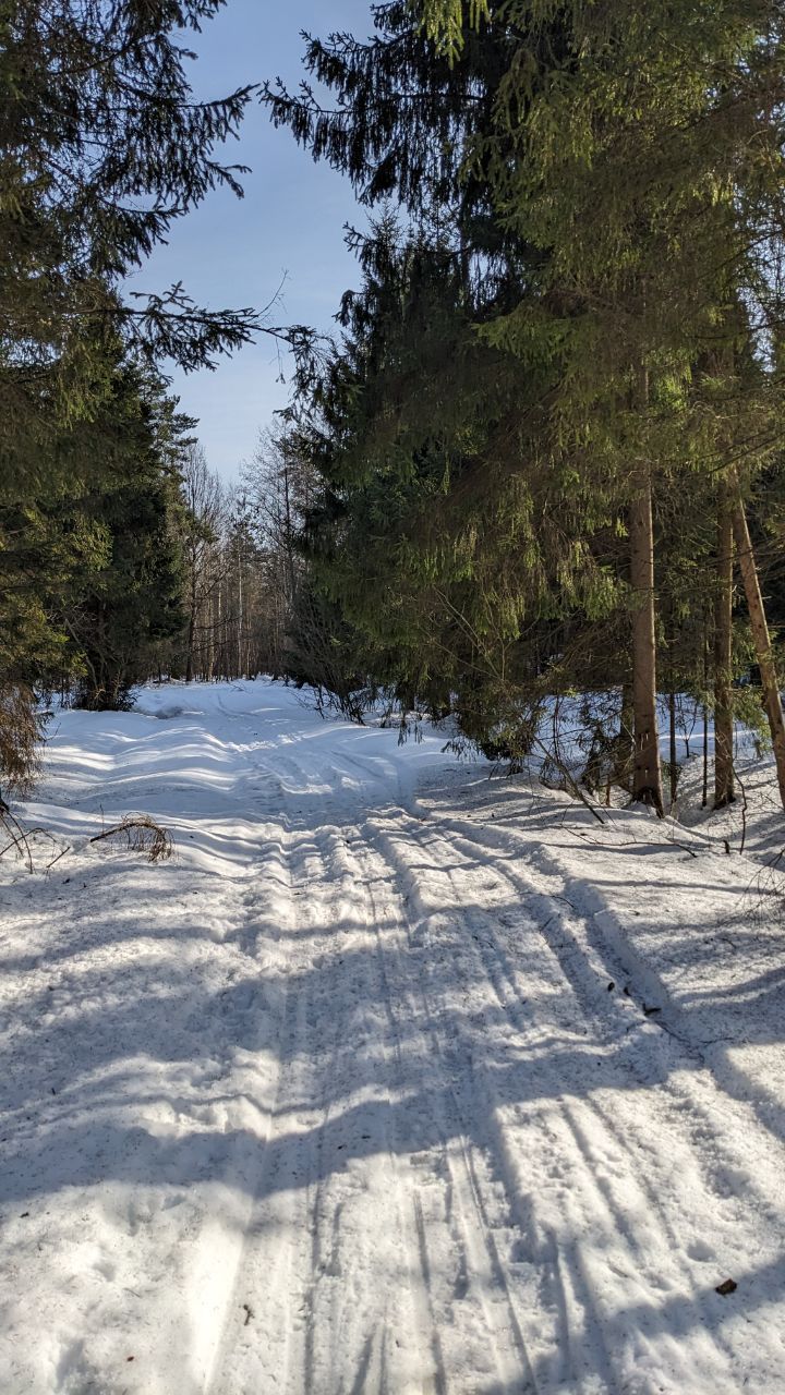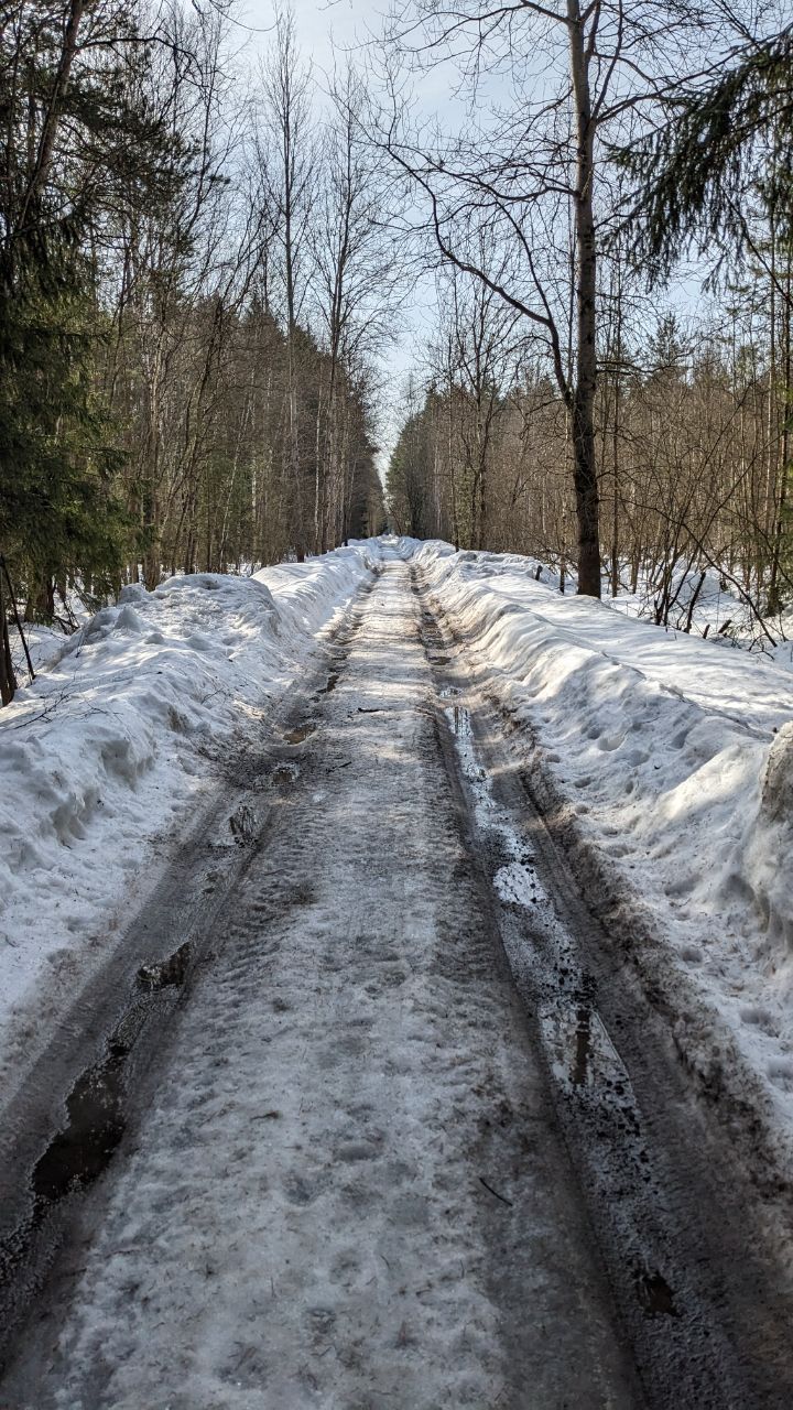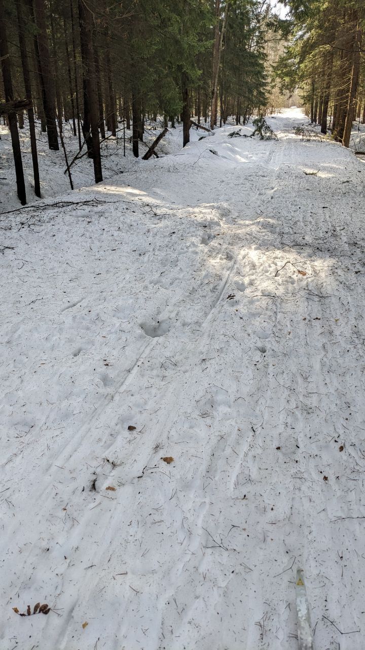 Прошел 13.03.2026 Донинскую просеку полностью, от Поселка имени Воровского (пл.43км) до Есенинской (пл.42км). Впечатления своеобразные. Если кратко, то кажется с севера на юг ее ходят в основном только первые десять километров, прекращая движение у грунтовки обслуживающий многочисленные СНТ, уходя в Донино, или обратно. С юга на север посещают значительно реже, примерно на пятом километре сворачивая влево, на местную "лыжню здоровья". Кусок между этими участками не имеет нормальной плотной основы, а в это время я и лыжных следов там особо не наблюдал. Самый тяжелый участок от железки до шоссе. Там всего несколько сотен метров, но лыжи внезапно проваливаются очень глубоко в наст. Спешиваться там тоже не стоит, так как под снегом натопило воды, да и просто тяжело передвигаться без лыж. И шоссе, и железку стоит проходить снимая лыжи - движение интенсивное. Первые километры и больше на открытых участках по лыжне ботинок чиркал оплывшые от солнца борта лыжни и проще было двигаться рядом, параллельно, где это возможно. Не исключаю, что это моя личная проблема, так как я обладатель утеплённых ботинок 48 размера. Если бы не это, то первые 10 км скольжение было бы хорошим, так как опад хоть и есть, но пока его не много. После ЖД путей и шоссе некоторое время основа жиденькая, но потом становится лучше. А вот лыжня там менее выражена, встречаются следы лосей и людей. Спилил по ходу движения два еловых шлагбаума, слишком низко нависающих над лыжней. После окончания трека прошел на лыжах по поселку до Раменского шоссе. Но скоро этот трюк не удастся, асфальтовые проталины уже в наличии. На 18 км с перерывами на пропил у меня ушло 5 часов. Чисто в движении судя по страве был часа 4.