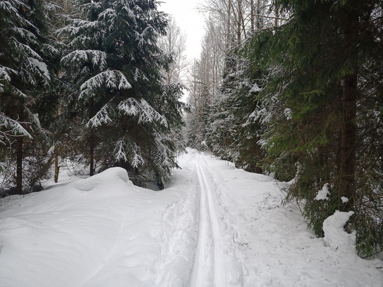 Вышел с утра от Донино на север. Лыжня пока нормальная, чуть присылала ночным снежком. Скольжение хорошее.