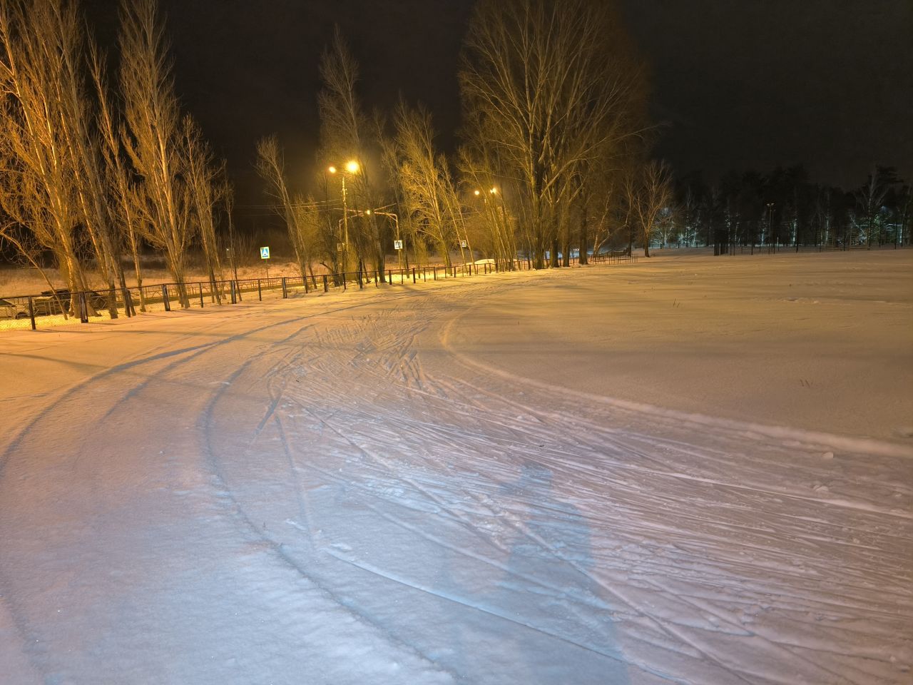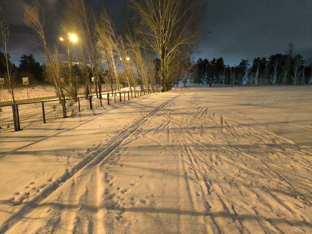 Нападало еще снега, и по стадиону проехал снегоход с бороной. Остались пара мест, где можно немного достать лыжами до земли. И снегоход поднял много шышек из под снега. Поубирал их как мог, пока руки не замерзли.