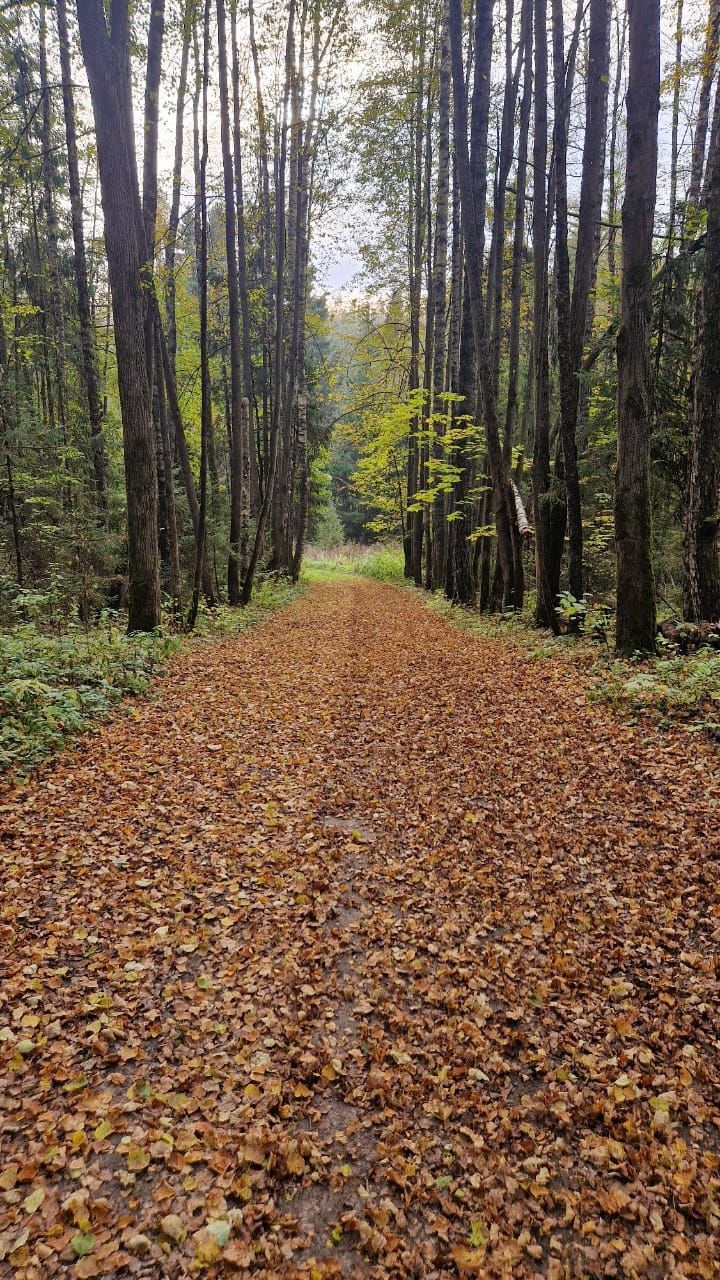 На открытых участках терренкура получился красивый зелёный газон! А в лесной части, в елово-березо-основном лесу - ковёр из опавших золотистых листьев!