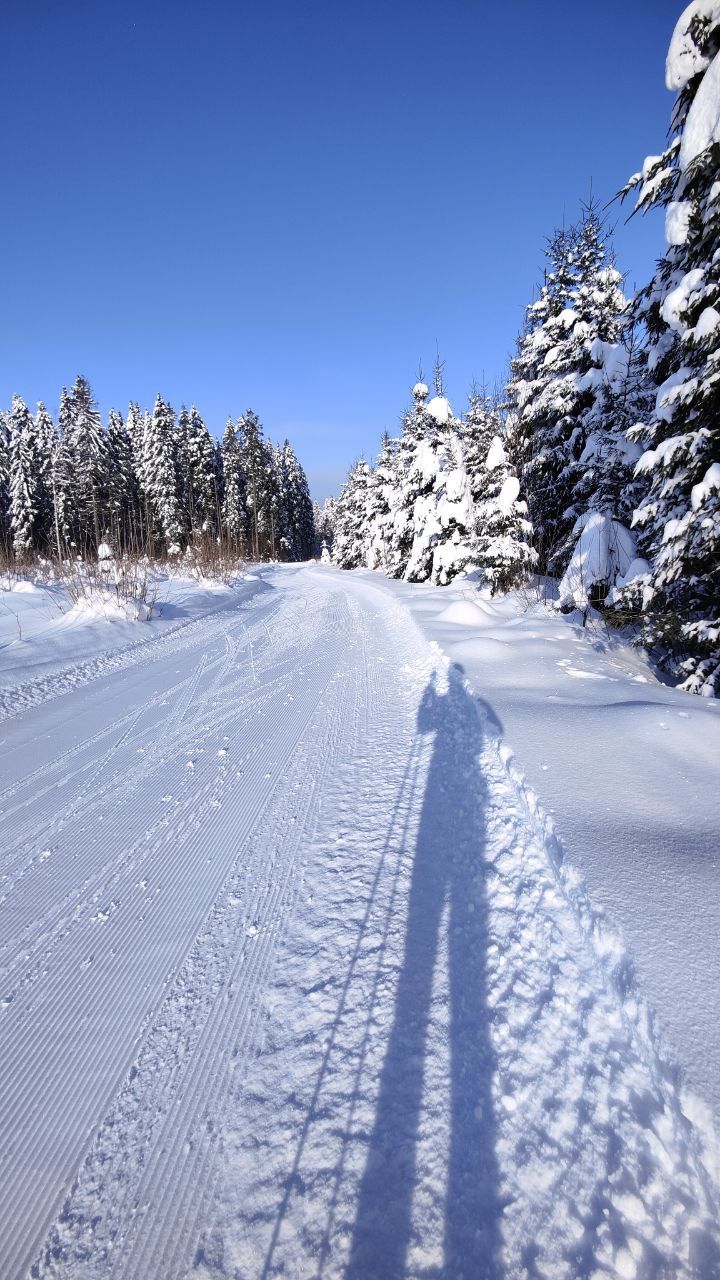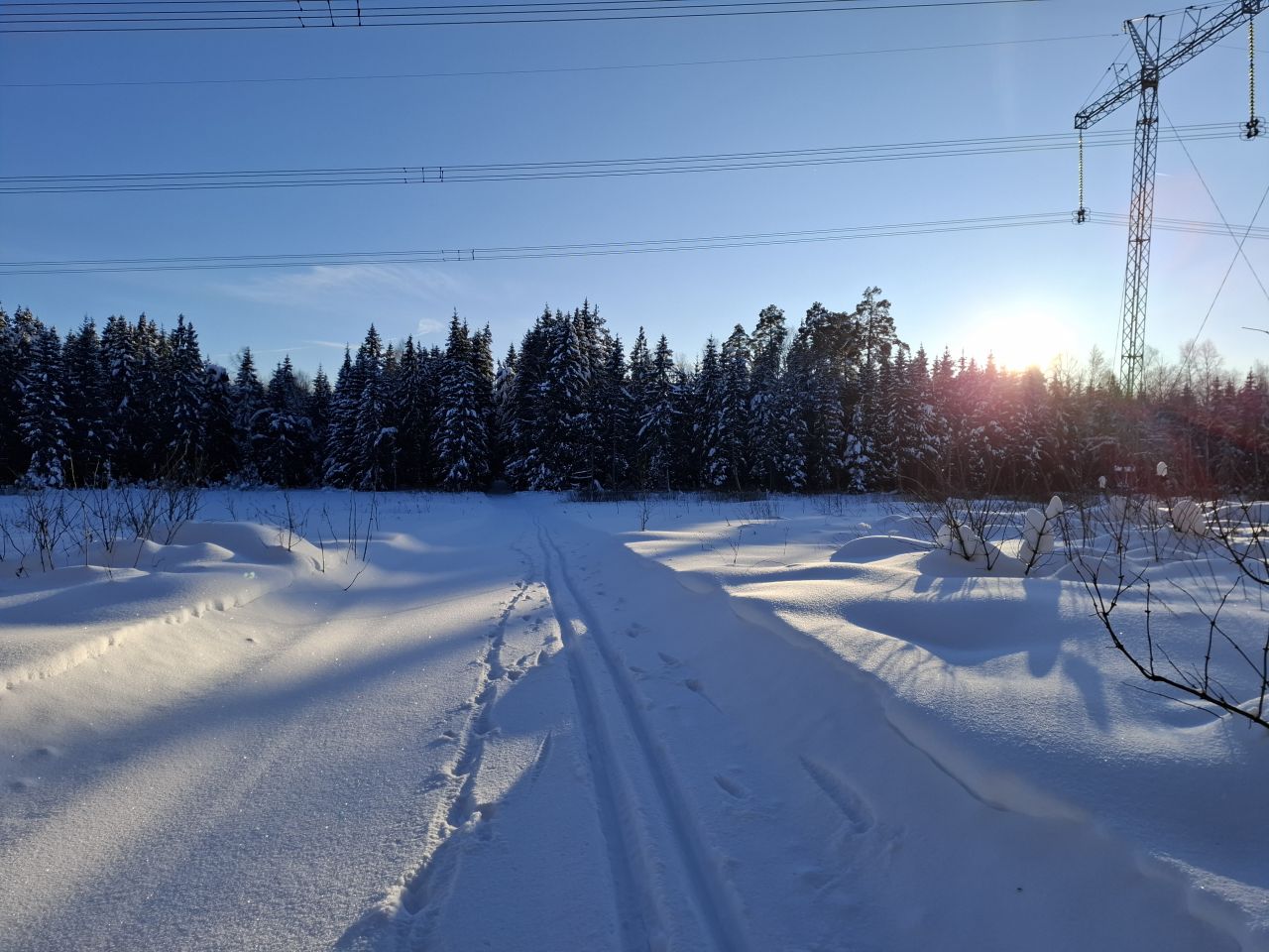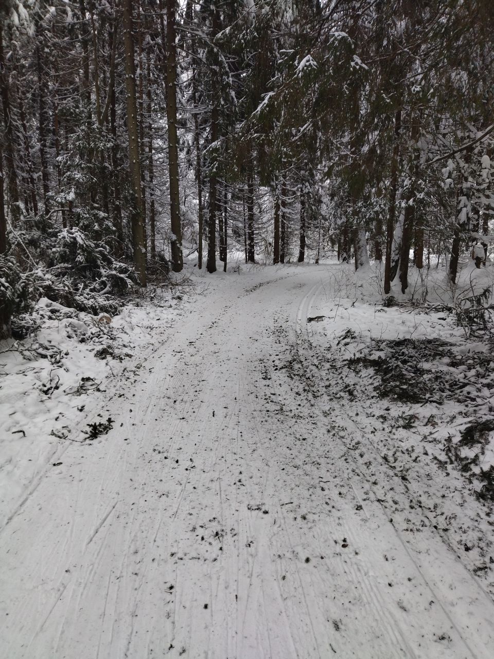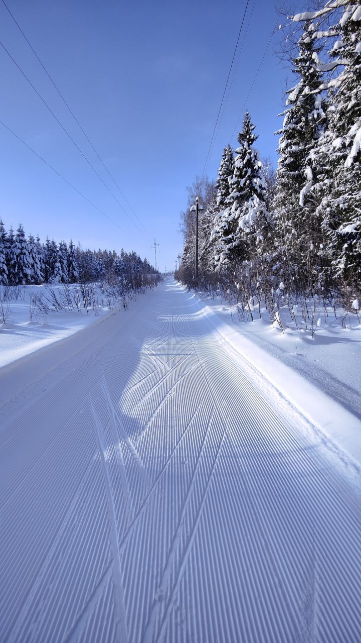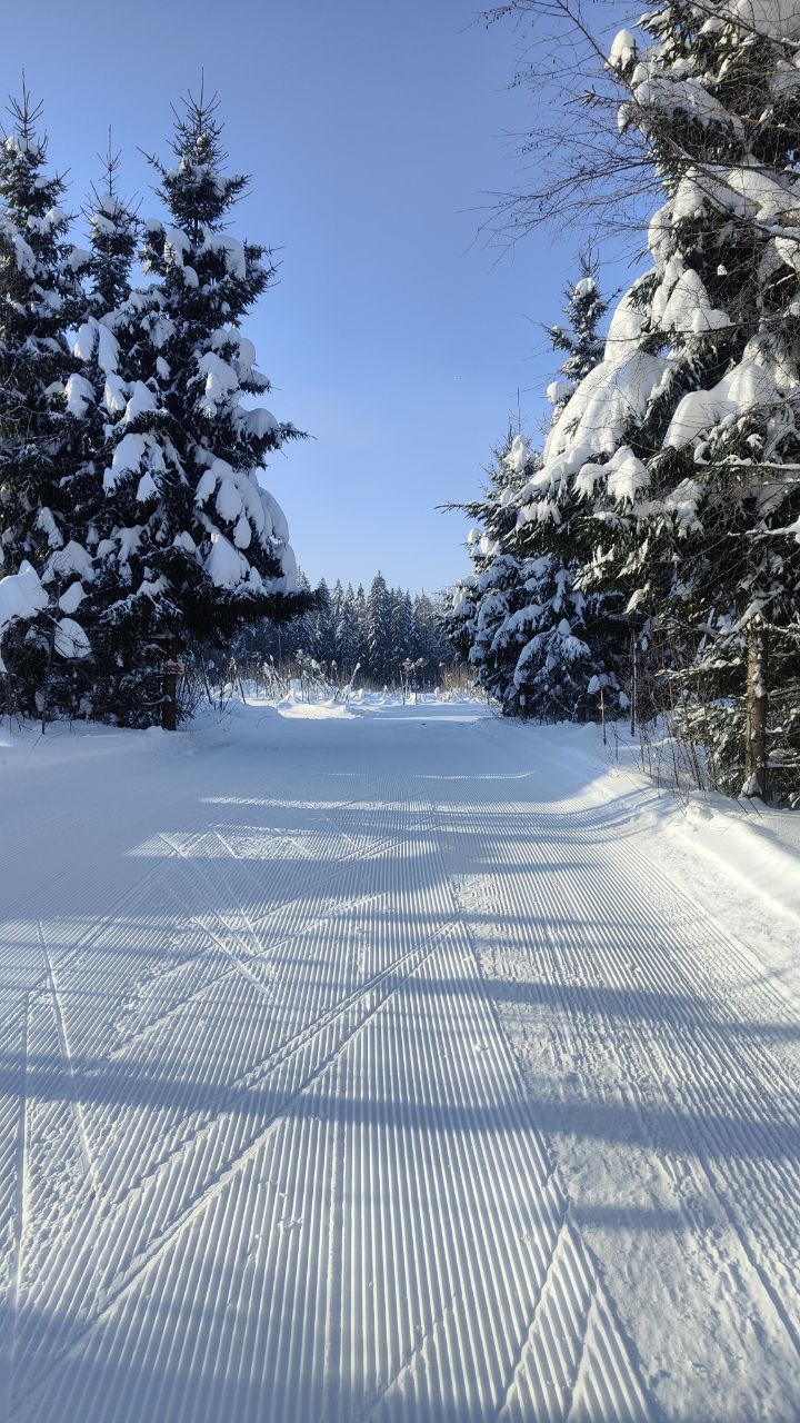 Народу мало, скольжение медленное, морозное. Трасса отлично подготовлена. Встречаются кочки снега с деревьев, еловый мусор местами, но всё это мелочи жизни