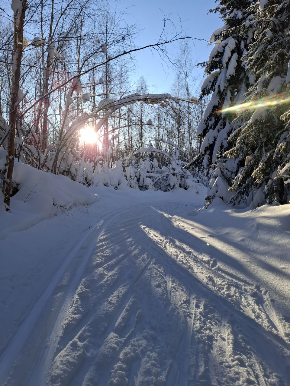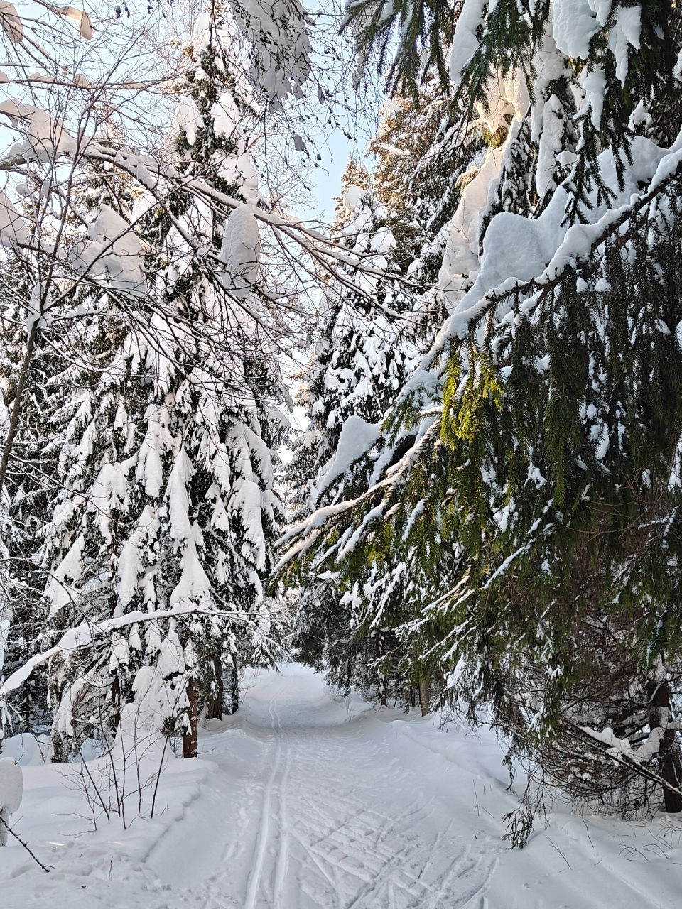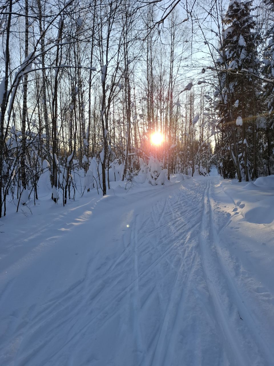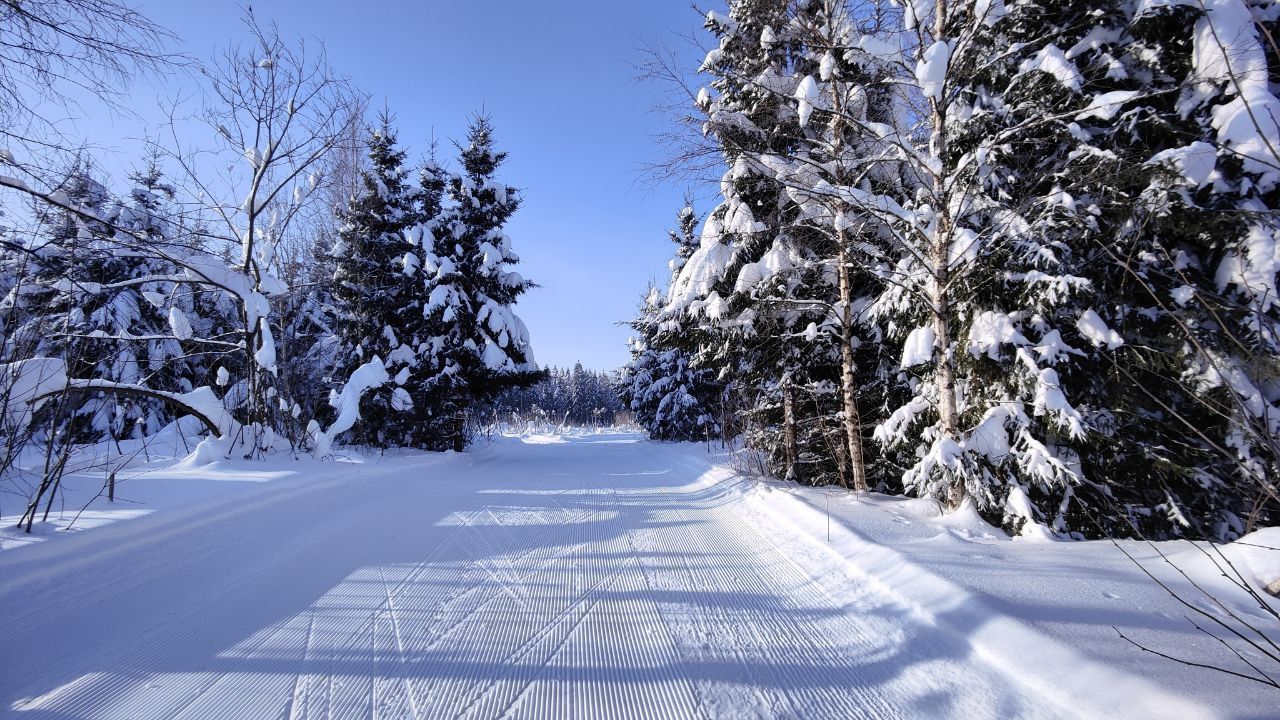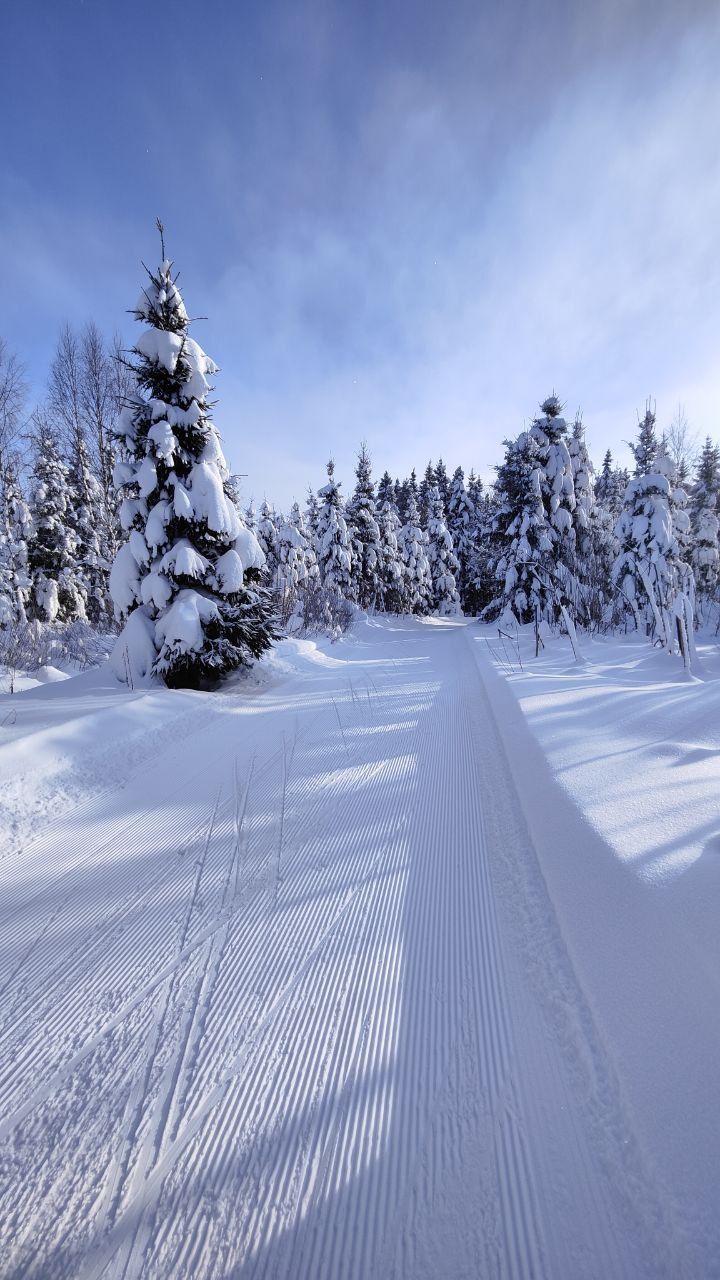 Народу мало, скольжение медленное, морозное. Трасса отлично подготовлена. Встречаются кочки снега с деревьев, еловый мусор местами, но всё это мелочи жизни