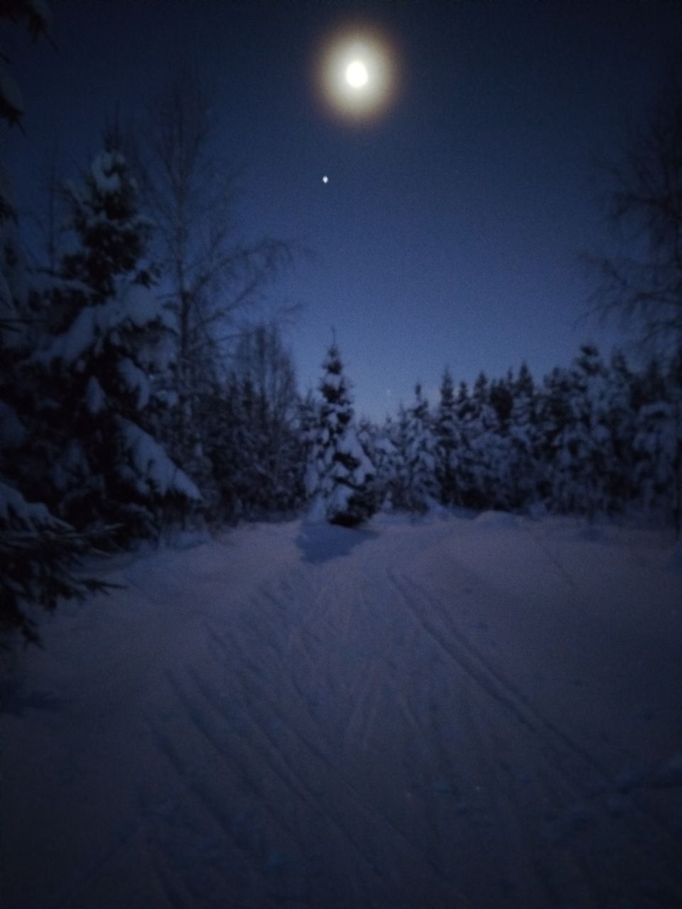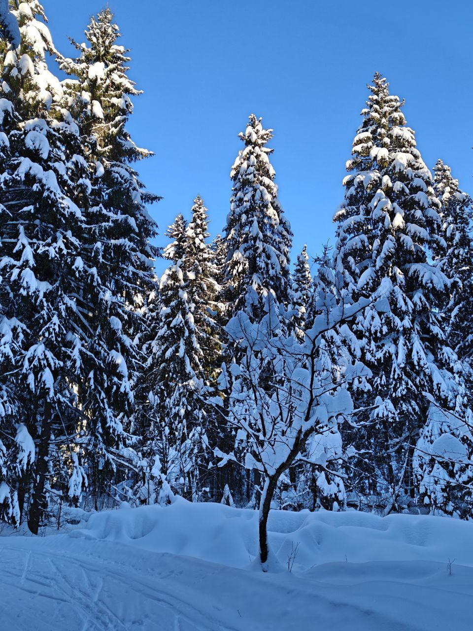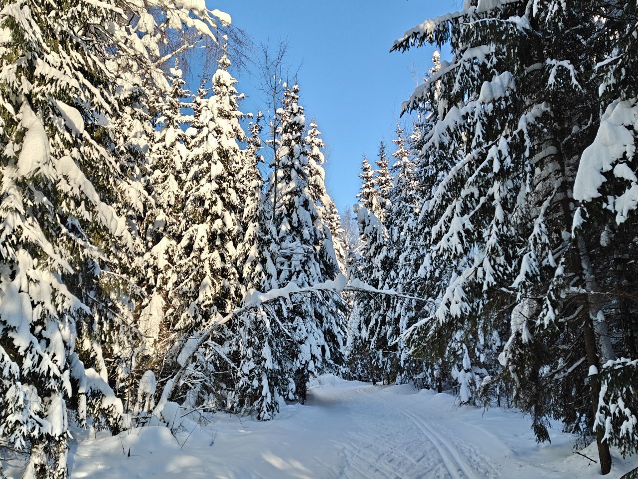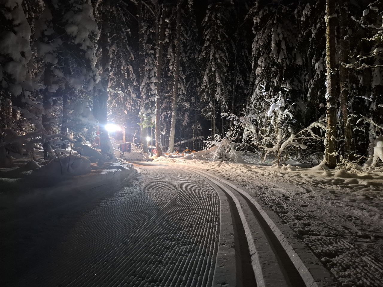 Народу мало, скольжение медленное, морозное. Трасса отлично подготовлена. Встречаются кочки снега с деревьев, еловый мусор местами, но всё это мелочи жизни