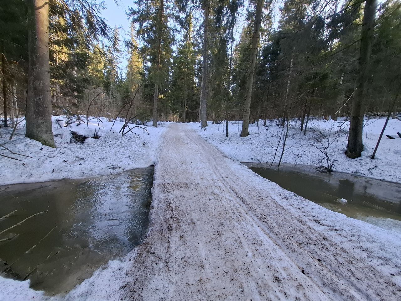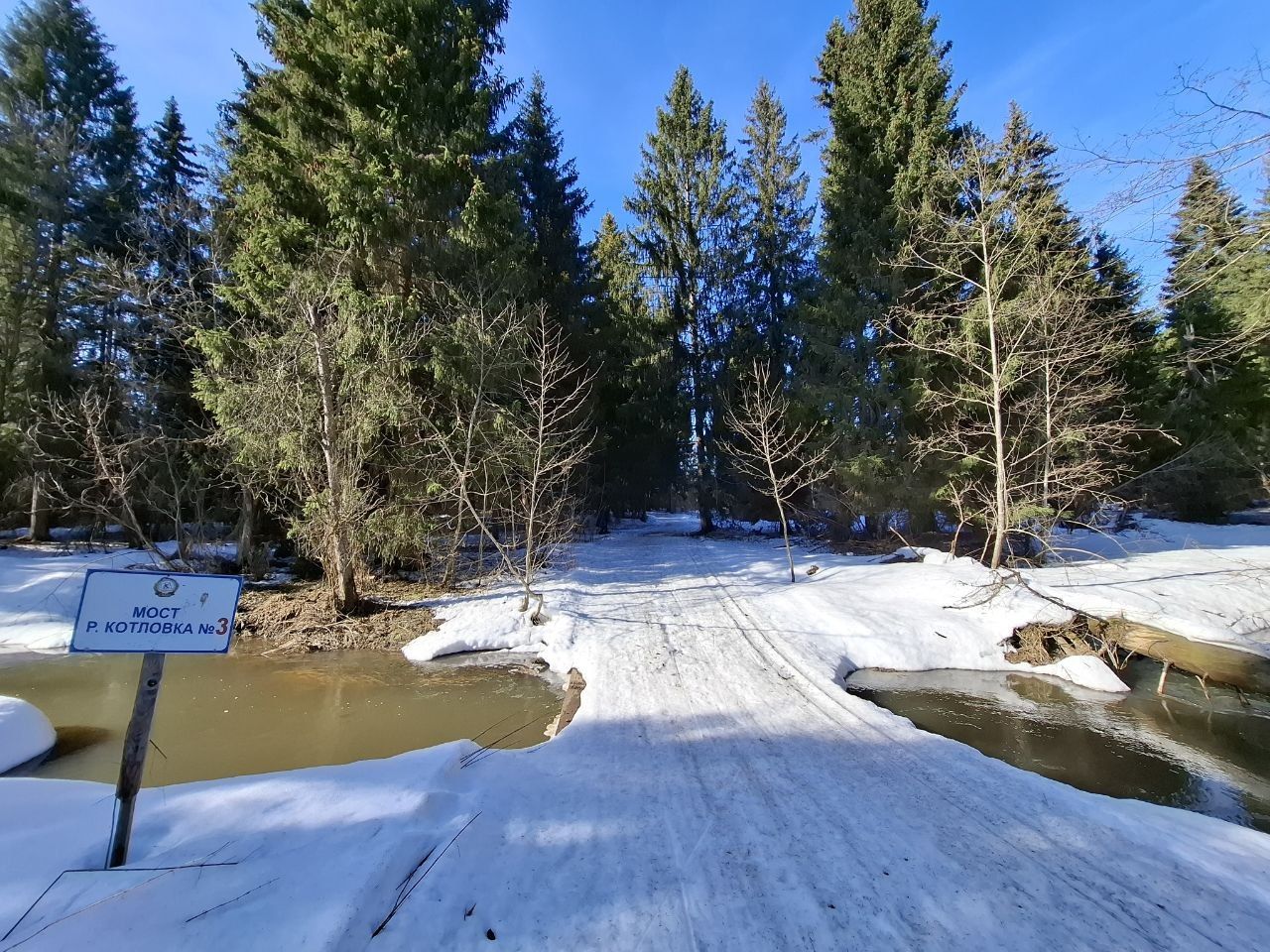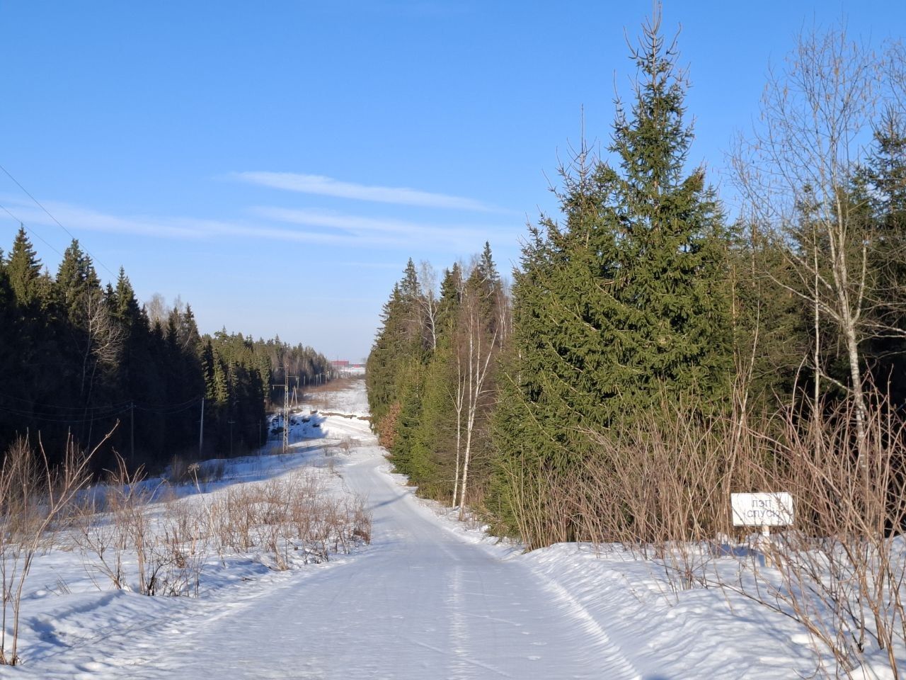 Снег ещё есть, грязно по соснами, стартовая площадка ещё держится, но стартовать лучше в лесу, уже есть разрыв.