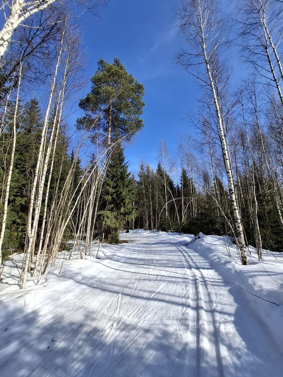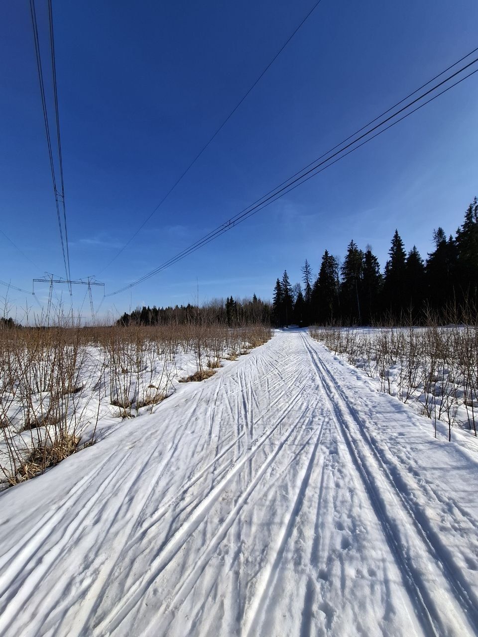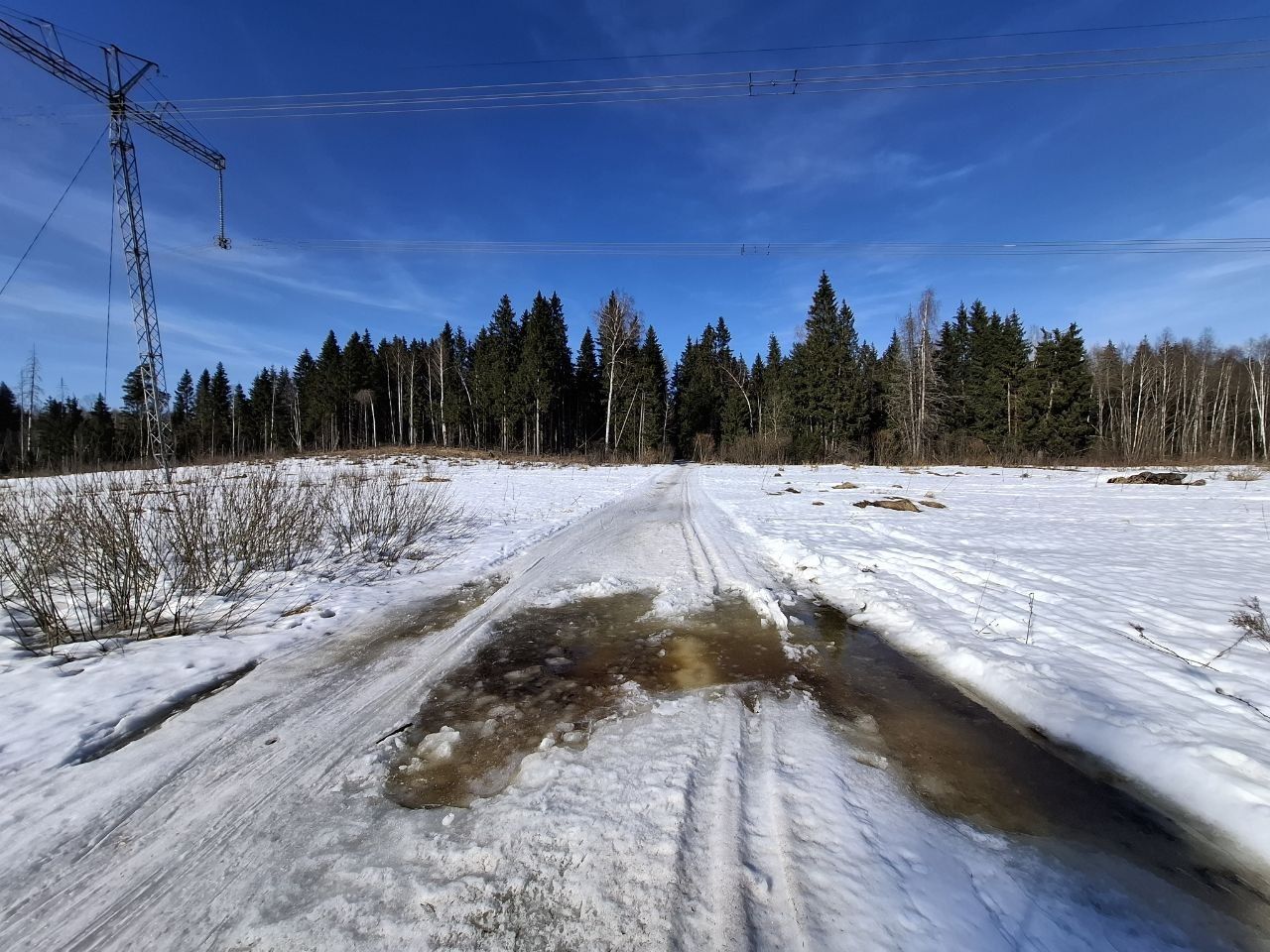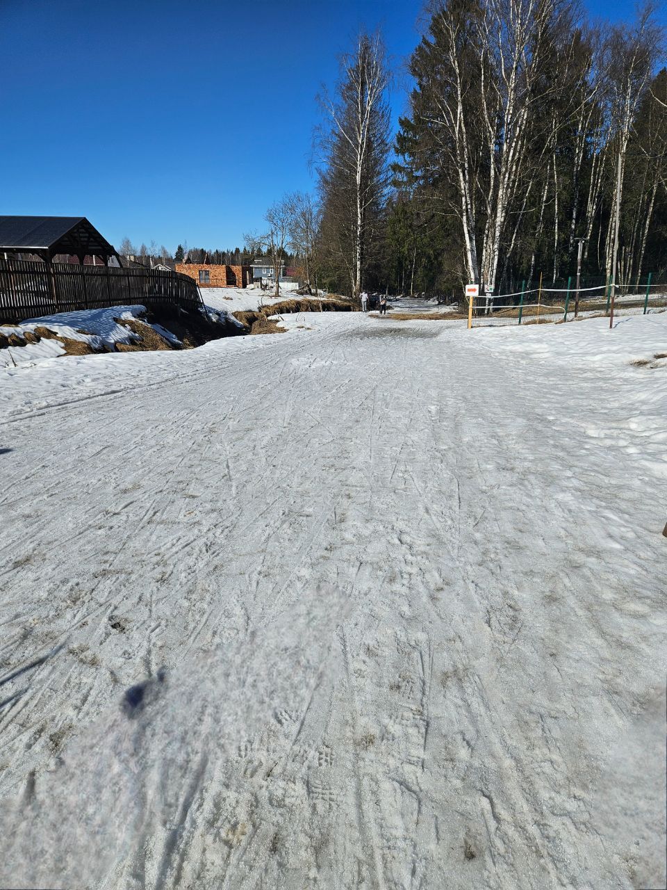Снег ещё есть, грязно по соснами, стартовая площадка ещё держится, но стартовать лучше в лесу, уже есть разрыв.
