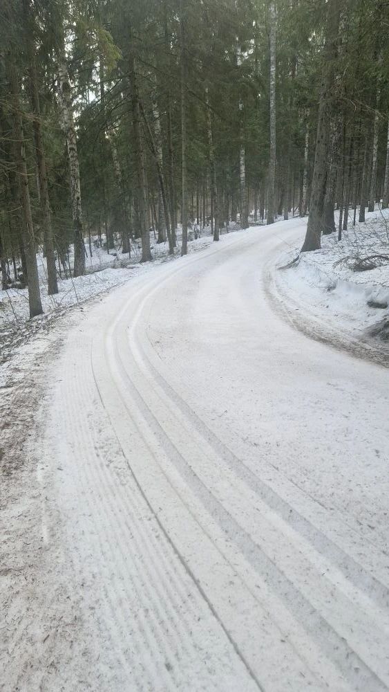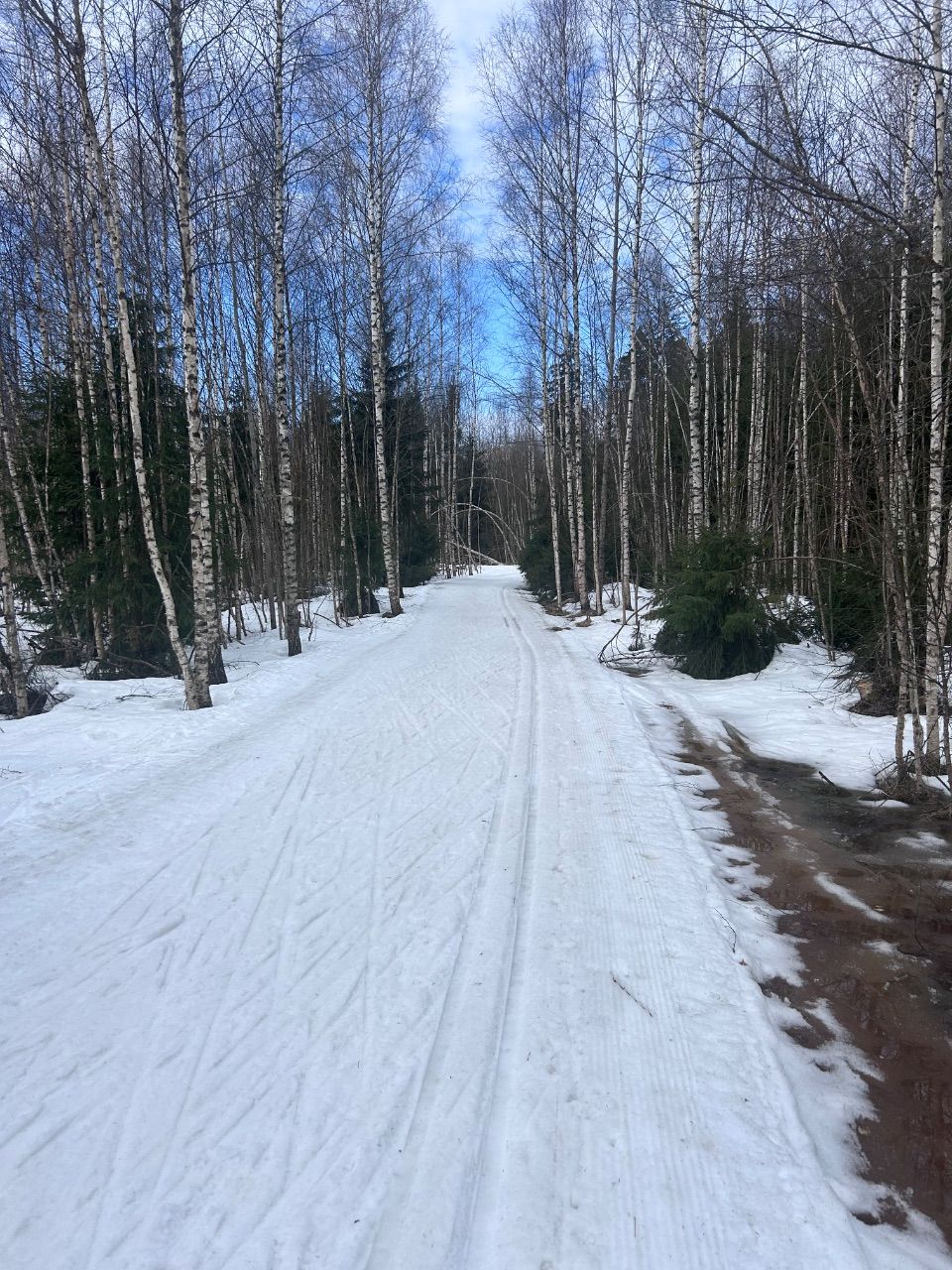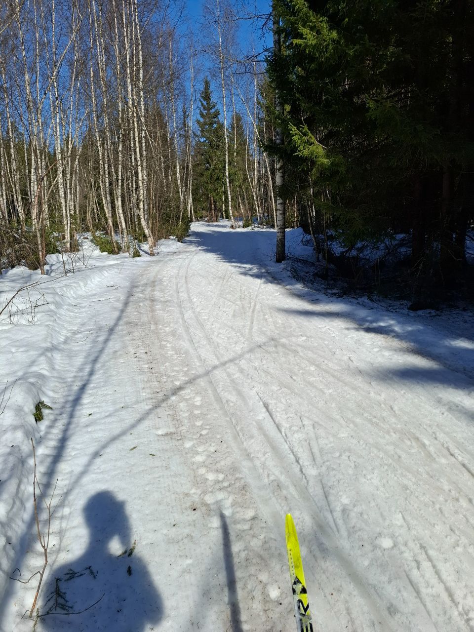 Из неприятного - есть на весь круг 4-5 мест где до земли уже растаяло, но метров по 5-10, в целом не проблема, можно и перебежать (помним про плохие лыжи). В 2-3х местах разлилась река - мост 3 и 4, там лежат какие то бревна, можно по ним перебраться. Лесные петли мастера и любителя местами грязноваты, но даблом неспешно можно протолкаться, хотя часто даже внезапно чистая лыжня есть. Спуски лучше поспокойнее проходить на всякий случай. А так выглядит грязно, но нигде не продергивает и колом не стоит.