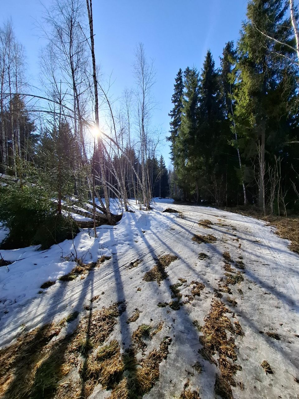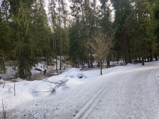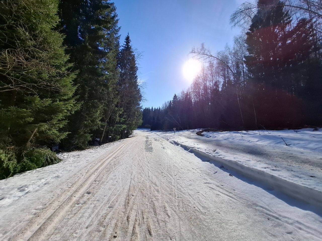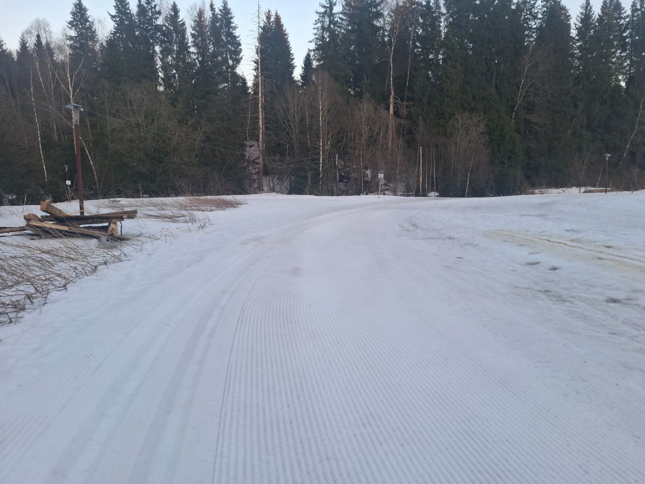 Из неприятного - есть на весь круг 4-5 мест где до земли уже растаяло, но метров по 5-10, в целом не проблема, можно и перебежать (помним про плохие лыжи). В 2-3х местах разлилась река - мост 3 и 4, там лежат какие то бревна, можно по ним перебраться. Лесные петли мастера и любителя местами грязноваты, но даблом неспешно можно протолкаться, хотя часто даже внезапно чистая лыжня есть. Спуски лучше поспокойнее проходить на всякий случай. А так выглядит грязно, но нигде не продергивает и колом не стоит.