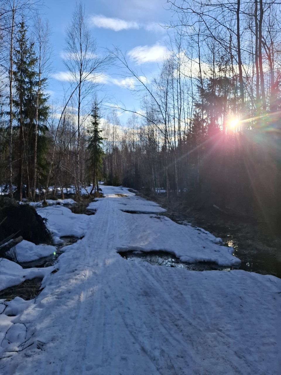 ГАБО потихоньку тоже сдается. Кусок от подъема на турист до первого моста разорвался на первом повороте и до моста уже не доехать. Местами уже тонкая подушка льда прглядыыает и земля, но пока мало. Живо по чути 2 куска: от поворота до конца спуска и обратно, где то 1.5 км в одну сторону, с реверсом круг 3 км,от горы до поворота с реверсом 1.2 км. При желании можно метров 10 разрыва перебежать по земле. Круг при вьезде пока еще можно ехать, но он уже плох. Любитель не проехжаем, стартовая поляна все.