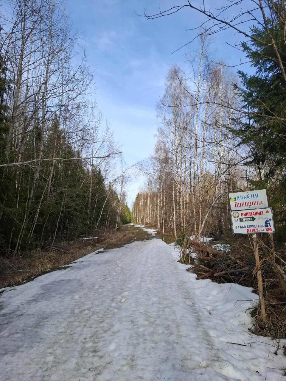 Можно кататься от таблички «Лыжня Ворошина» и до конца первого спуска на Туристе (до указателя «100» км) и обратно — на этом участке крупных разрывов нет, все проблемные места объезжаются скраю, по снегу.