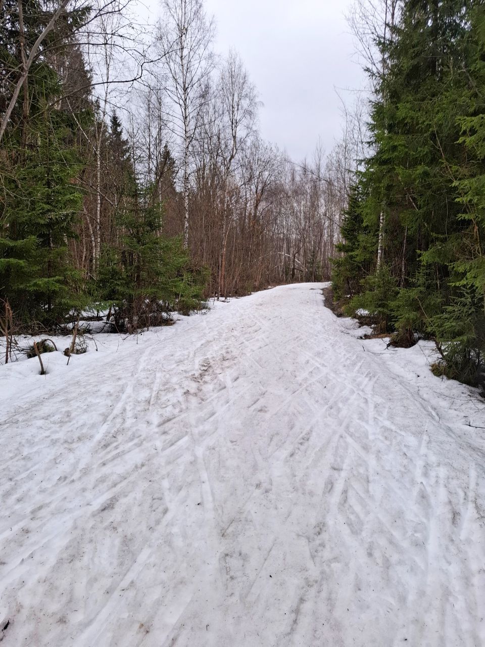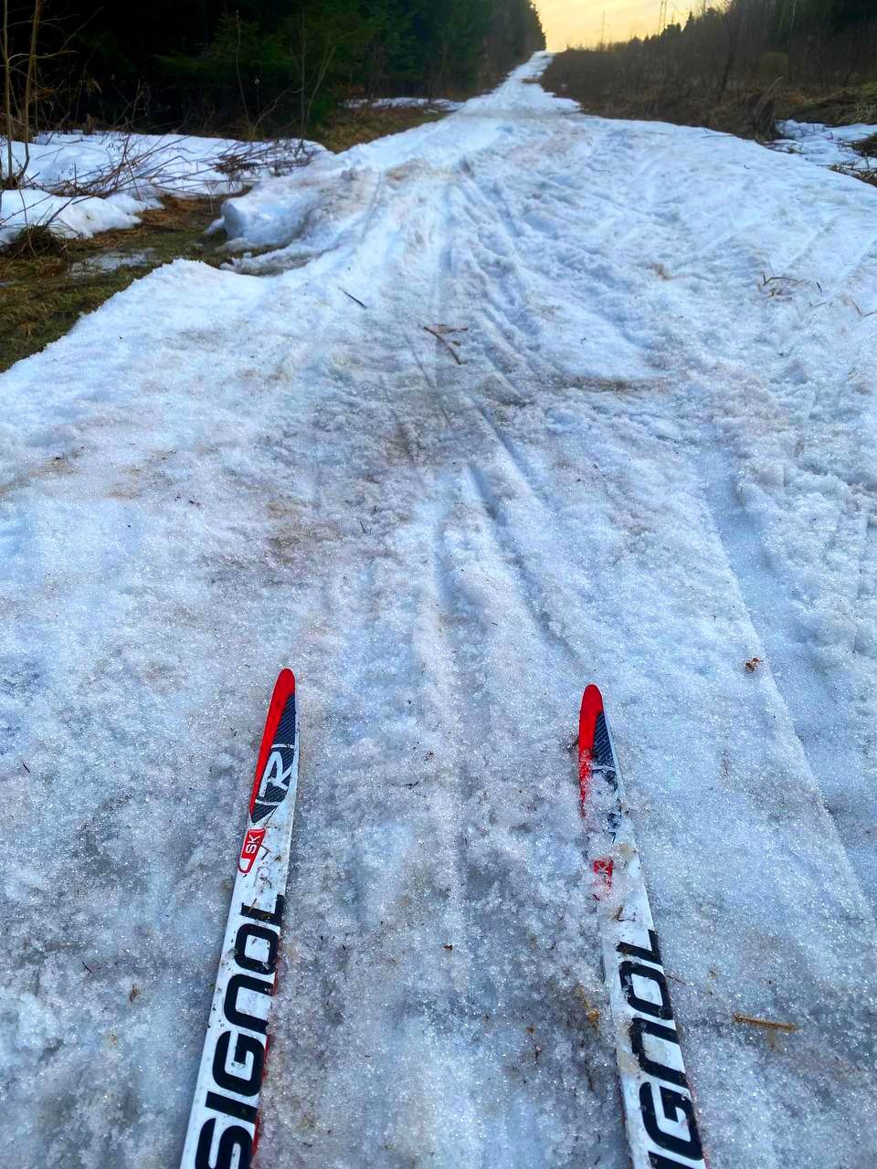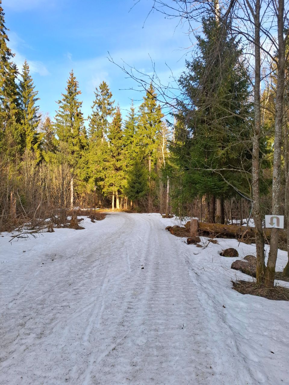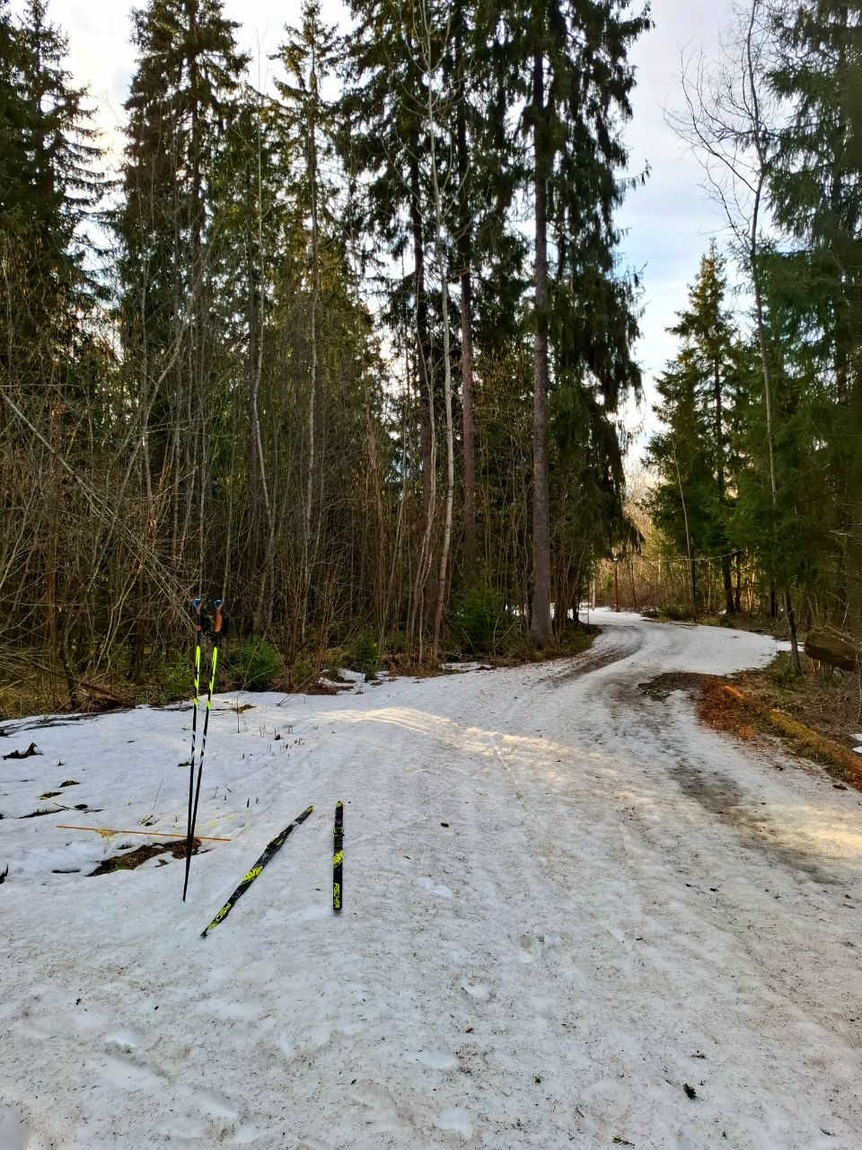 Сегодня по кругу экстрим-марафона от Северных ворот еще было вполне катабельно. Свежий снежок прикрыл хвою и не растаял. Только один перешаг через проталину после "заячьей петли".