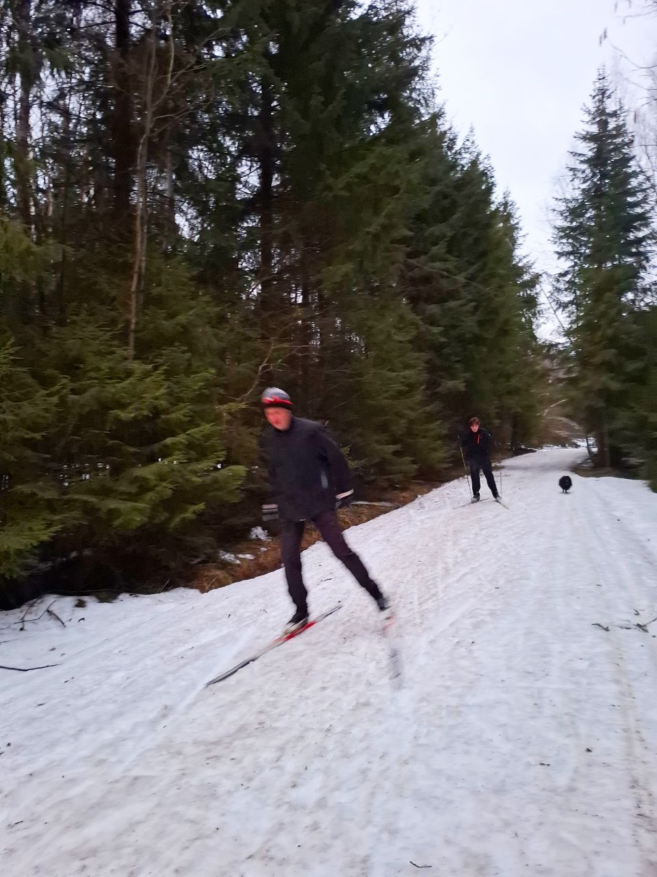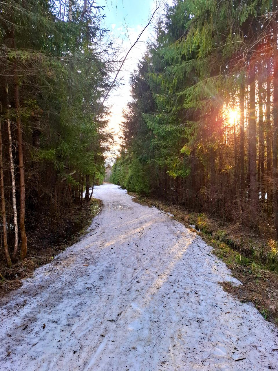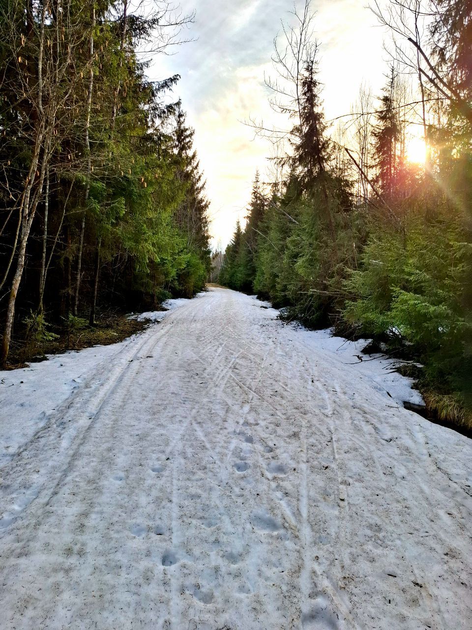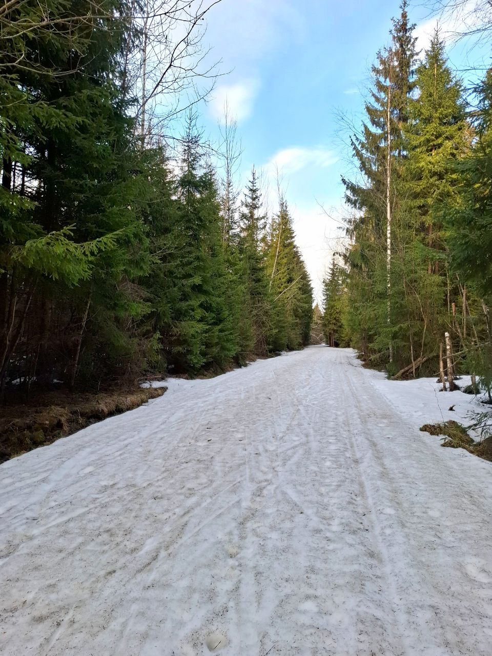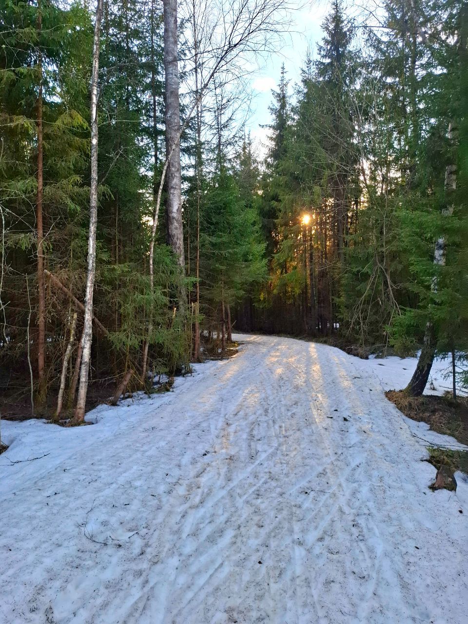 Сегодня по кругу экстрим-марафона от Северных ворот еще было вполне катабельно. Свежий снежок прикрыл хвою и не растаял. Только один перешаг через проталину после "заячьей петли".