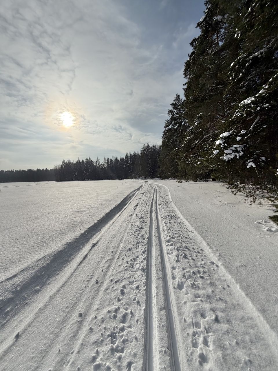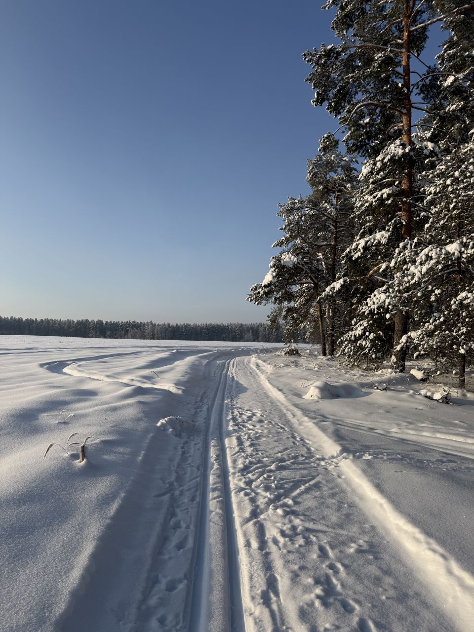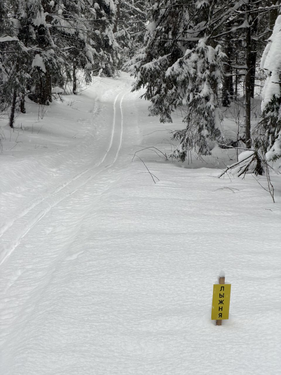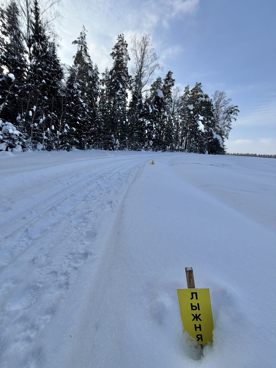 Готовится снегоходом под классику, периодически (к выходным и/или после снегопадов), но достаточно регулярно. Общая протяженность в районе 10 км, конфигурация время от времени чуть меняется. Рельеф щадящий, для спортсменов будет скучновато, для умеренных физкультурников самое то. Плоские поля и лес с небольшим рельефом. Есть указатели.