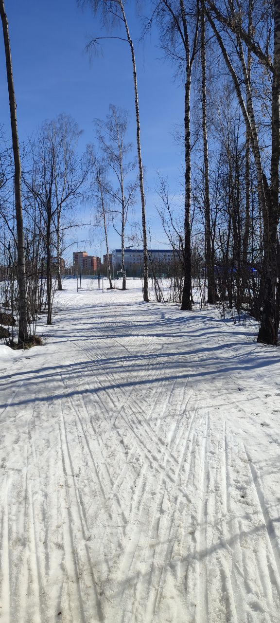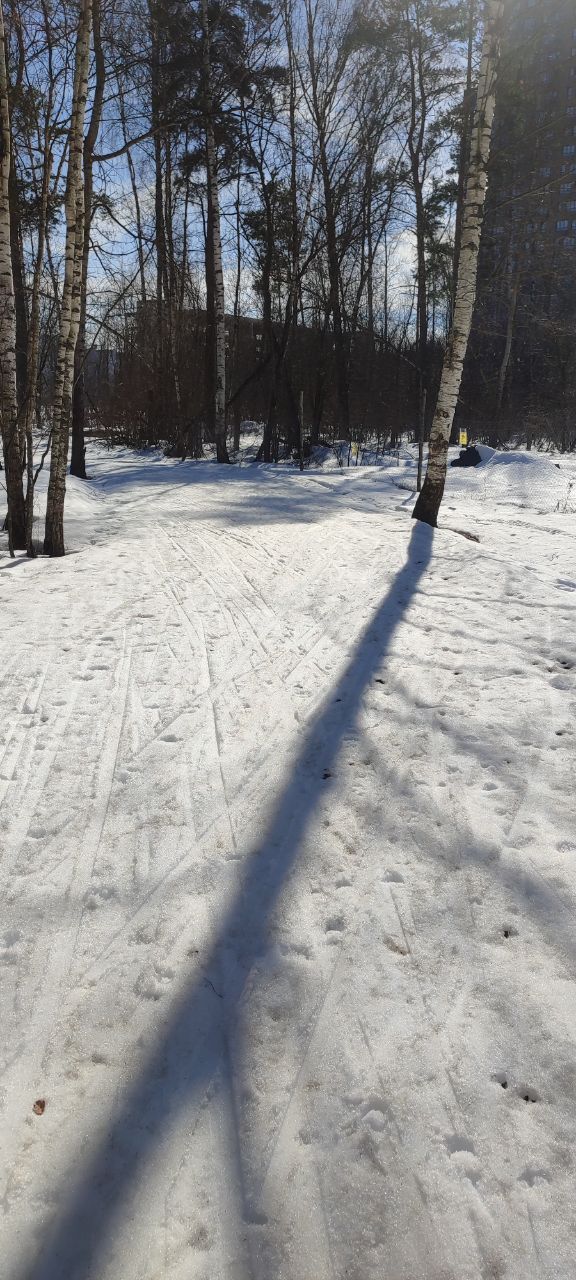 Трасса по-прежнему остаётся сложно спортивной. Неровности снега делают её ещё сложнее. Попроще участок при въезде и вдоль реки. Но не сделано замкнутого круга на этом, без сложных подъёмов на холм. Мне даже жалко любителей и детей, которые приехали покататься, а в итоге топают пешком в лыжах. Так как равнины практически нет. Мимо проносятся спортсмены, которых немало. В целом, я доволен, полтора часа накатал, технику улучшил.