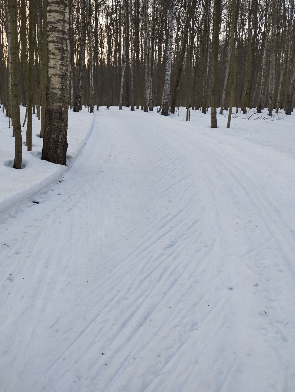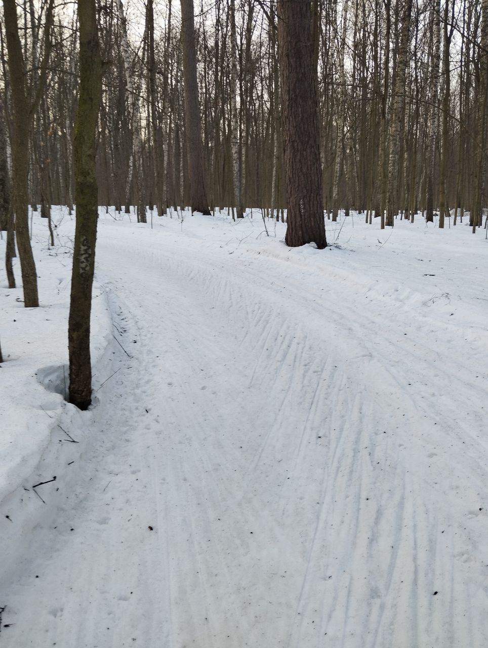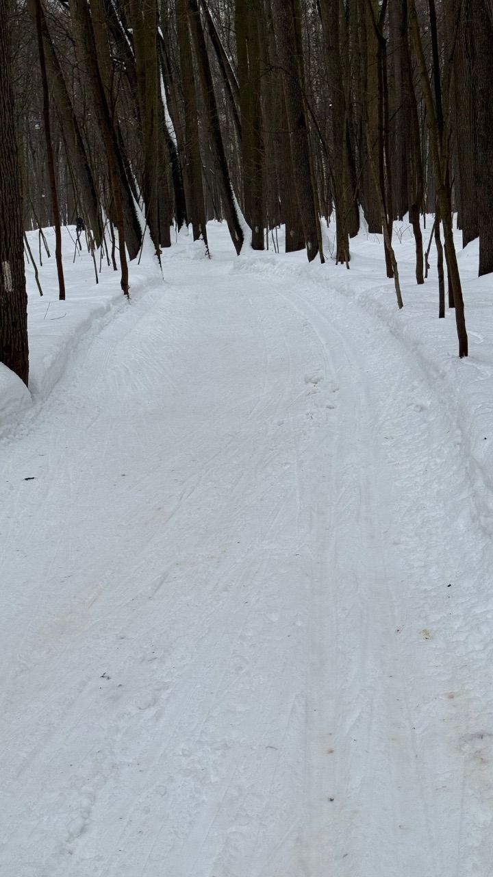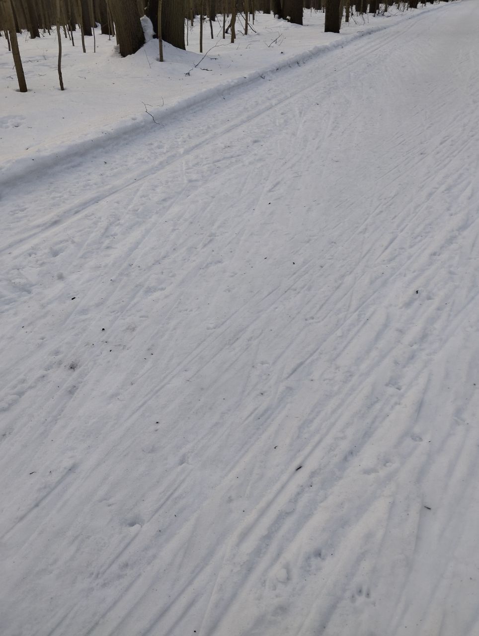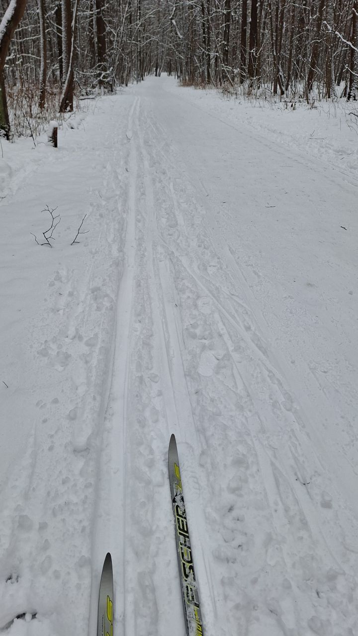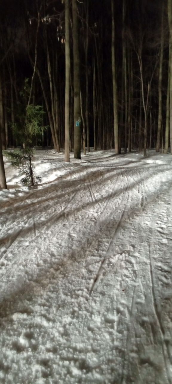 На равнине и на подьемах - везде - заснеженно, под крепления набивается снег, на равнине + укатали гуляющие огромную ложбину, так что ехать нормально невозможно. Трасса не укатана, не готова к тренировкам. Лучше воздержаться от похода в лес, чтобы не портить технику (если она конечно у вас есть), и сэкономить нервы, тк это не катание а издевательство над собой))).