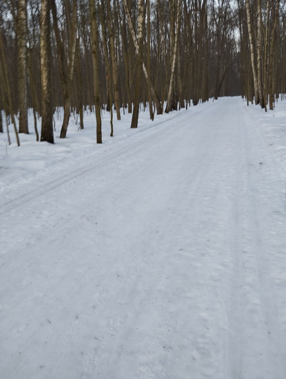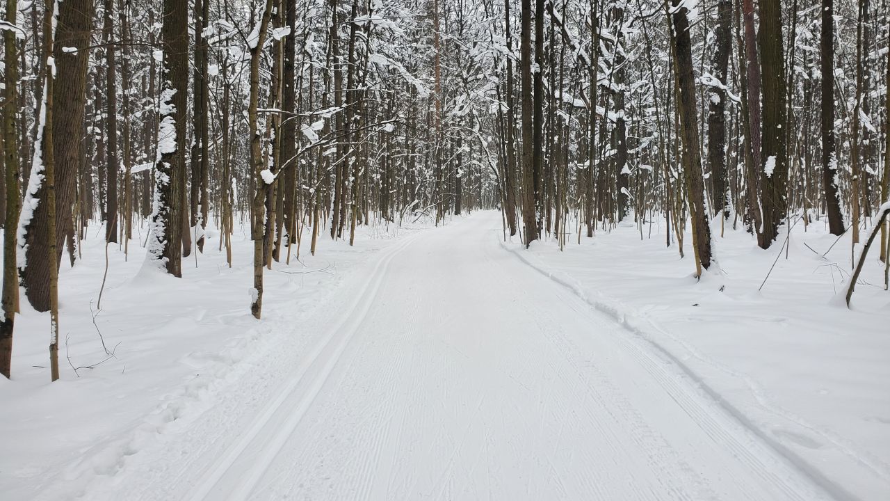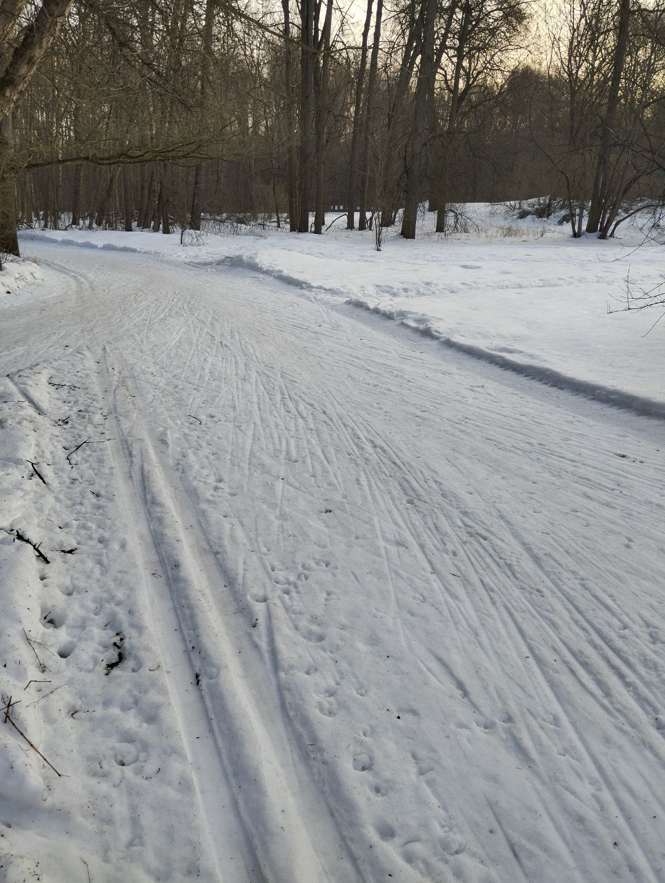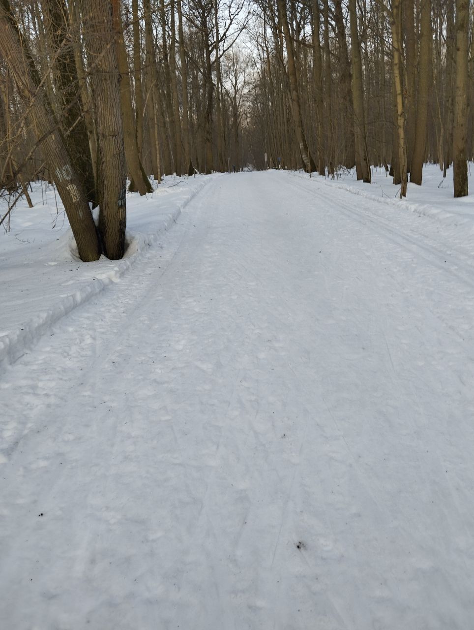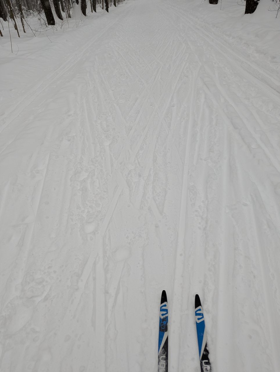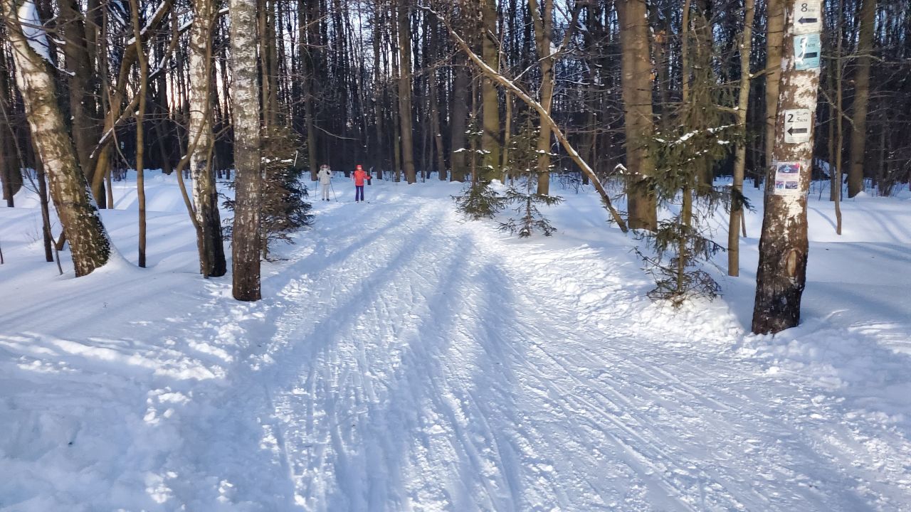 На равнине и на подьемах - везде - заснеженно, под крепления набивается снег, на равнине + укатали гуляющие огромную ложбину, так что ехать нормально невозможно. Трасса не укатана, не готова к тренировкам. Лучше воздержаться от похода в лес, чтобы не портить технику (если она конечно у вас есть), и сэкономить нервы, тк это не катание а издевательство над собой))).