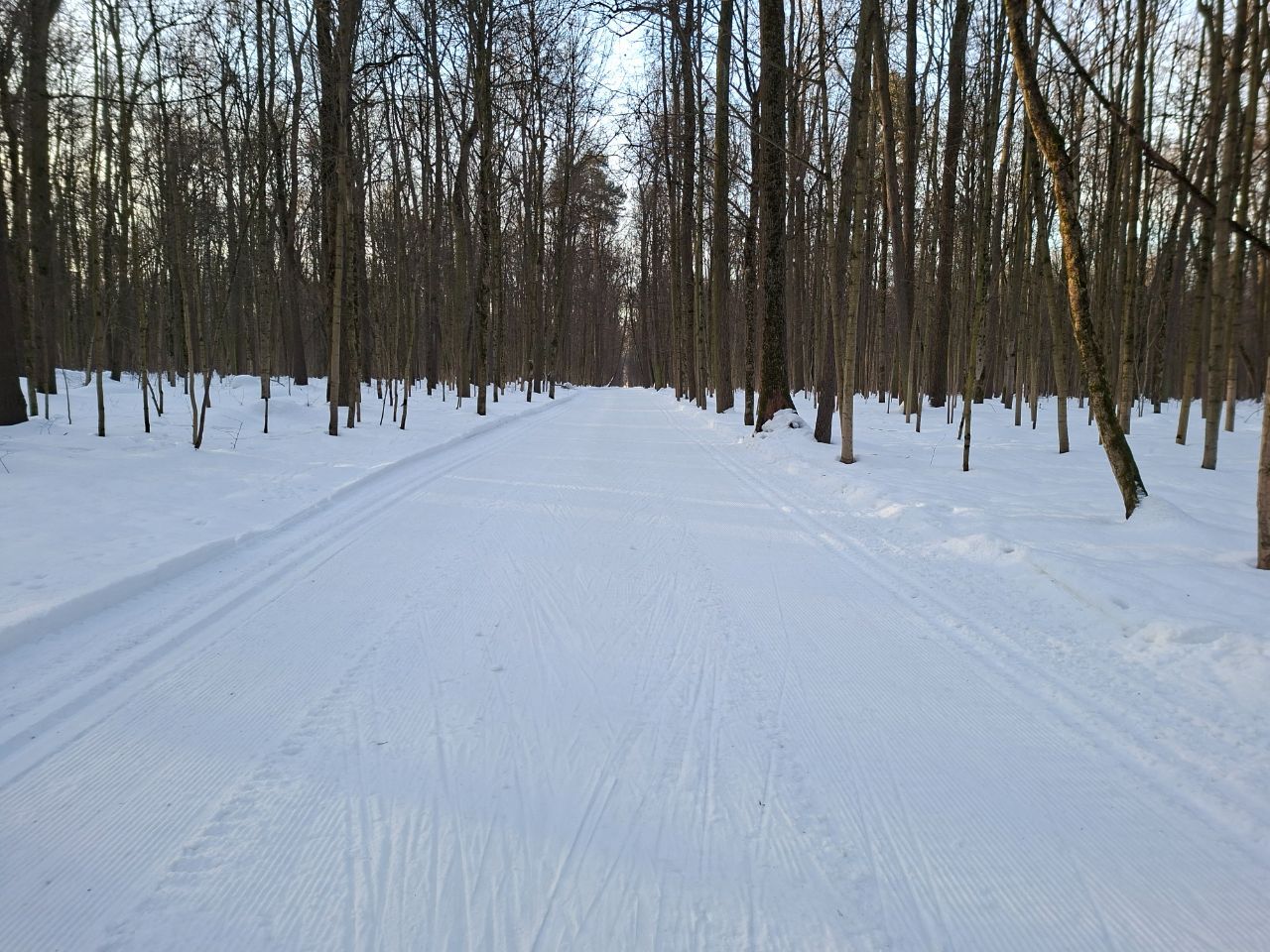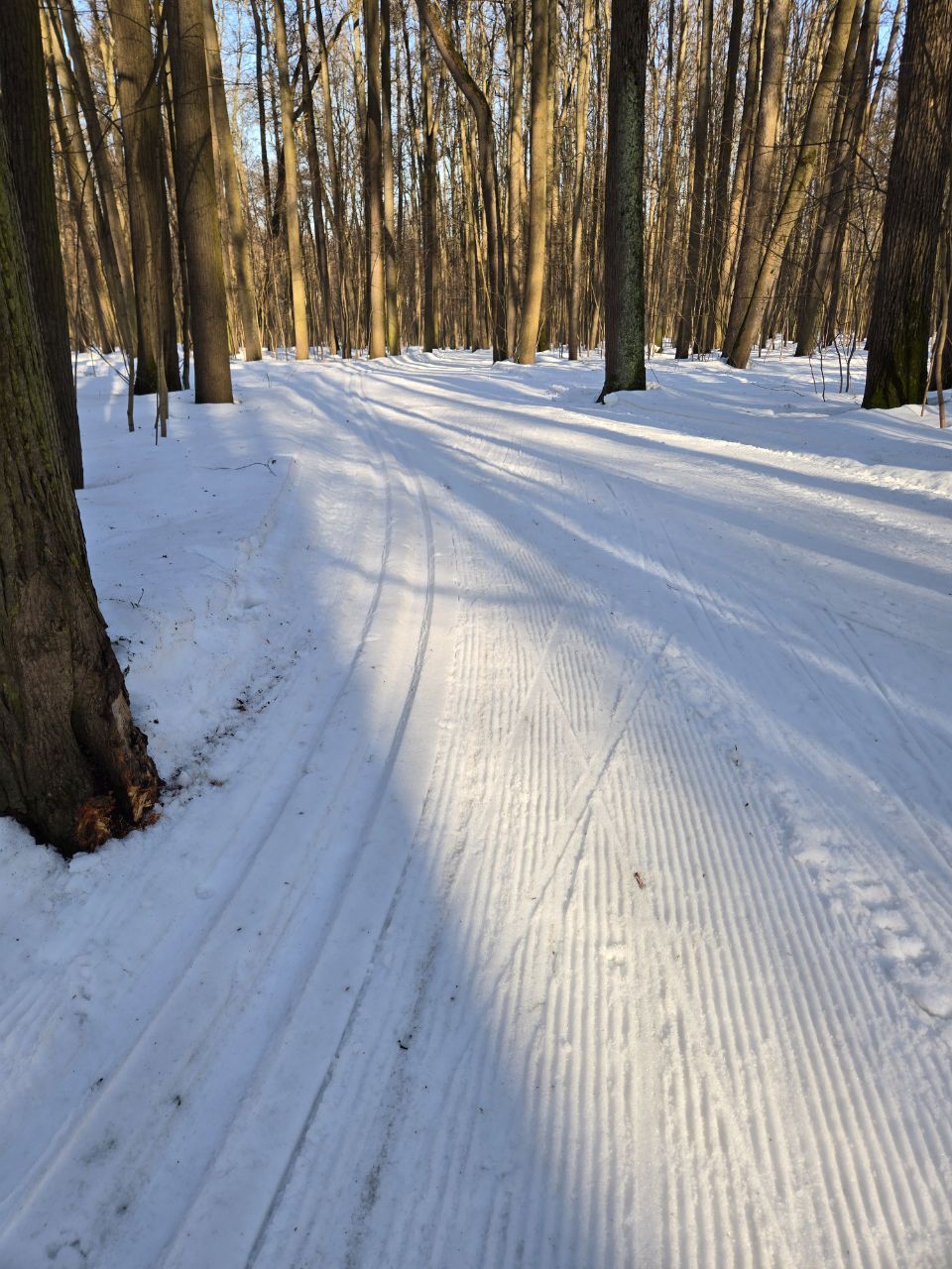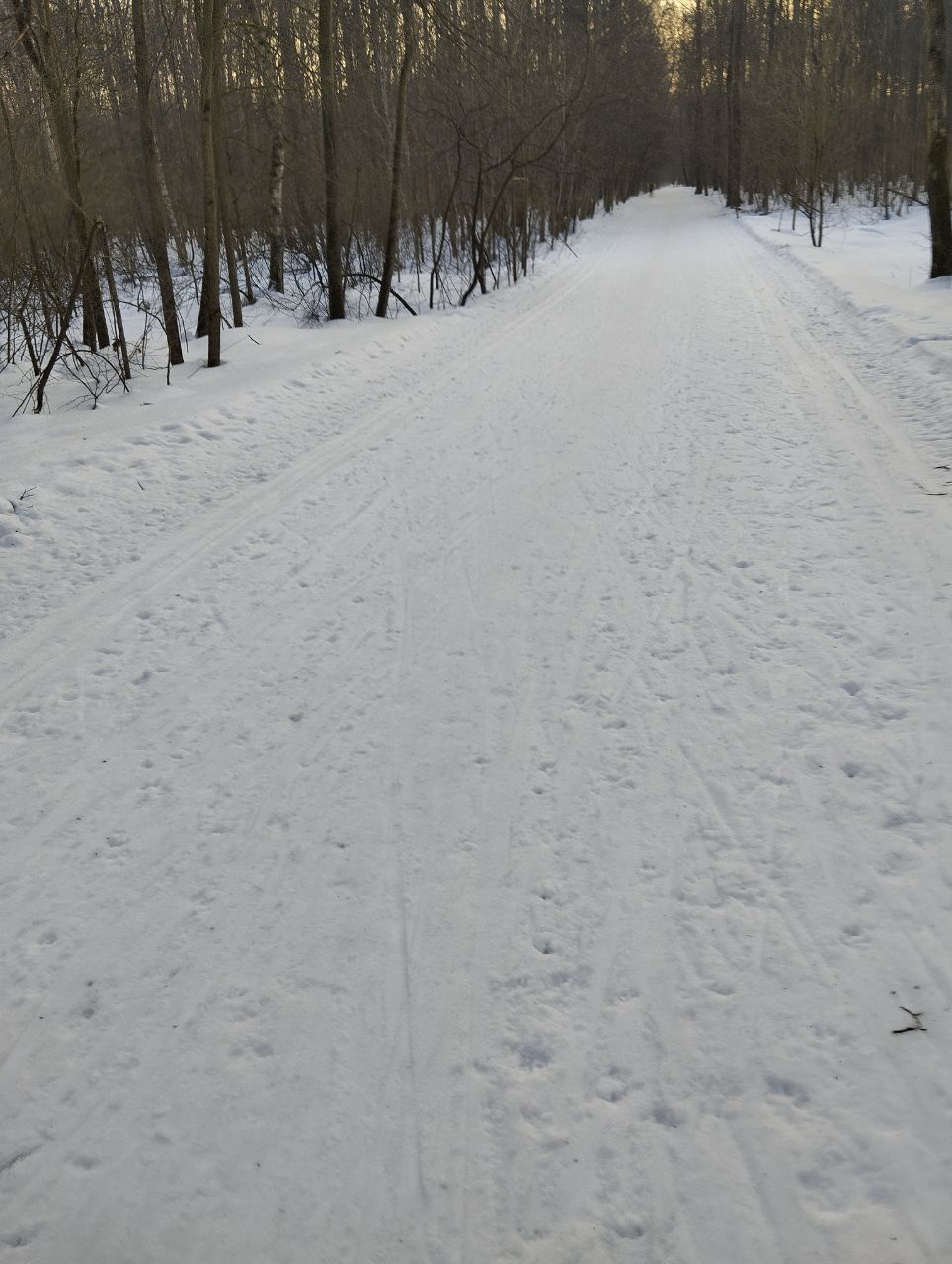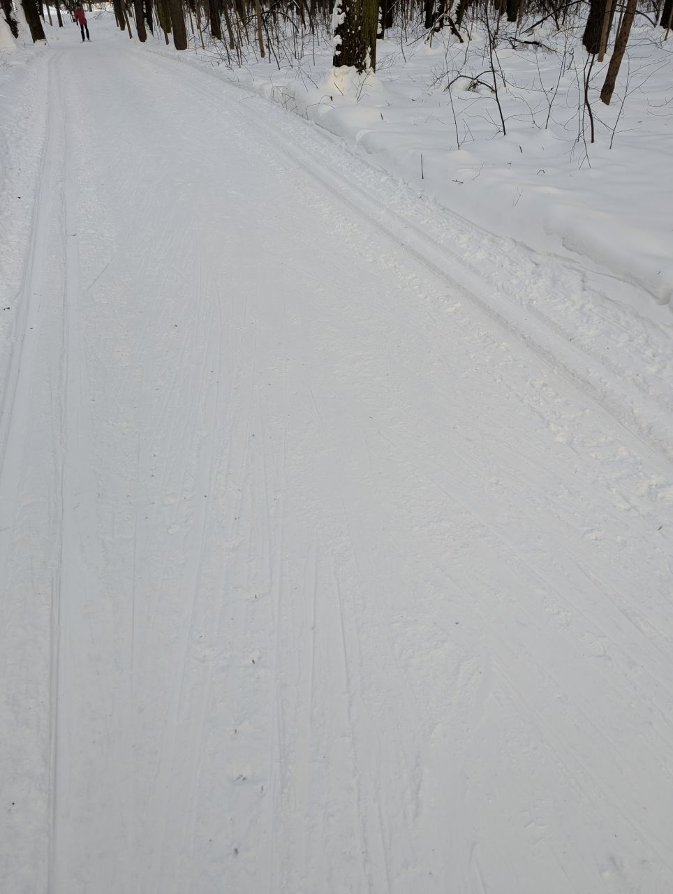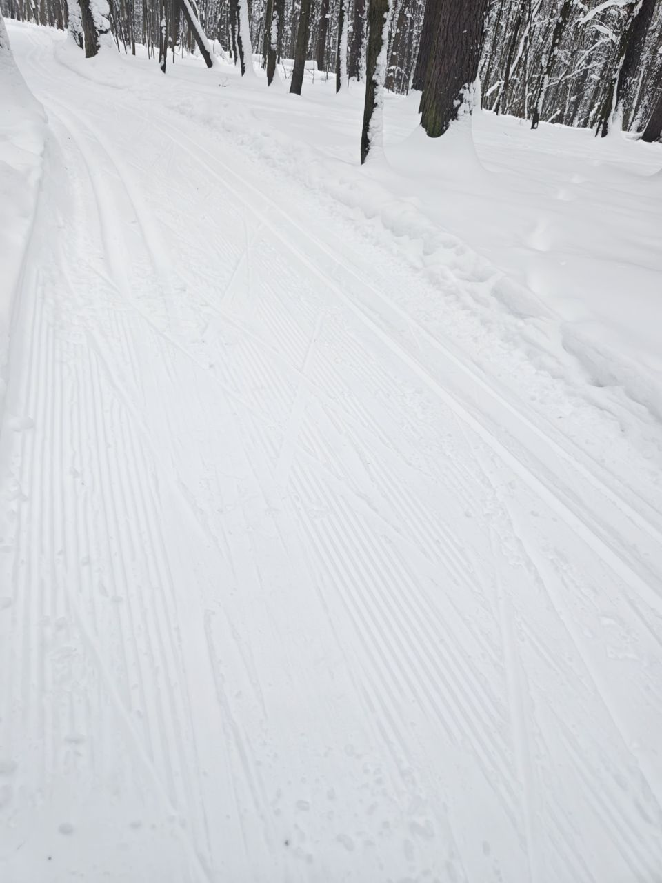 На равнине и на подьемах - везде - заснеженно, под крепления набивается снег, на равнине + укатали гуляющие огромную ложбину, так что ехать нормально невозможно. Трасса не укатана, не готова к тренировкам. Лучше воздержаться от похода в лес, чтобы не портить технику (если она конечно у вас есть), и сэкономить нервы, тк это не катание а издевательство над собой))).
