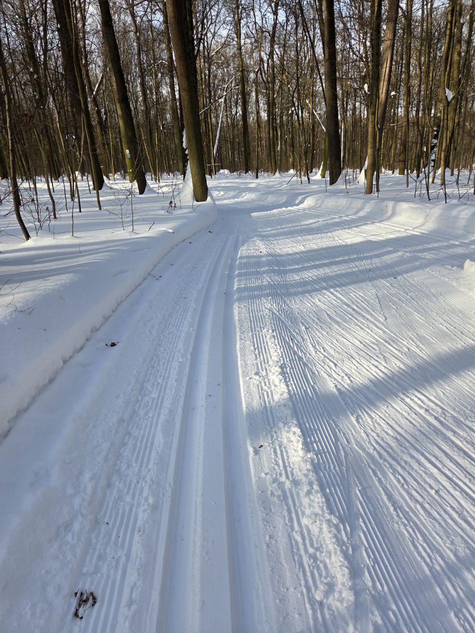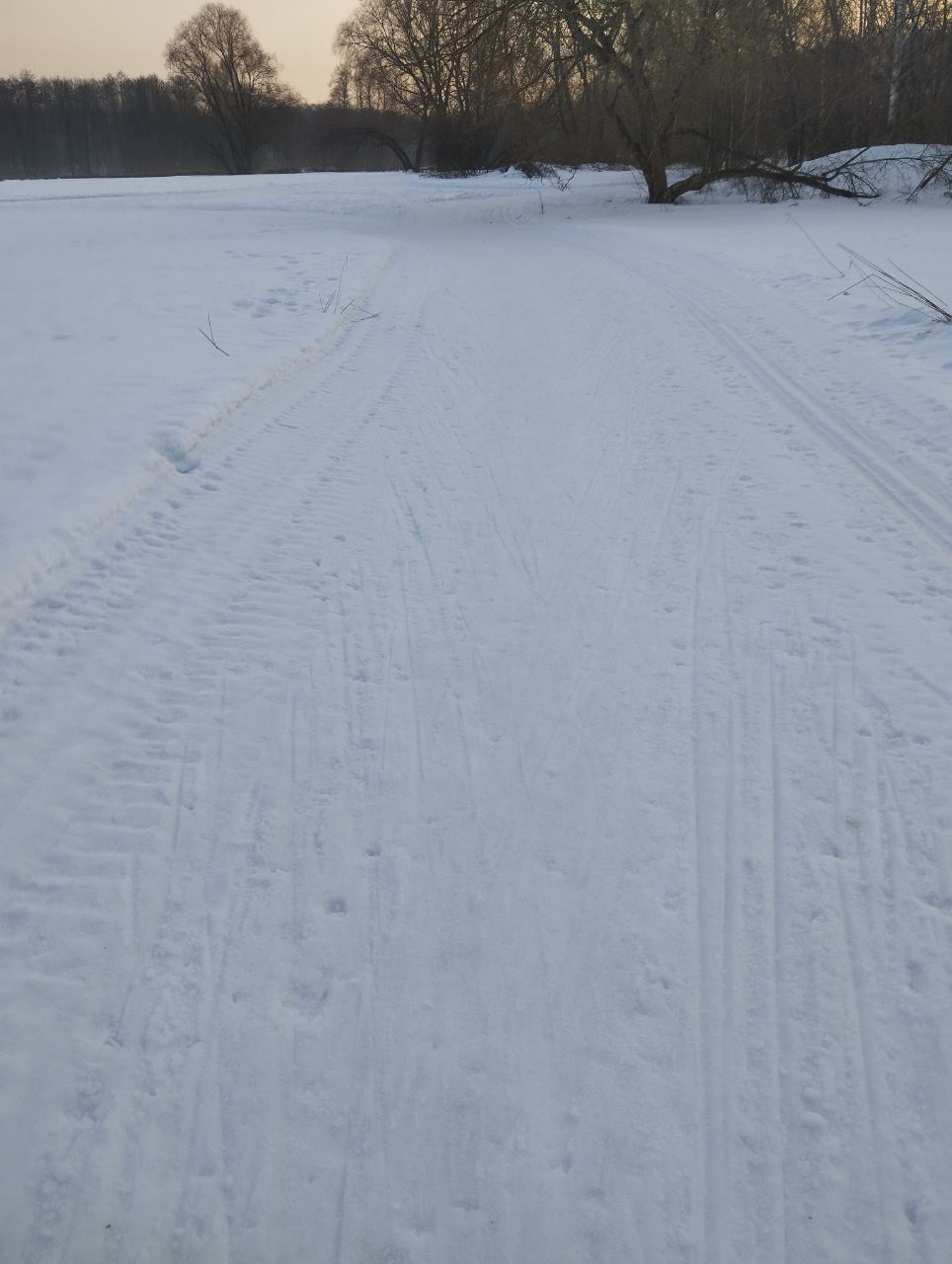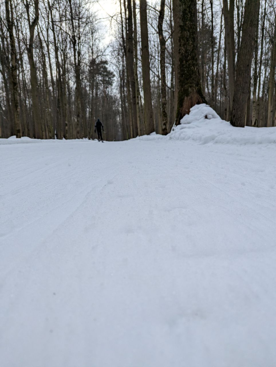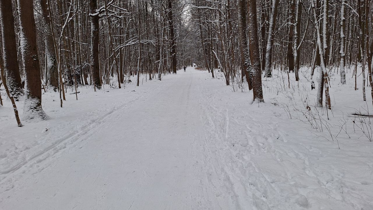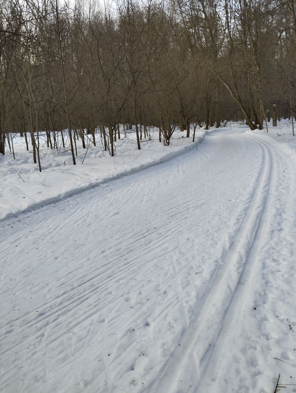 На равнине и на подьемах - везде - заснеженно, под крепления набивается снег, на равнине + укатали гуляющие огромную ложбину, так что ехать нормально невозможно. Трасса не укатана, не готова к тренировкам. Лучше воздержаться от похода в лес, чтобы не портить технику (если она конечно у вас есть), и сэкономить нервы, тк это не катание а издевательство над собой))).