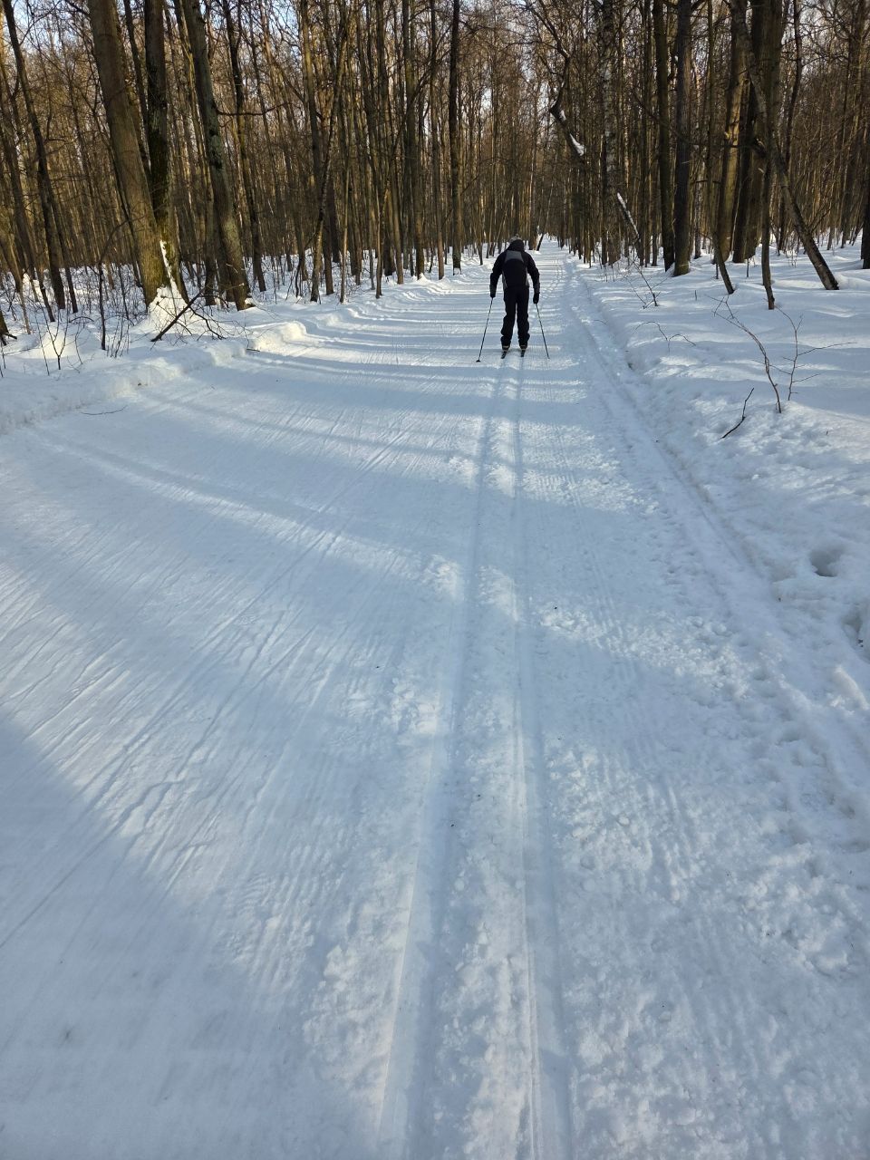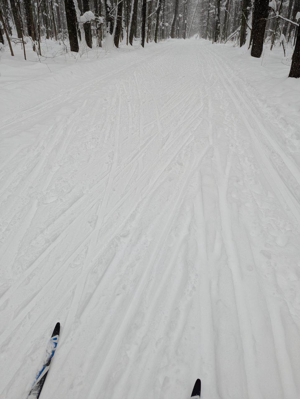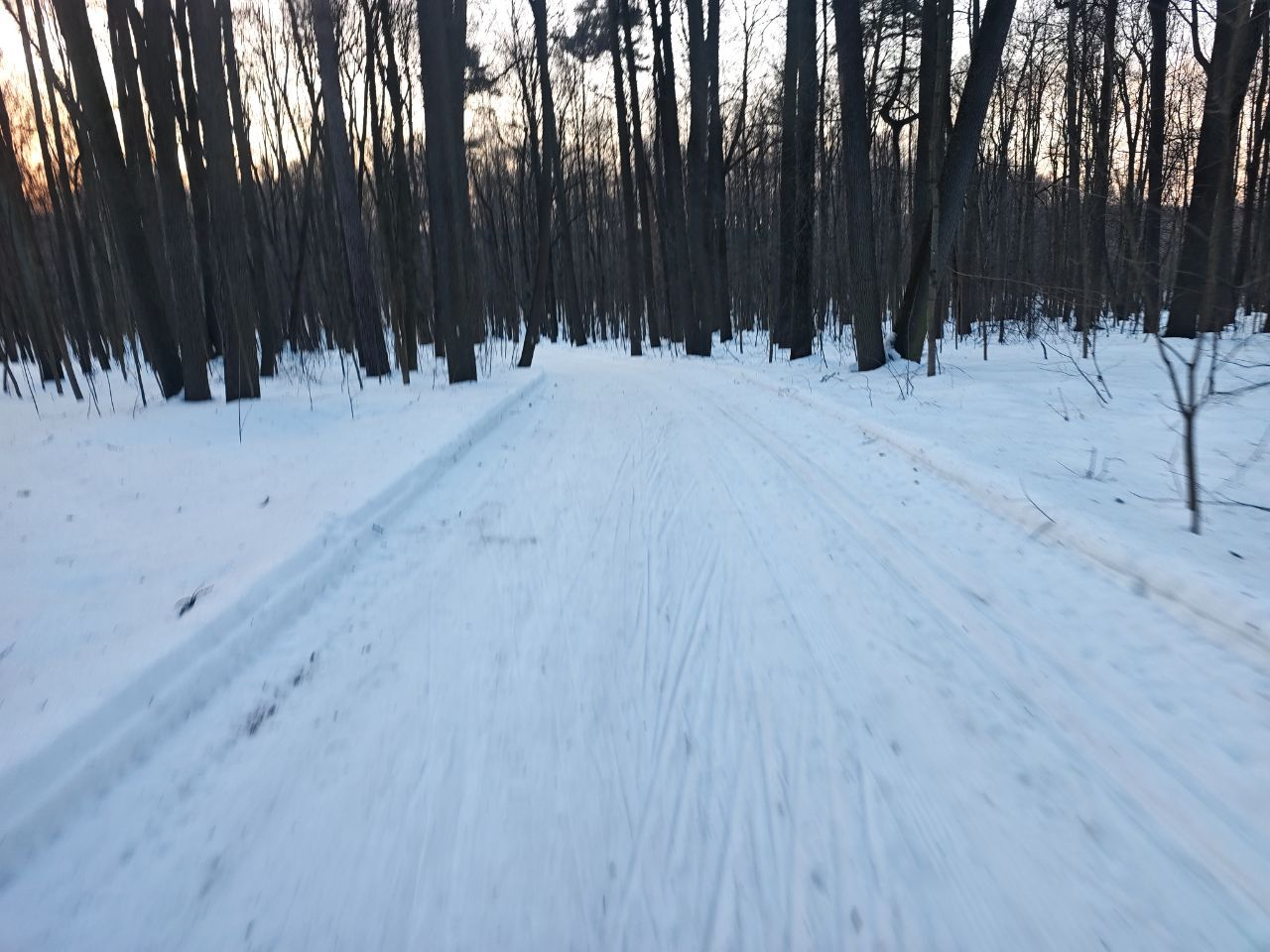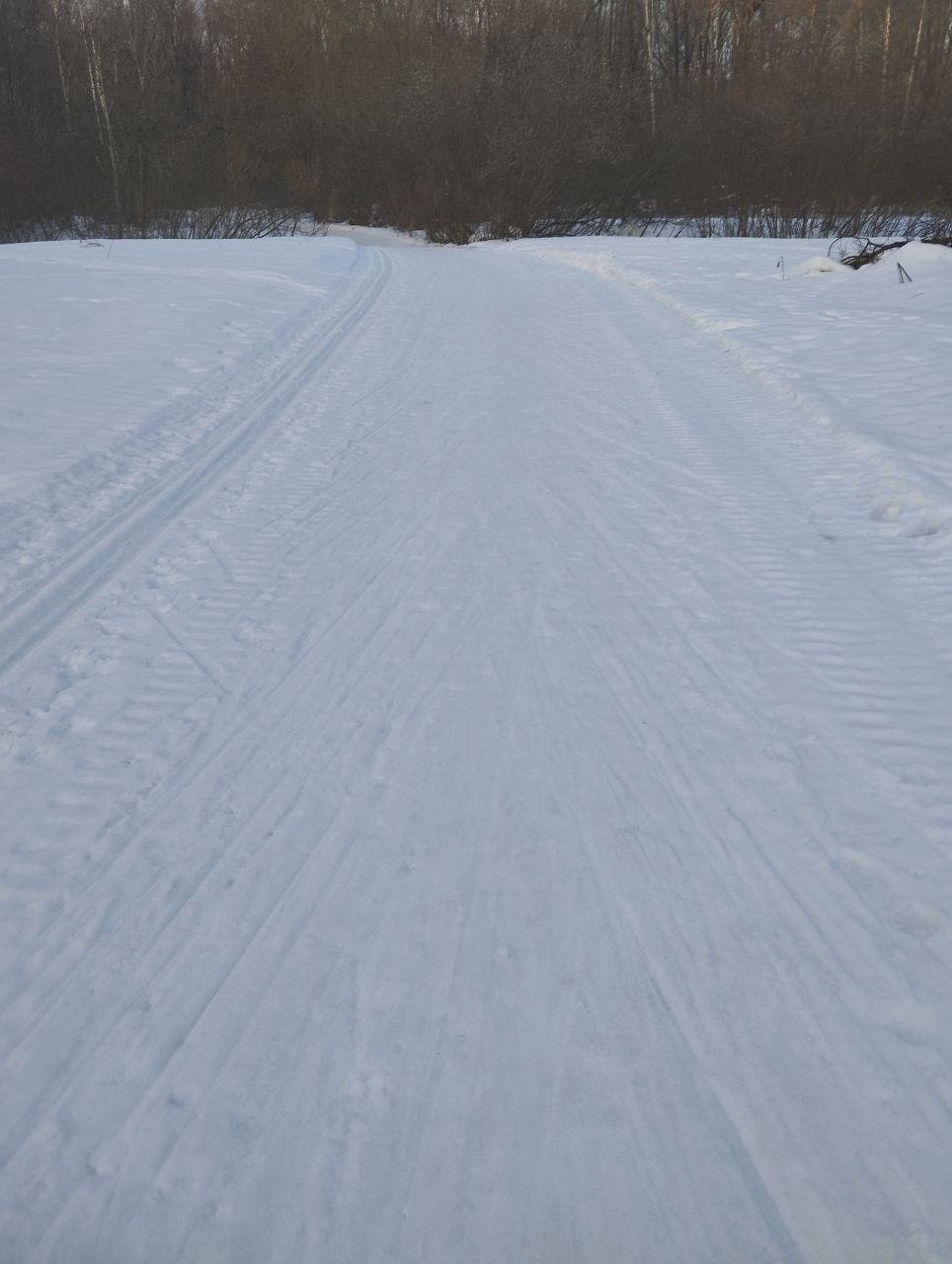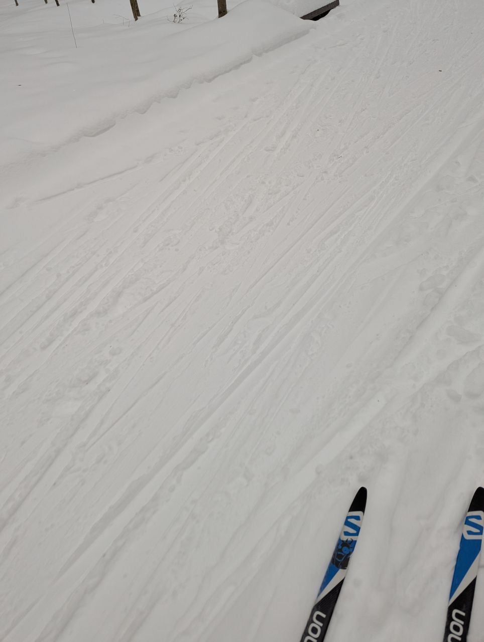 На равнине и на подьемах - везде - заснеженно, под крепления набивается снег, на равнине + укатали гуляющие огромную ложбину, так что ехать нормально невозможно. Трасса не укатана, не готова к тренировкам. Лучше воздержаться от похода в лес, чтобы не портить технику (если она конечно у вас есть), и сэкономить нервы, тк это не катание а издевательство над собой))).