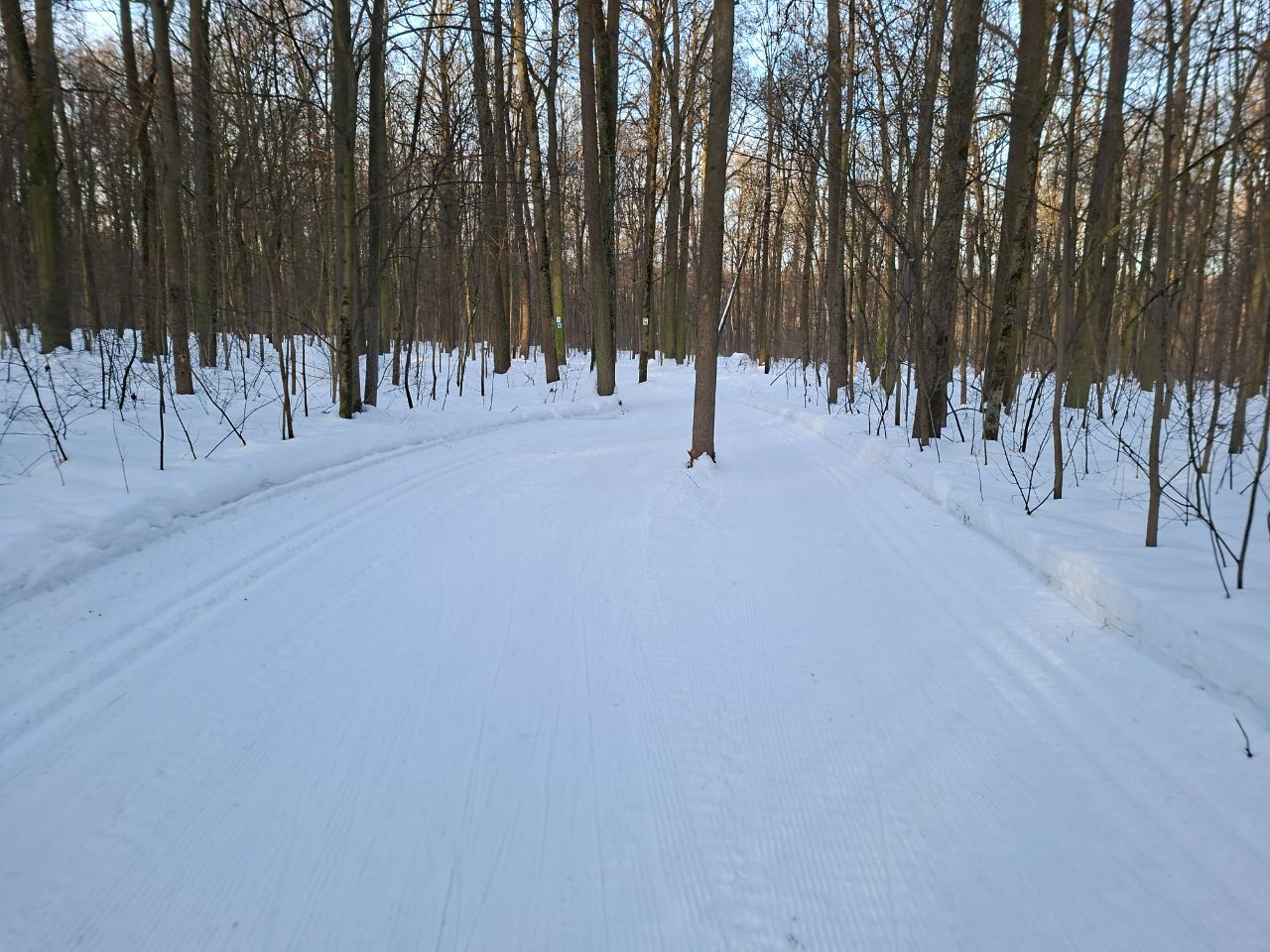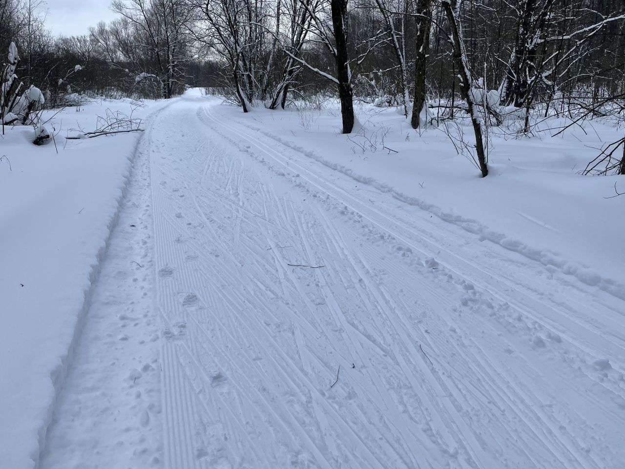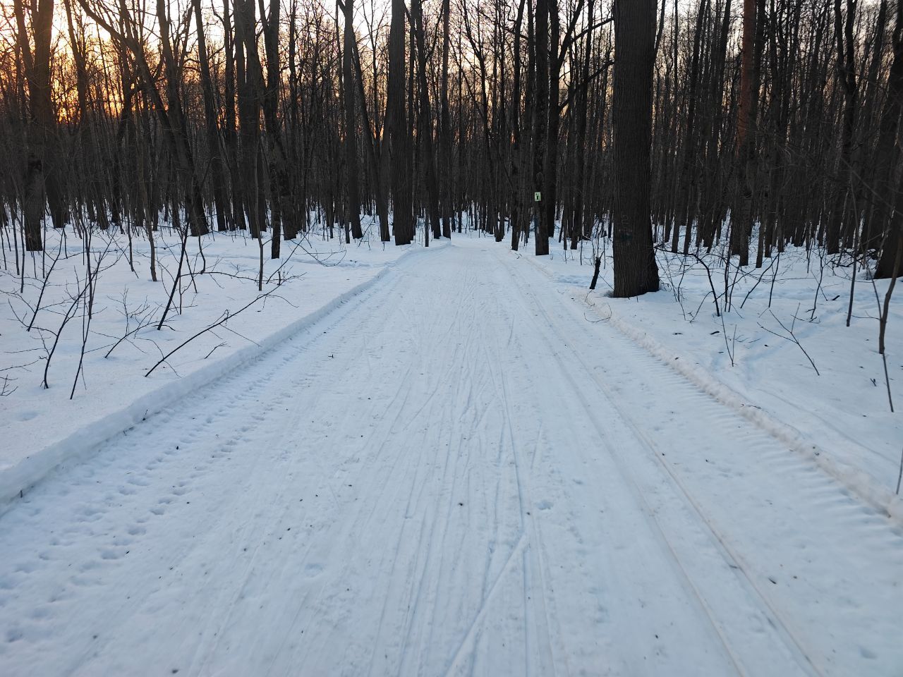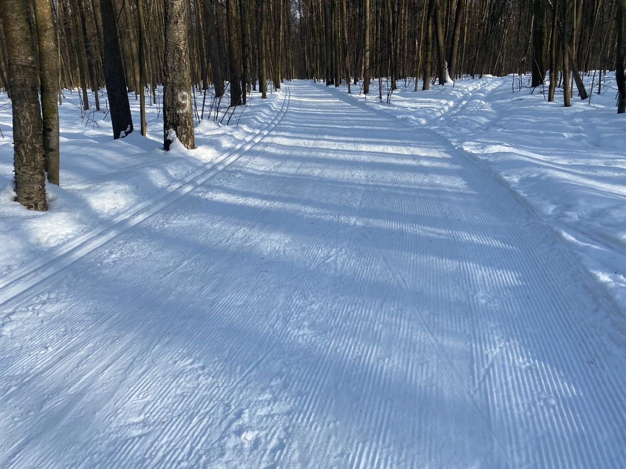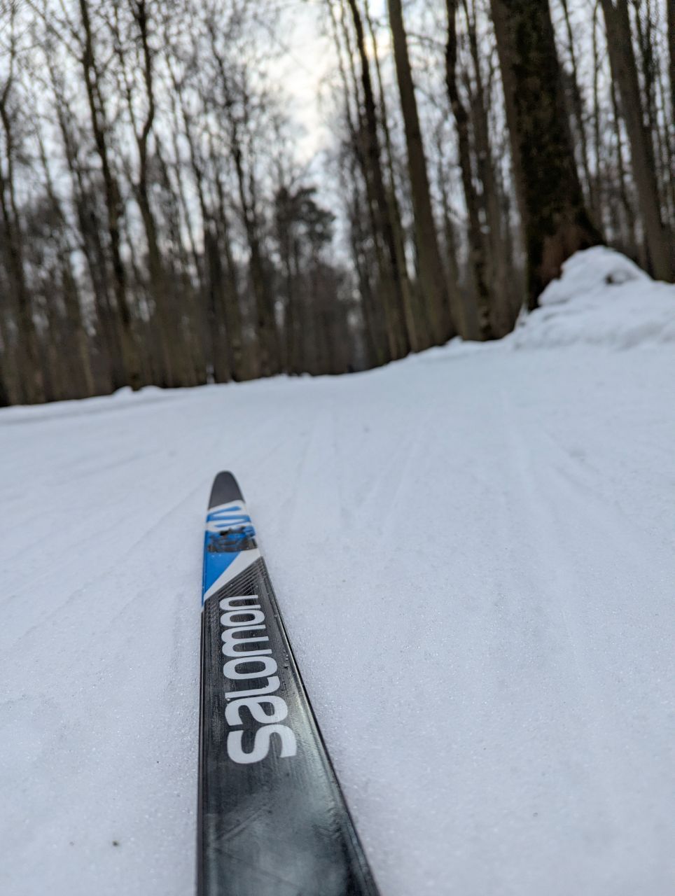 На равнине и на подьемах - везде - заснеженно, под крепления набивается снег, на равнине + укатали гуляющие огромную ложбину, так что ехать нормально невозможно. Трасса не укатана, не готова к тренировкам. Лучше воздержаться от похода в лес, чтобы не портить технику (если она конечно у вас есть), и сэкономить нервы, тк это не катание а издевательство над собой))).
