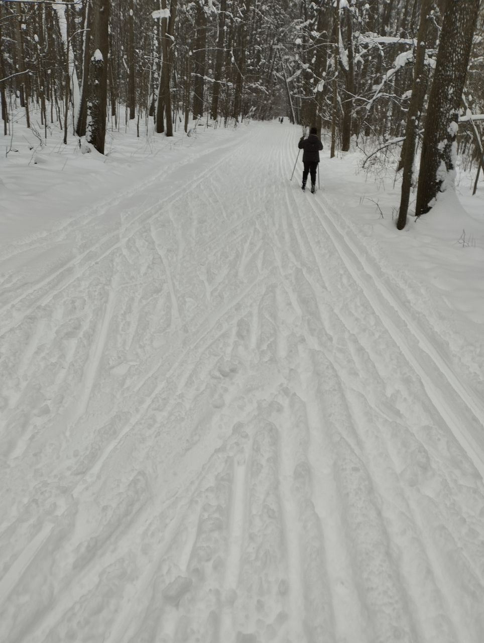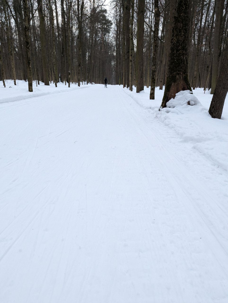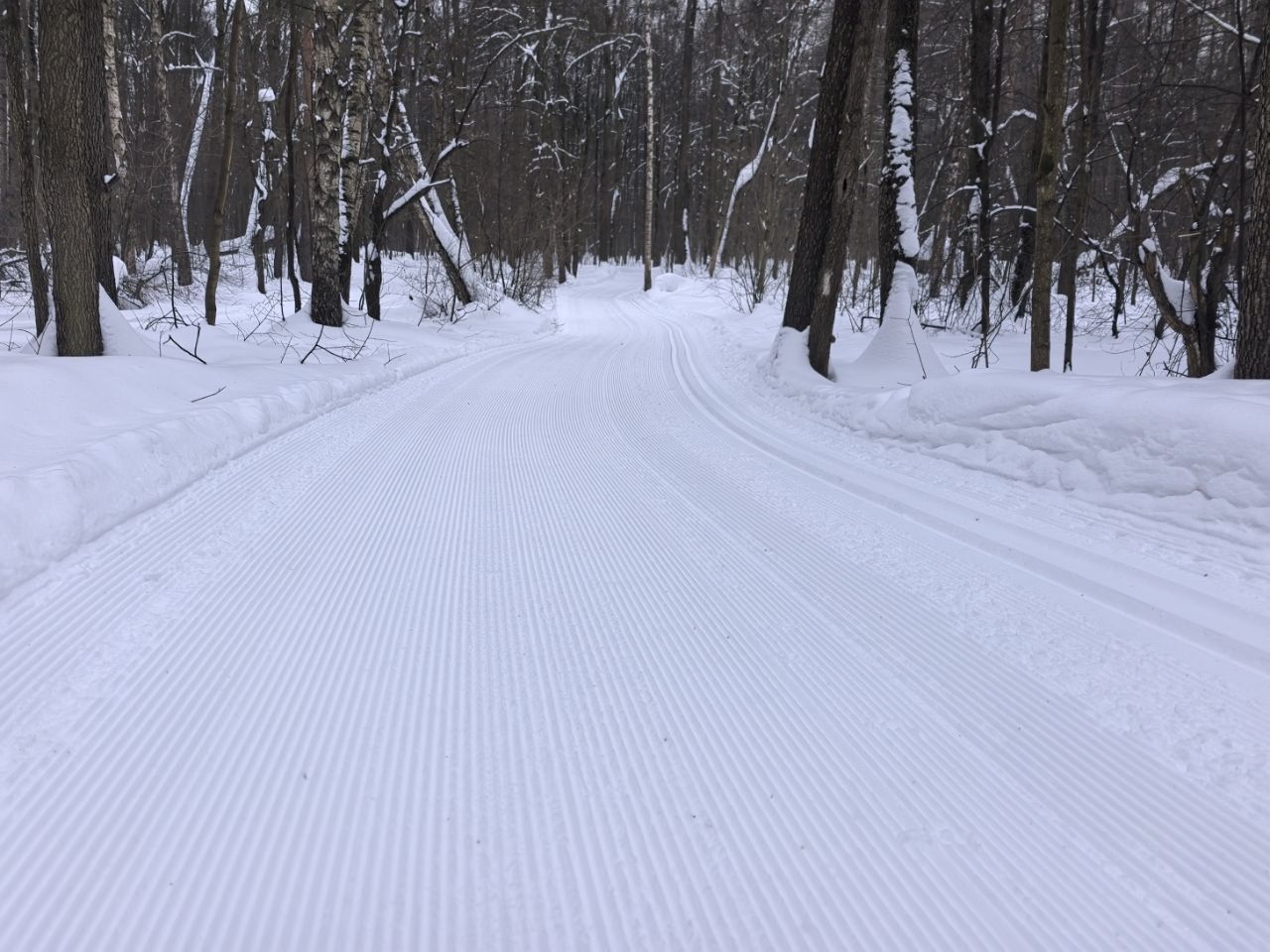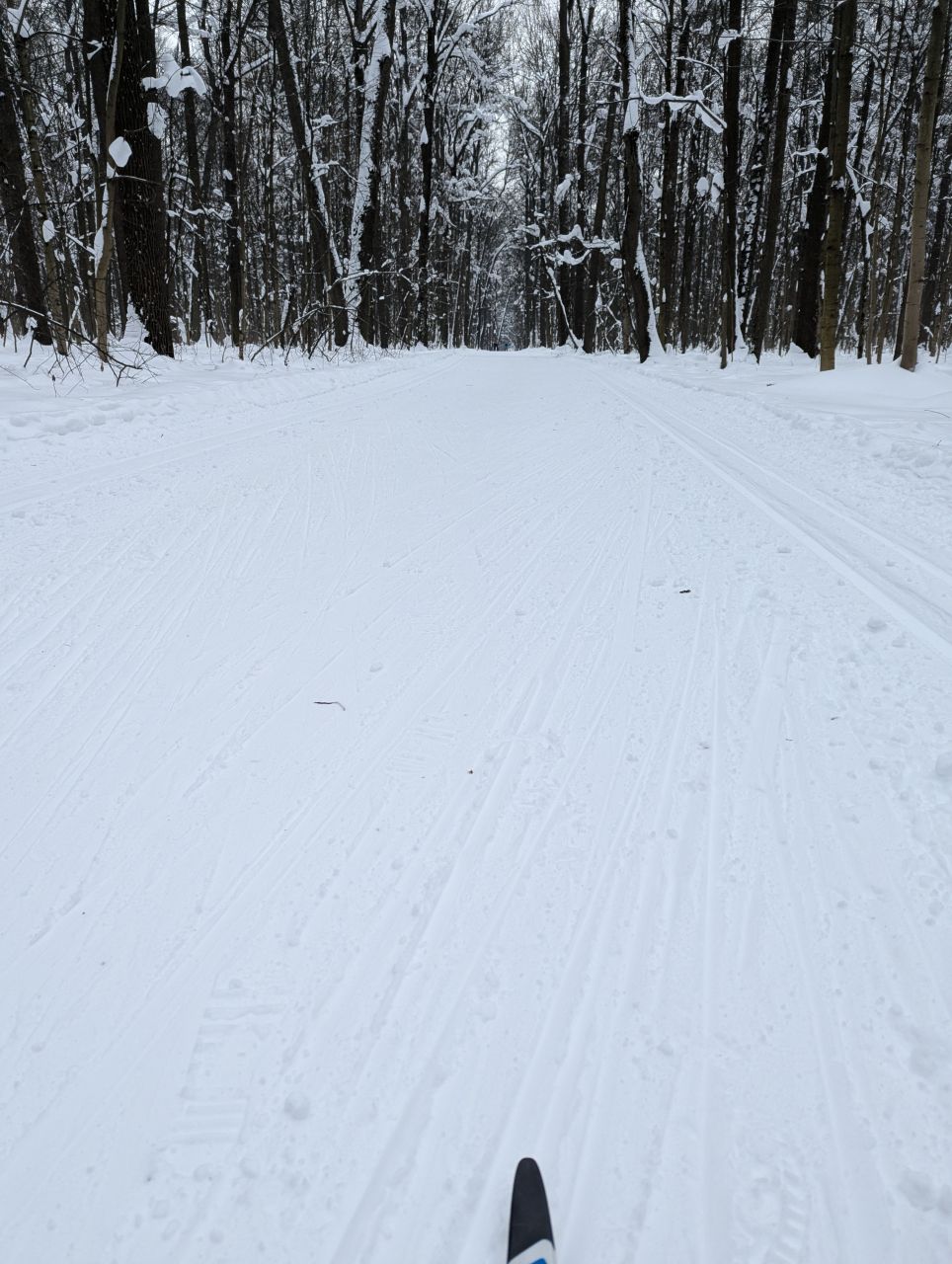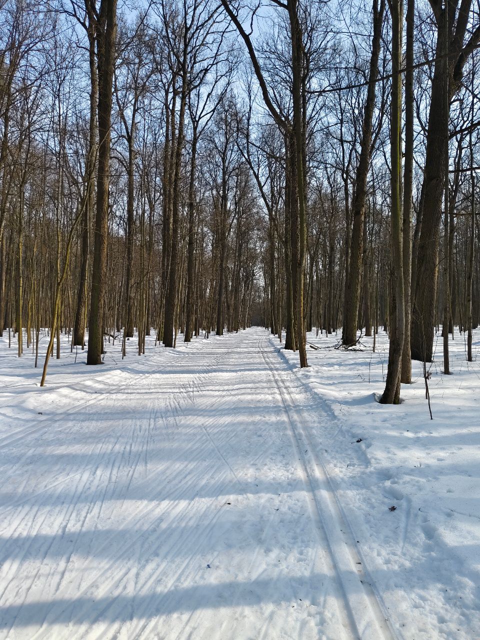 На равнине и на подьемах - везде - заснеженно, под крепления набивается снег, на равнине + укатали гуляющие огромную ложбину, так что ехать нормально невозможно. Трасса не укатана, не готова к тренировкам. Лучше воздержаться от похода в лес, чтобы не портить технику (если она конечно у вас есть), и сэкономить нервы, тк это не катание а издевательство над собой))).